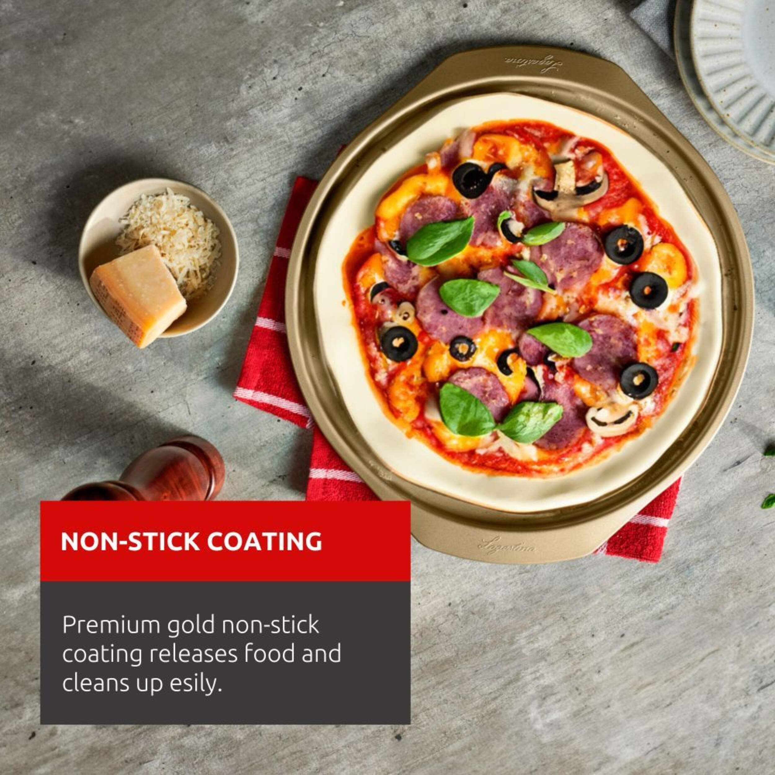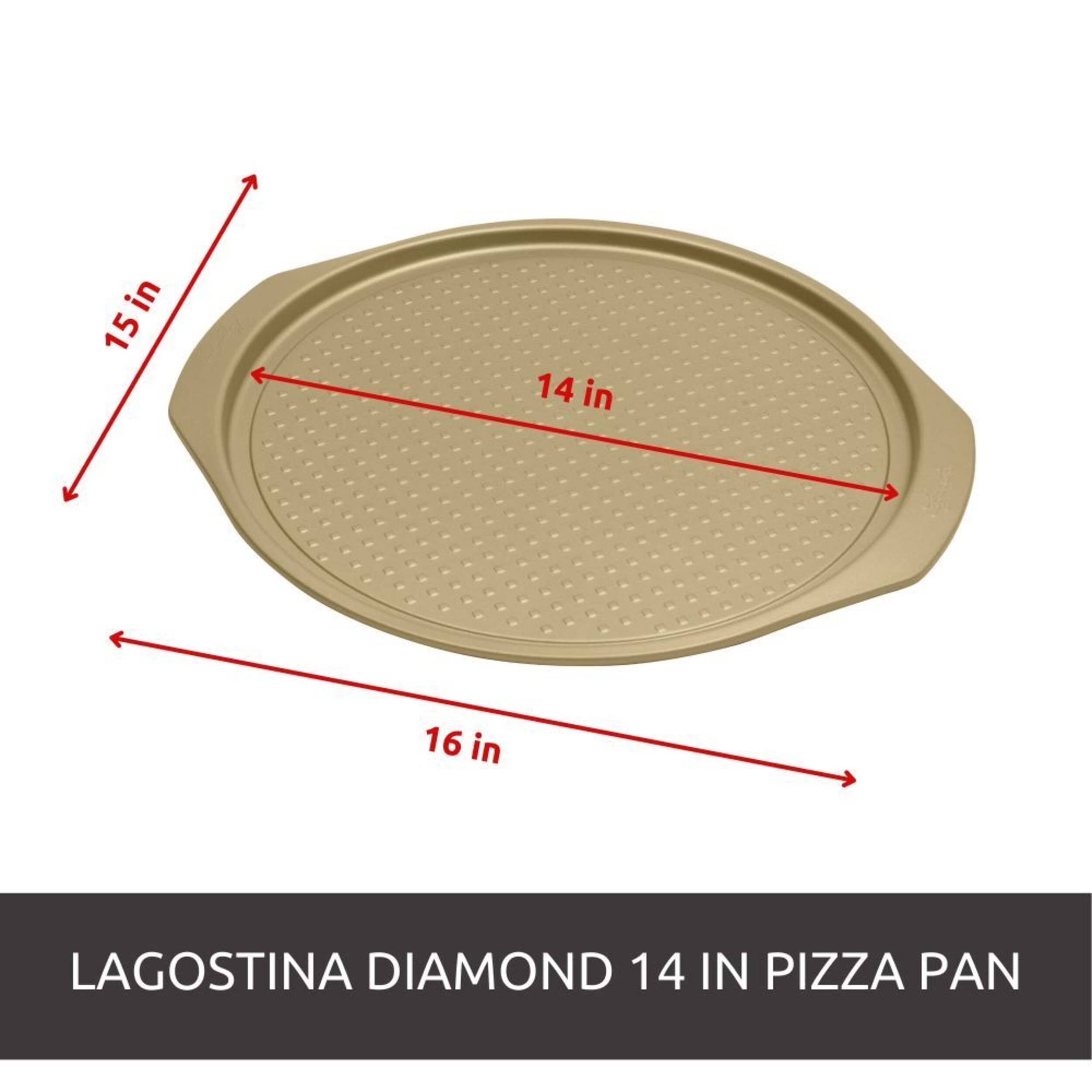 Making pizza at home means having it your way with the Lagostina Diamond pizza pan. Turn out great custom pies with this heavy-gauge steel cookware made to withstand heat and deliver perfectly baked pizza in the classic tradition. This round, non-stick pan features a raised diamond-textured surface that increases airflow for consistent results. Food releases easily and the pan cleans up in the dishwasher for the ultimate in convenience.