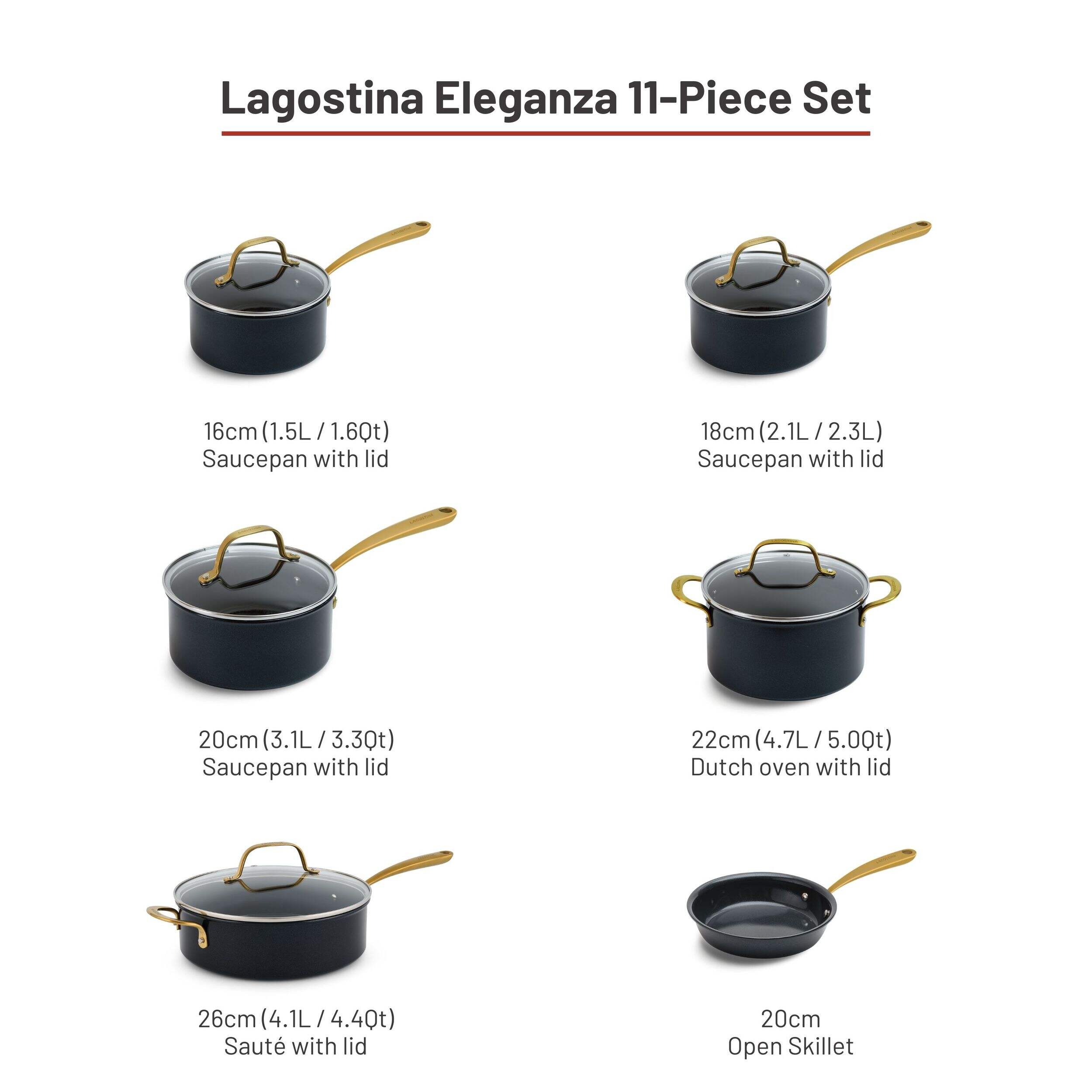 Set Composition:16cm Sauce w/ lid, 18cm Sauce w/ lid, 20cm Sauce w/ lid, 22cm Dutch Oven w/ lid, 20cm Skillet, 26 cm Sauté w/ lid
