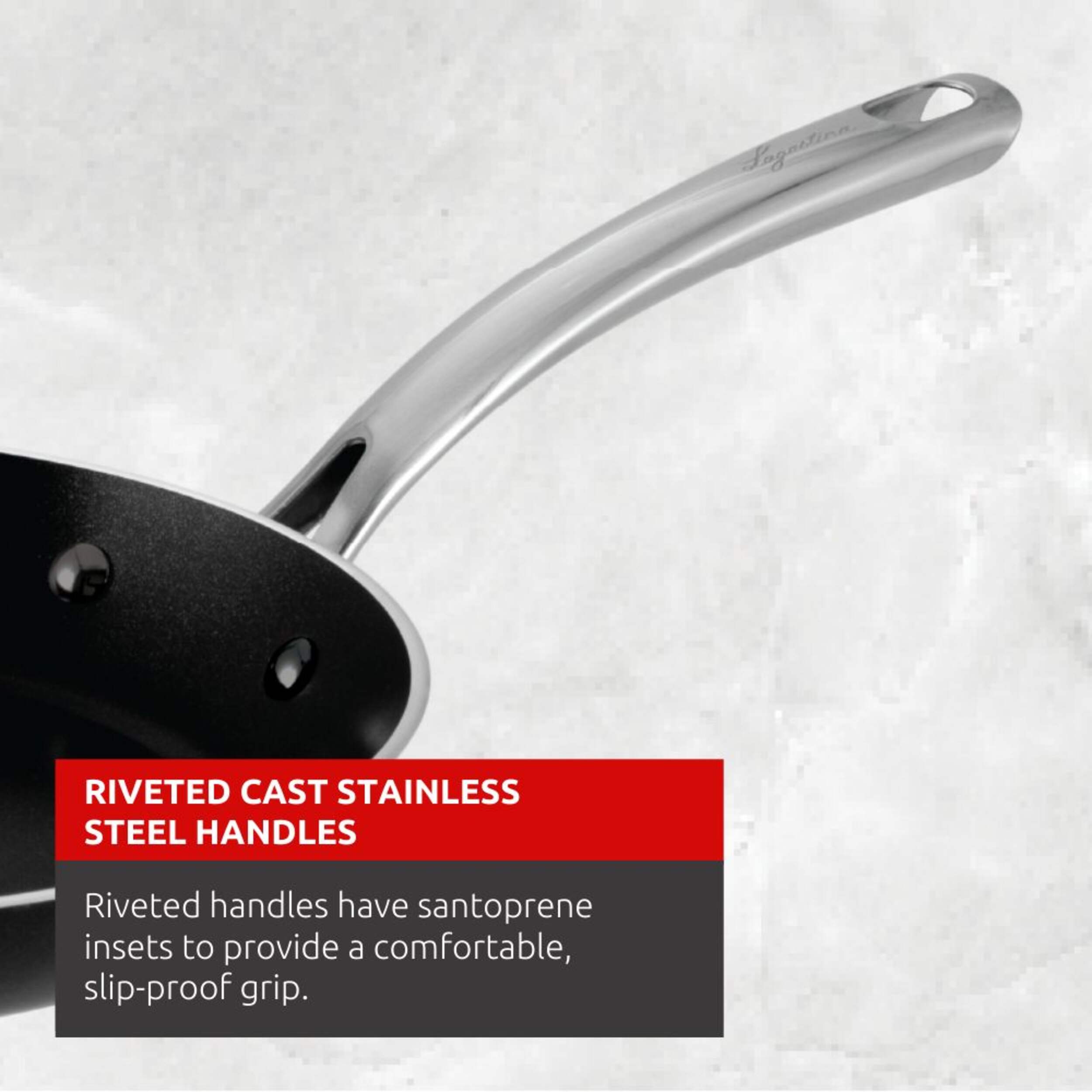 RIVETED STAINLESS STEEL HANDLES: Ergonomically designed riveted stainless handles fit comfortably in your hand