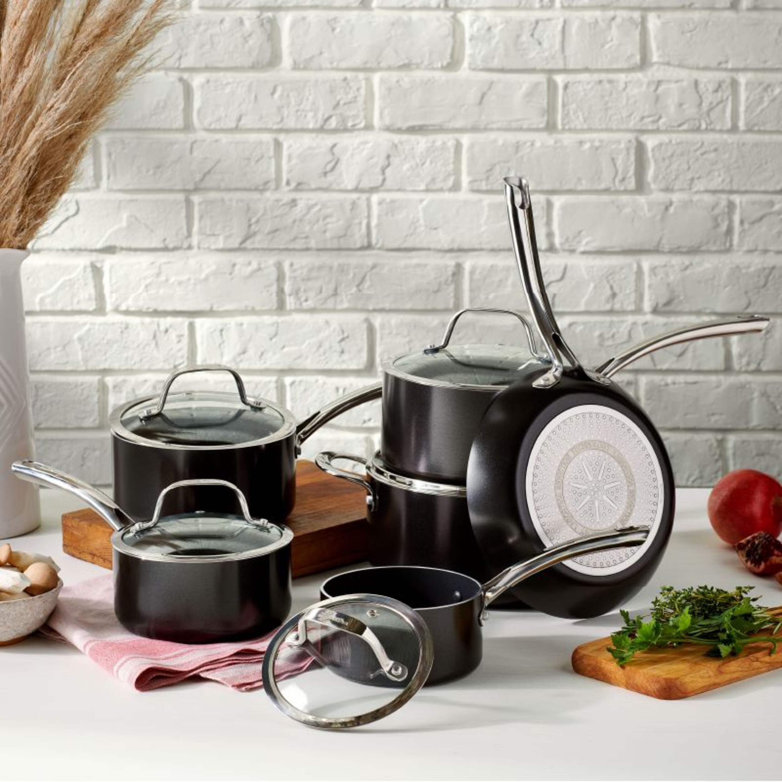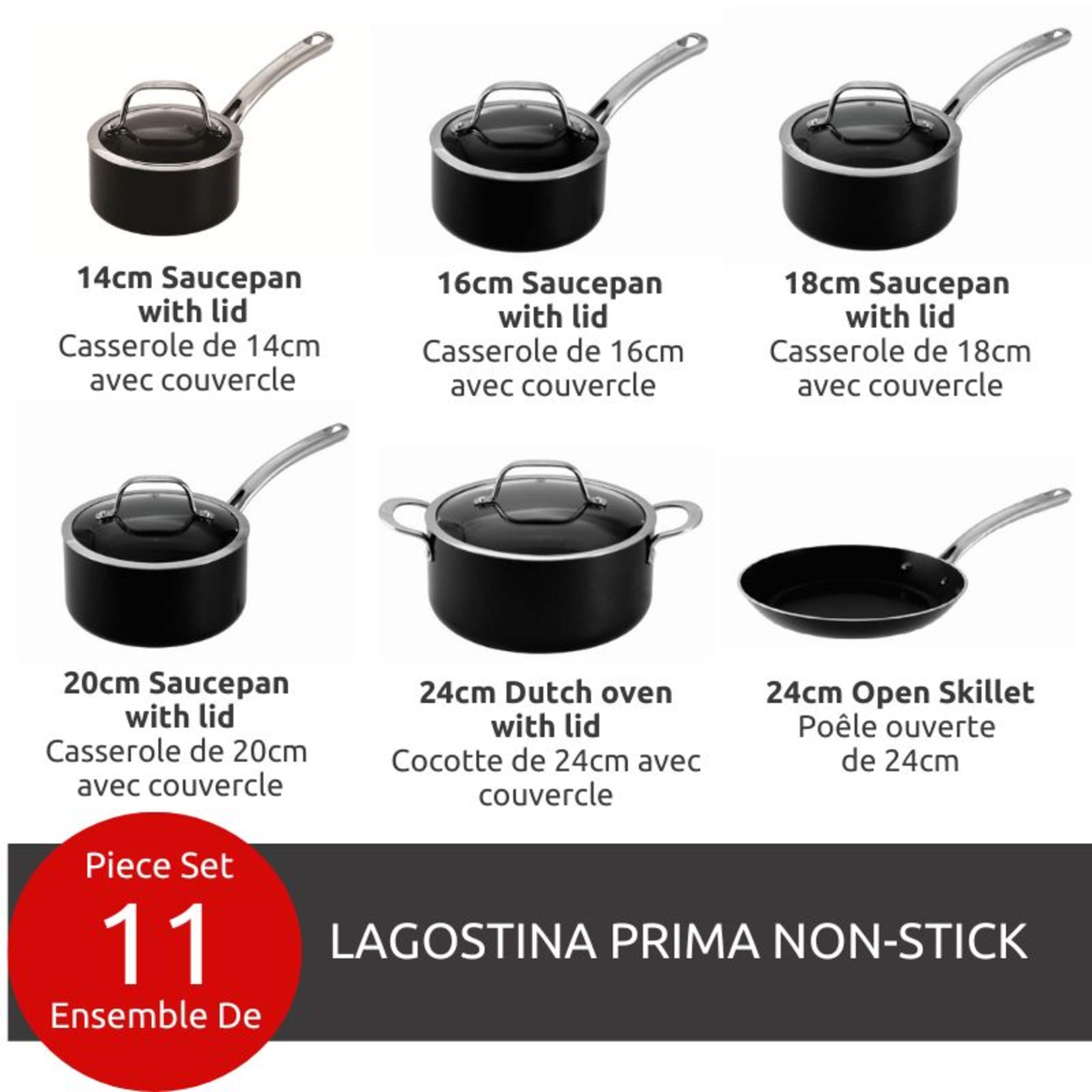 Here is a cookware that can take the heat while still adding a touch of Italian elegance to your kitchen! The Lagostina Prima Aluminum Non-Stick 11 piece set comes with an advanced 3-layer, non-stick PTFE interior coating, which allows for effortless food release and easy clean up. Boasting a beautiful belly shape with a satin finish, this set is not only is a treat to cook with, it also looks great in your kitchen. Ergonomically designed riveted stainless handles fit comfortably in your hand. Tempered glass lids provide see-through convenience to monitor your cooking progress. Dishwasher safe and easy to clean, the set is also oven safe and compatible with all cooking surfaces including induction. Built to stand the test of time, its pressed aluminum construction provides durability for long lasting use.