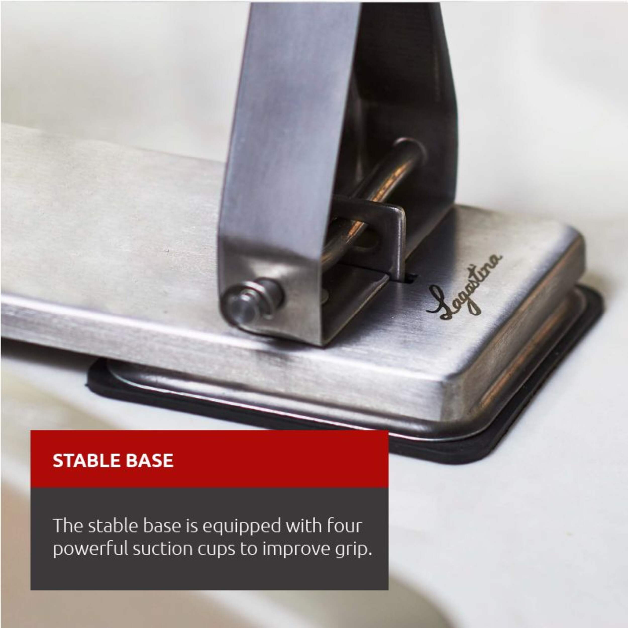 Create restaurant-quality dishes at home with the Lagostina stainless steel spiralizer. With its high quality stainless steel construction for durability and its stable base with four powerful suction cups to improve grip, this user-friendly product can be operated from one hand. It comes with three interchangeable blades for shredding and spiralizing fruits and vegetables. The preparation of fruits and veggies will be easier and more pleasant than ever!