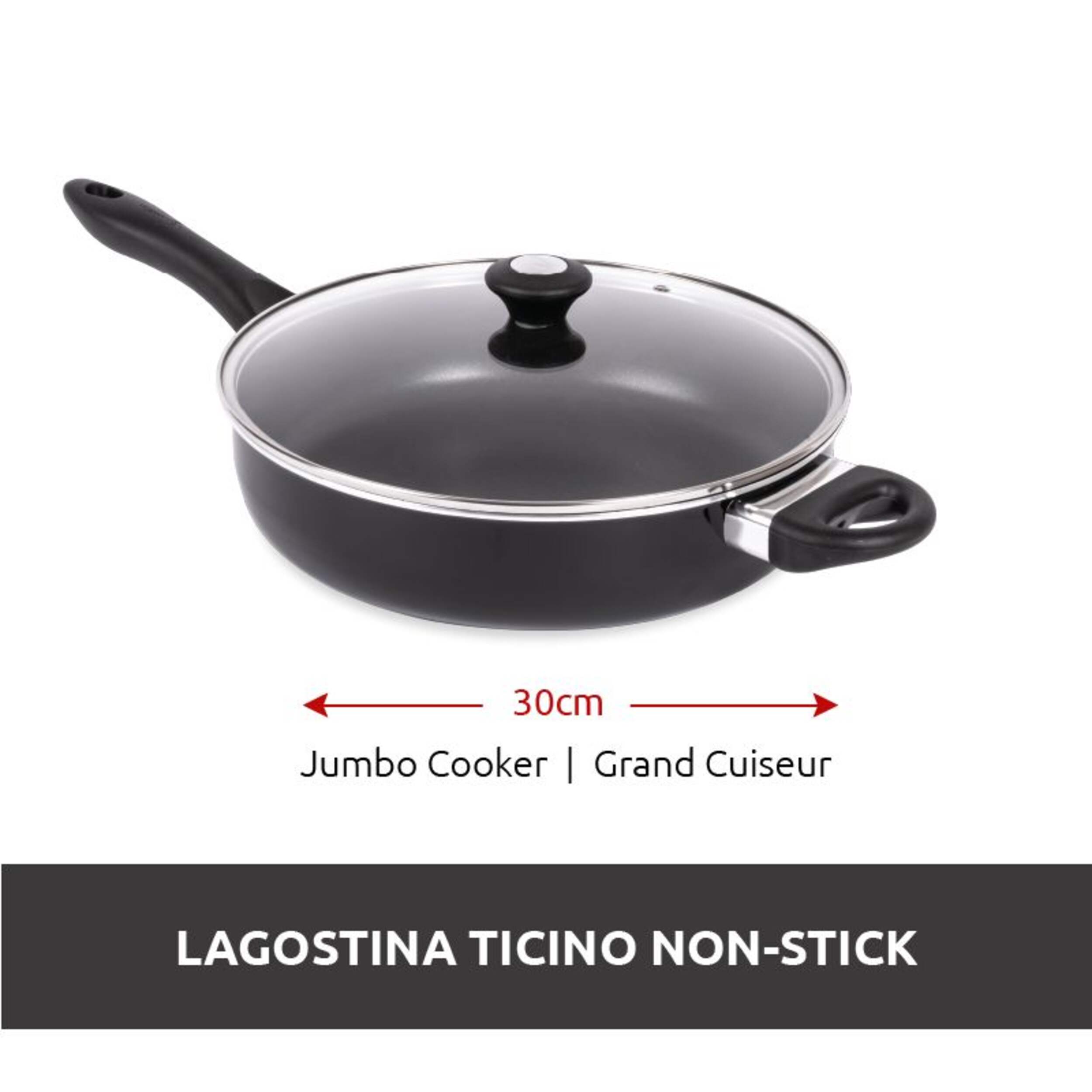The Lagostina Ticino Jumbo Cooker is a versatile and spacious cooking tool designed to handle large meals with ease. Featuring a durable non-stick coating, this jumbo cooker ensures effortless food release and quick clean-up after cooking. Its 5-quart capacity makes it ideal for preparing family-sized portions, from stir-fries to casseroles. The sleek black design is complemented by an oven-safe construction, allowing seamless transitions from stovetop to oven.