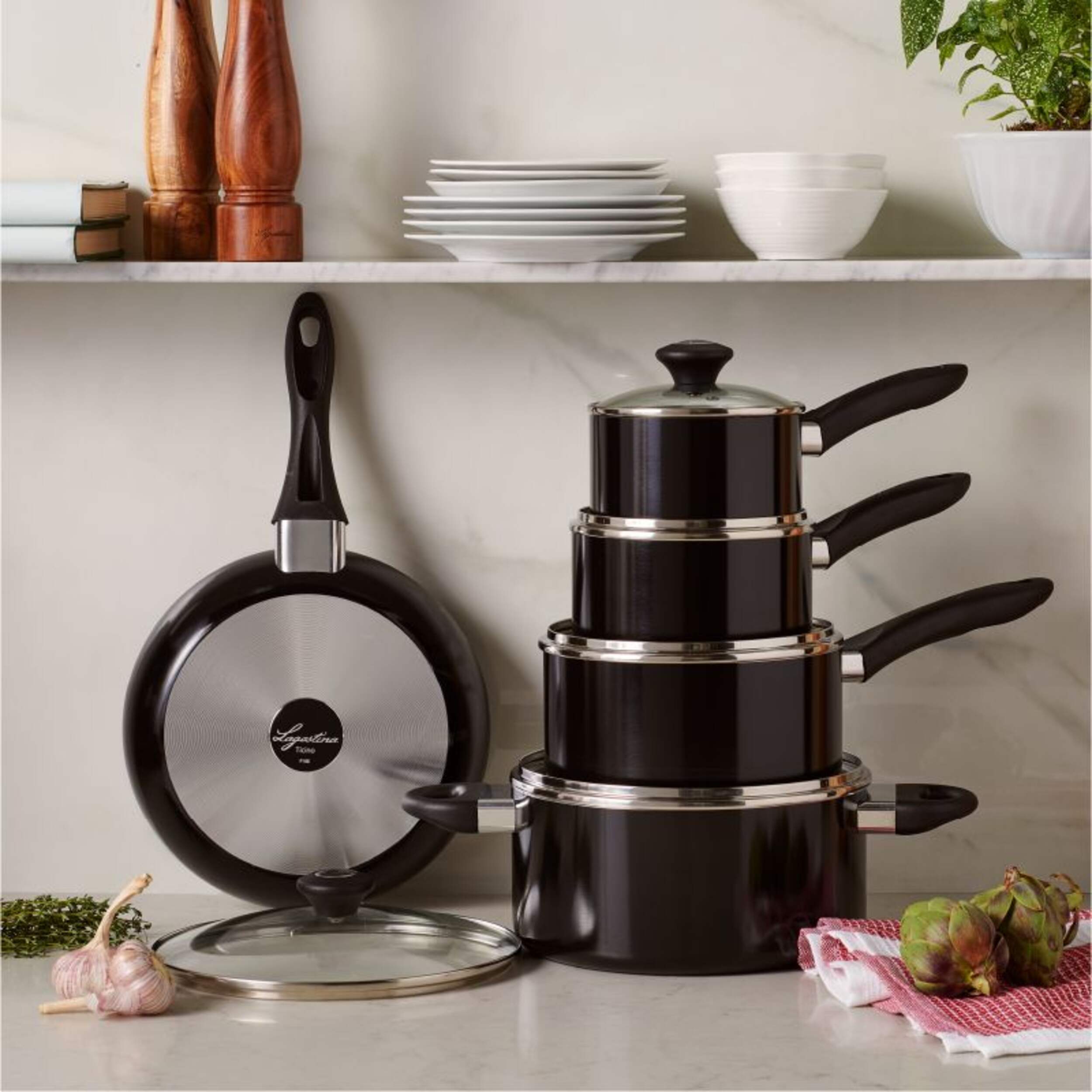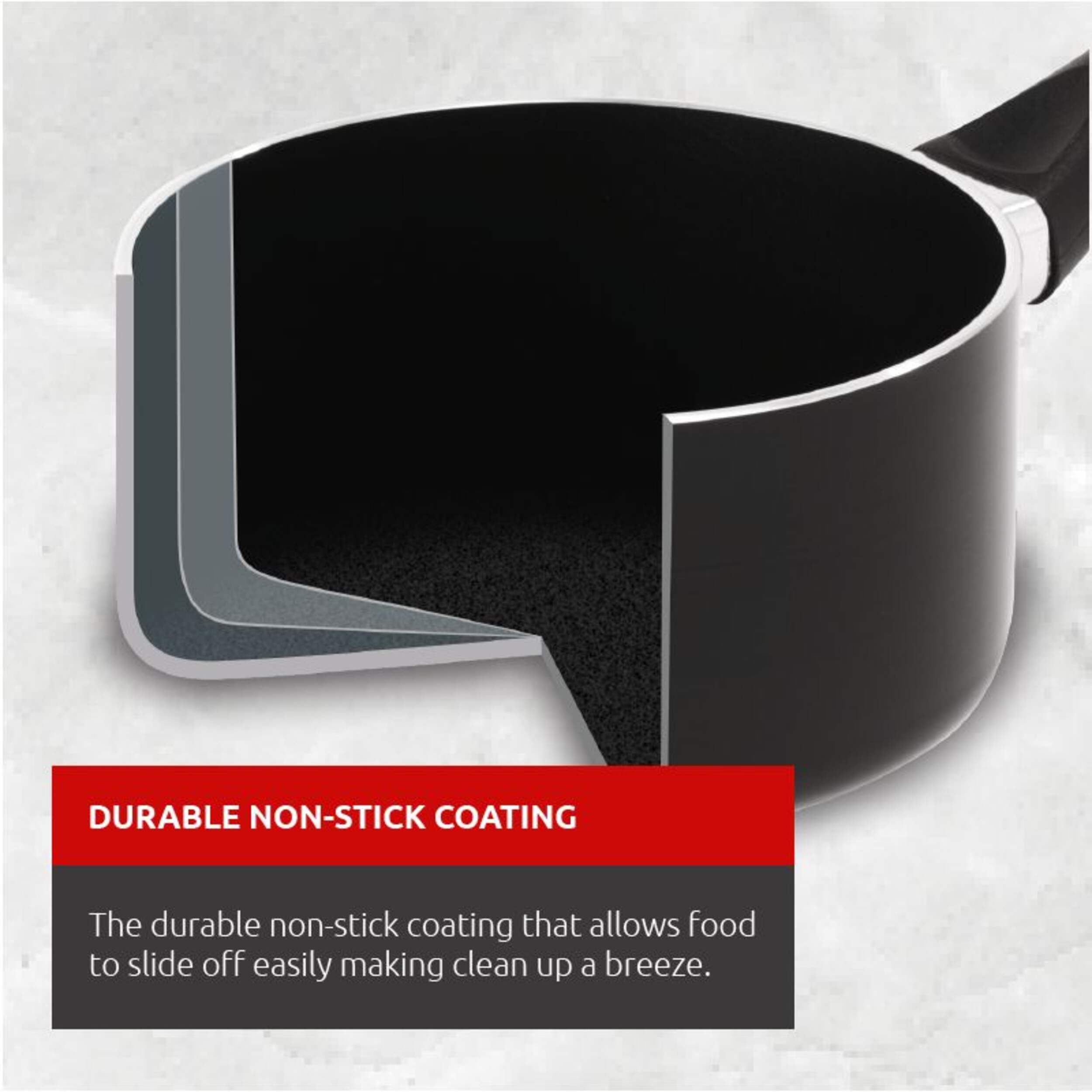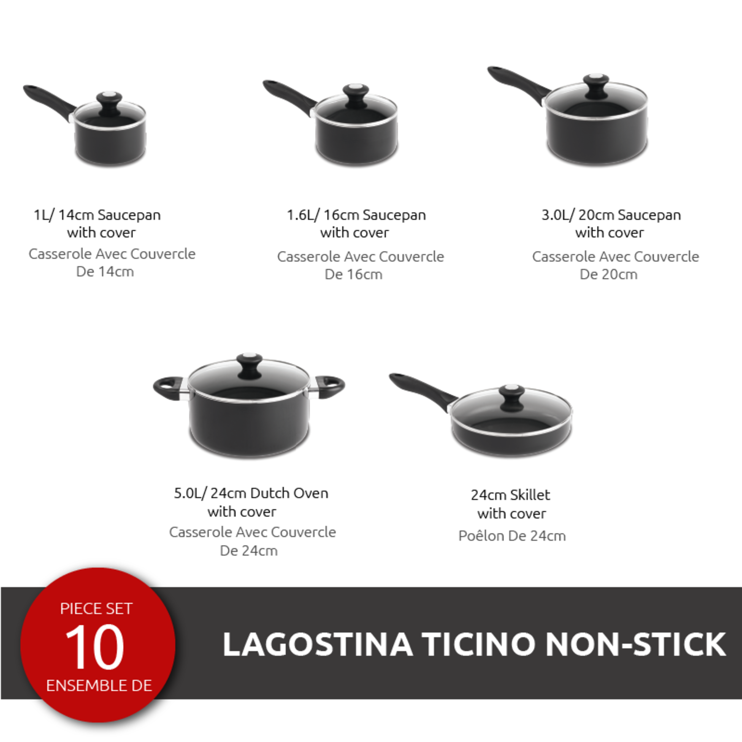 The Ticino 10-Piece Non-Stick Cookware Set features a durable non-stick coating that allows food to slide off easily making clean up a breeze. For ease of use, the ergonomically-designed Bakelite handles fit comfortably and securely in your hand while the heavy duty glass lids help seal in flavour while allowing you to monitor the cooking process.