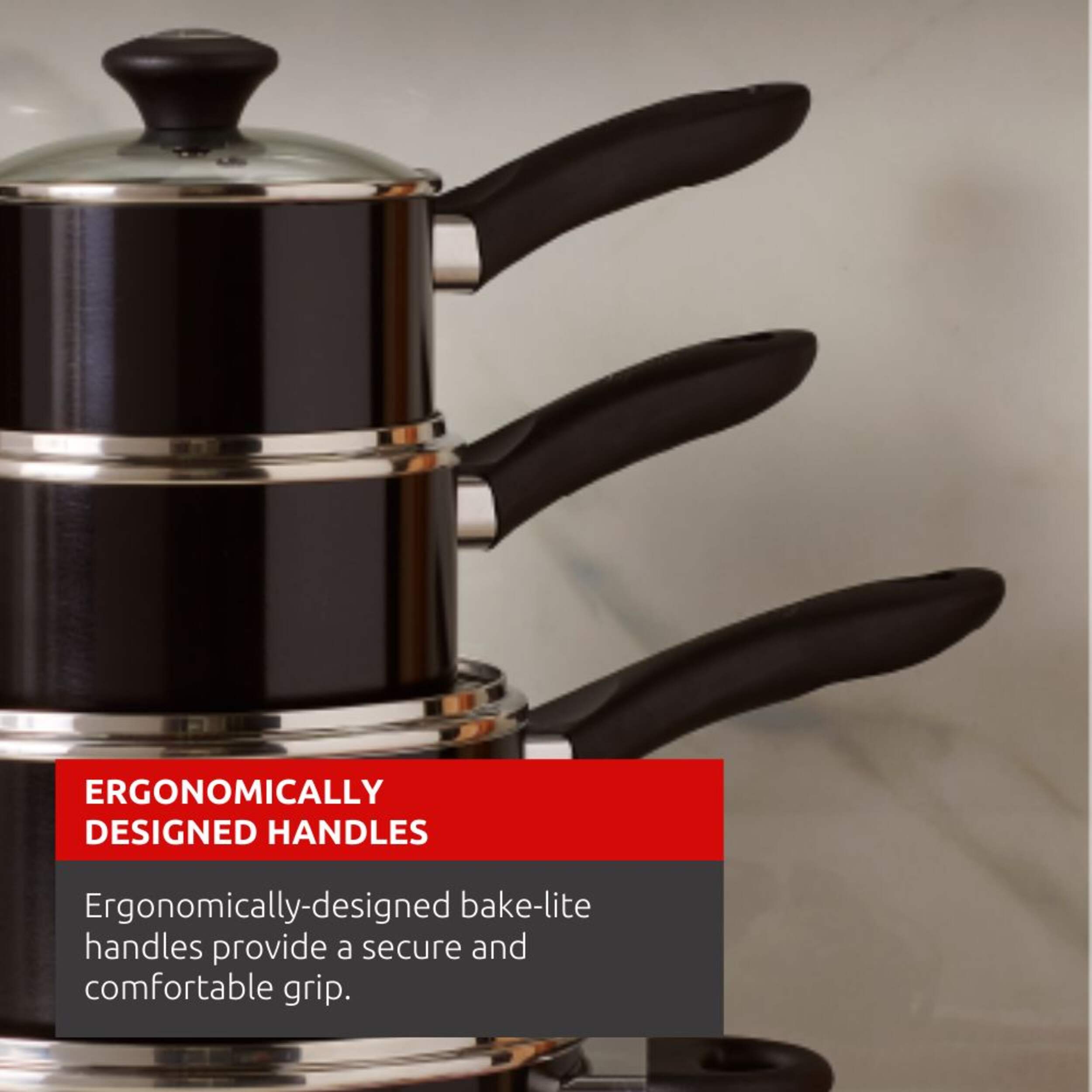 ERGONOMICALLY DESIGNED HANDLES: Ergonomically-designed bake-lite handles provide a secure and comfortable grip