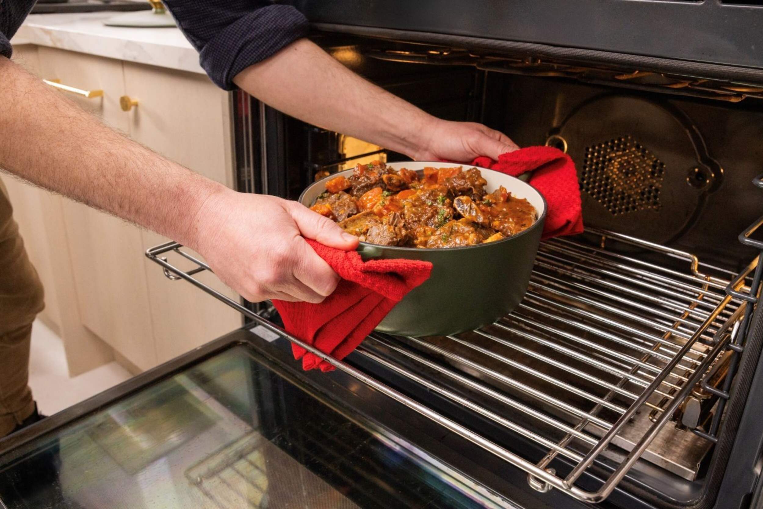 The elegant Lagostina Tuscan Collection Enamel Cast Iron Dutch Oven is perfect for a variety of cooking needs. Whether you're preparing sauces, soups, or stir-fries, this versatile dish has a 4-quart (3.79 Litres) capacity, ideal for both small and larger meals. Its durable enamel coating ensures even heat distribution, while the gold stainless steel knob adds a touch of sophistication. Little peaks beneath the lid evenly distribute condensation, keeping your dishes moist and flavourful. Perfect for the home chef who values style and functionality.