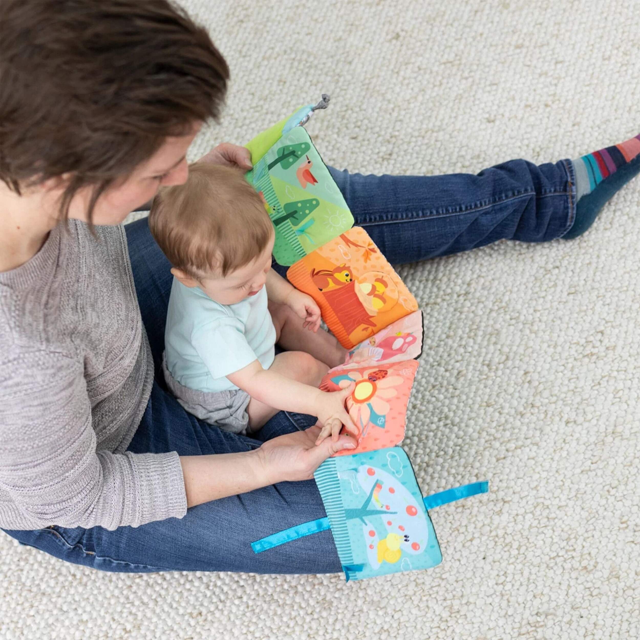 On one side, each accordion panel is bursting with bright colours, playful images, and exciting things to explore crinkle sounds