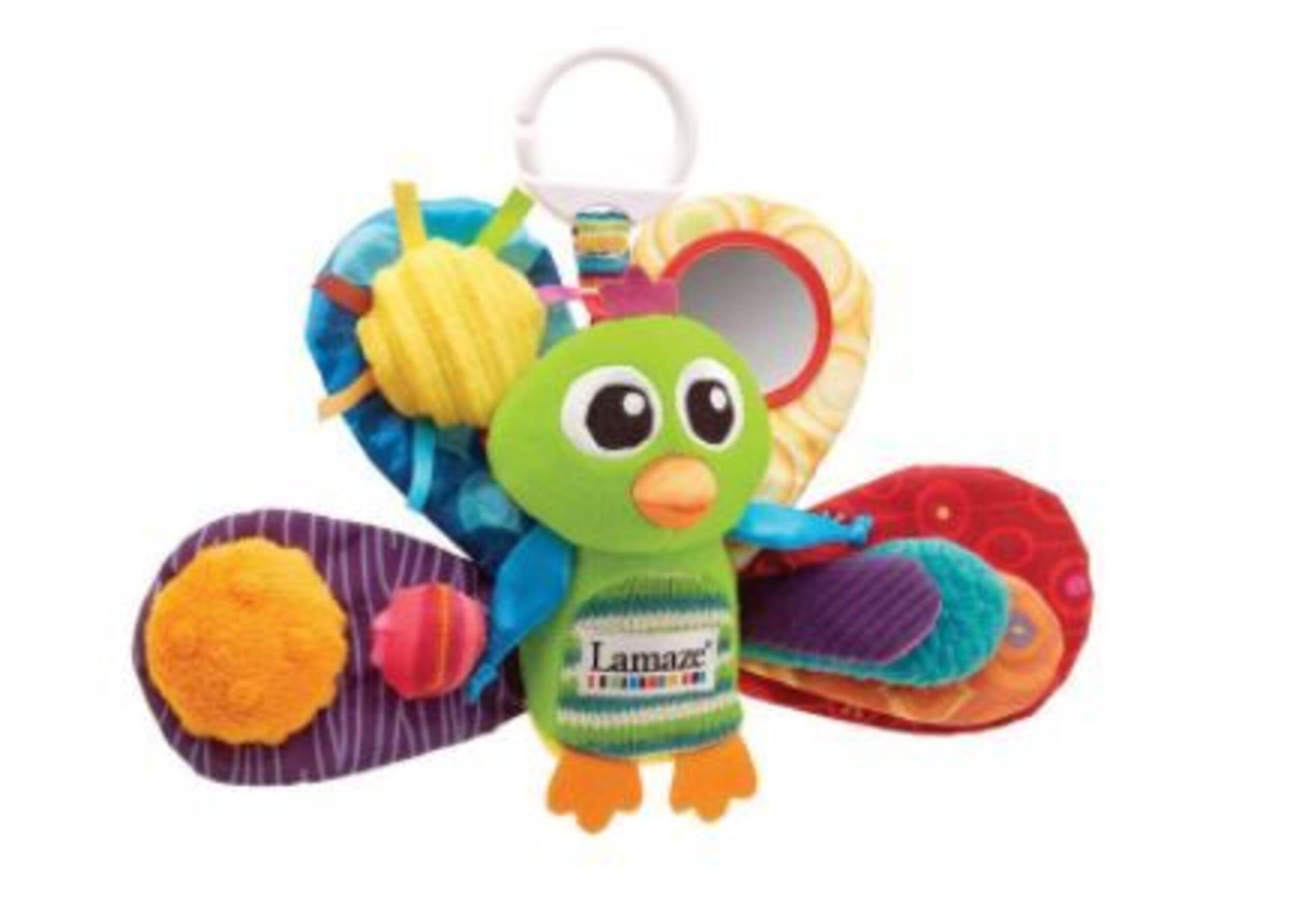 Lamaze Jacques the Peacock Clip and Go Baby Toy features multiple textures and sounds to keep a baby entertained