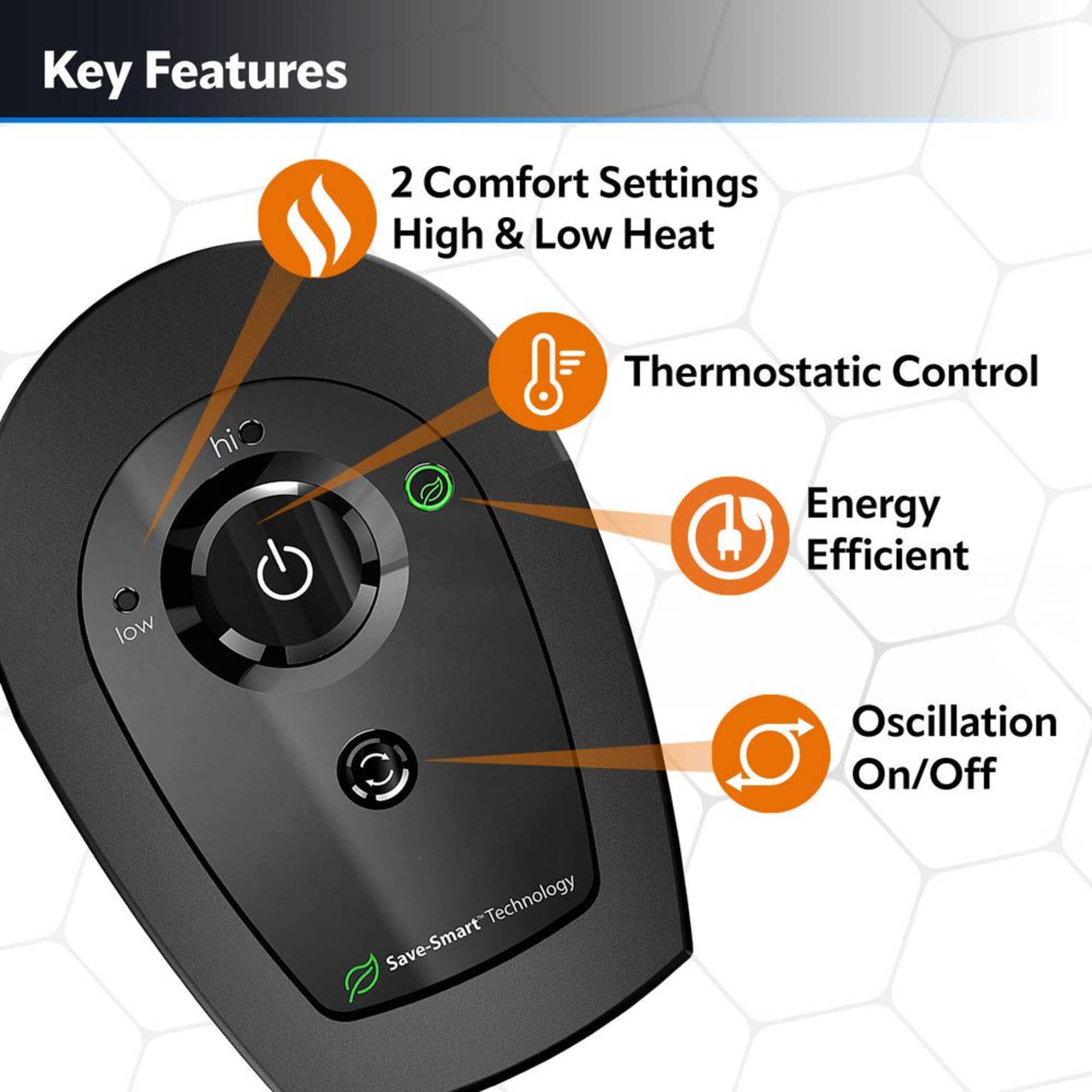 Stay cozy all season with the Lasko Ultra Slim Tower Ceramic Space Heater. Offering 1500 watts of powerful heat, this sleek heater features Auto Eco control, providing continuous warmth while automatically adjusting to conserve energy. Its widespread oscillation ensures even heat distribution, making it perfect for bedrooms, dens, and home offices. Built-in safety features, including automatic overheat protection and a cool-to-the-touch exterior, provide peace of mind while you enjoy the comfort.
