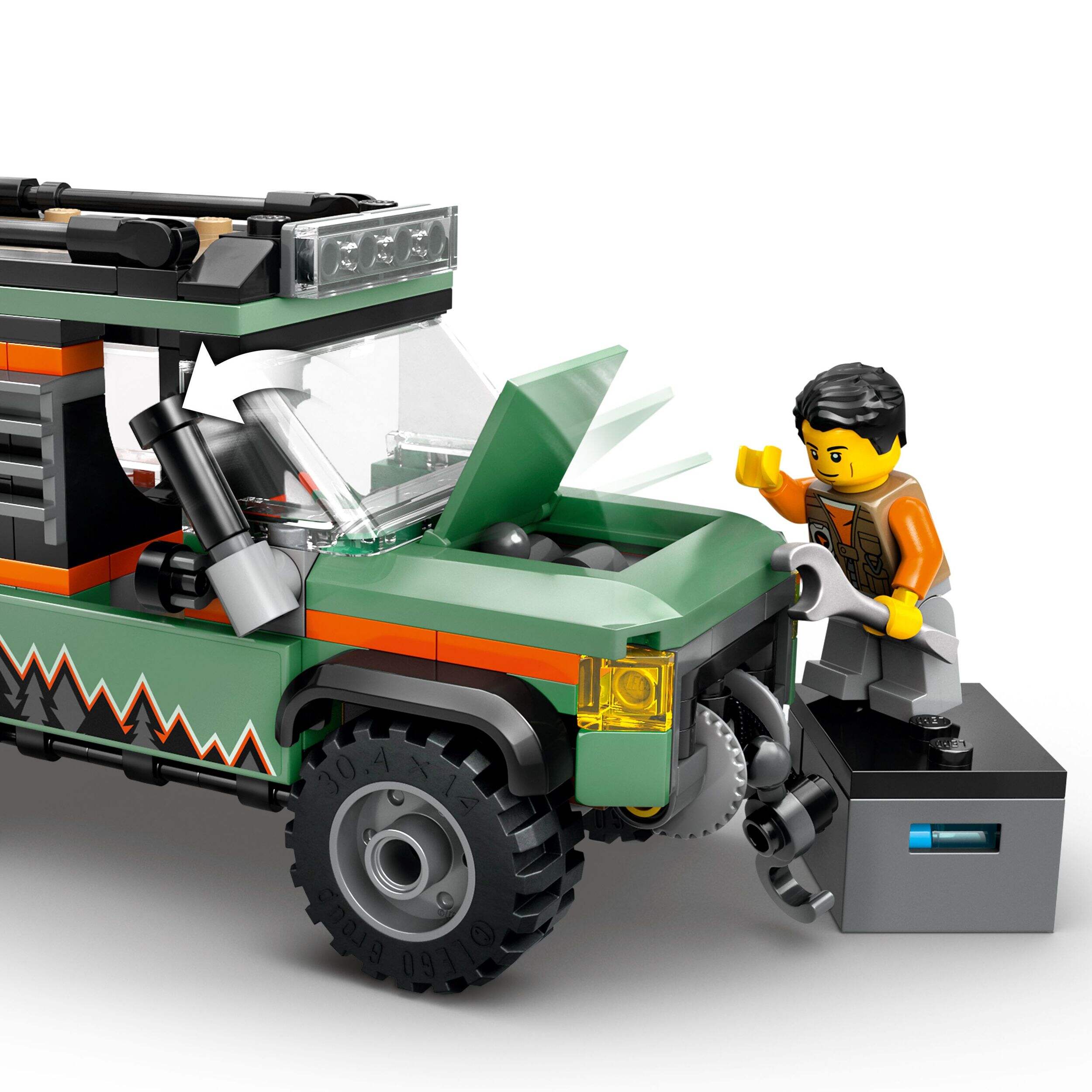 Vehicle set packed with LEGO® minifigure accessories – Includes a toy camera, water bottle, flashlight, map, compass, binoculars, tools and a first aid kit for pretend play