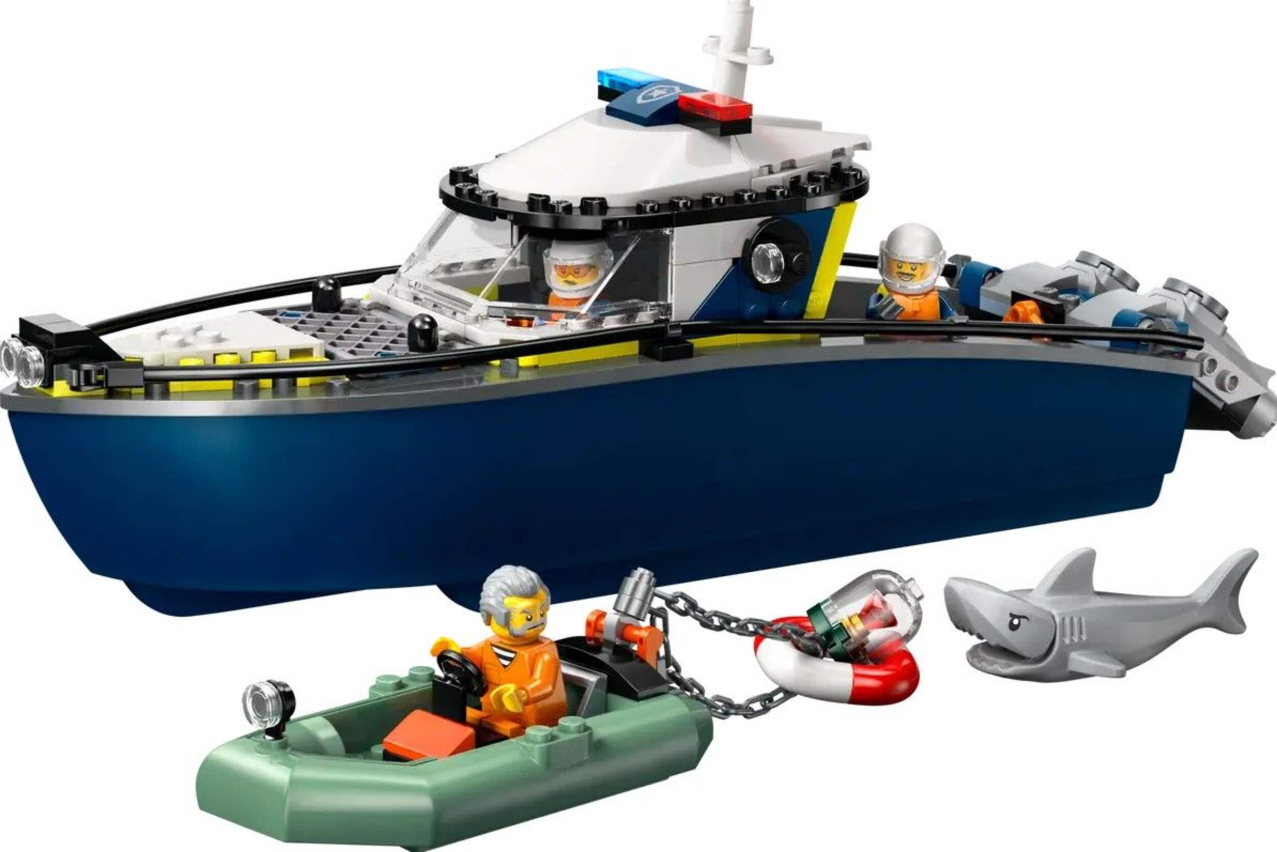 This exciting set includes a police patrol boat with twin engines and holding cell, plus a crook's power dinghy, 2 police officer minifigures, a crook minifigure, and a shark figure
