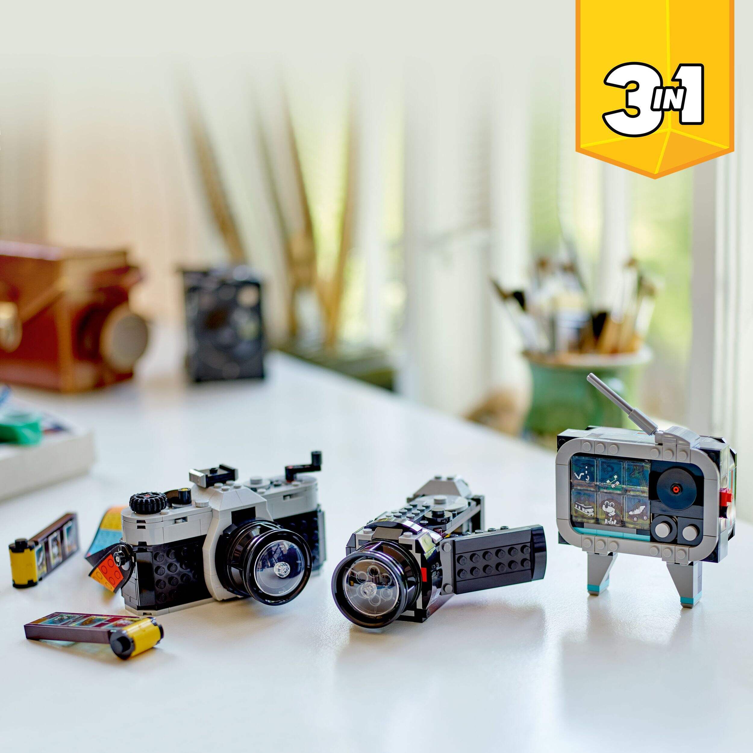 The LEGO® Creator Retro Camera Toy unleashes creativity in kids ages 8 and up with its versatile 3-in-1 building set. Children can construct a retro camera, classic video camera, or vintage TV, featuring authentic details like a moving lens and flip-up screen. With three different items to build from a limited number of pieces, this set provides an entertaining long-term project that stimulates creativity.