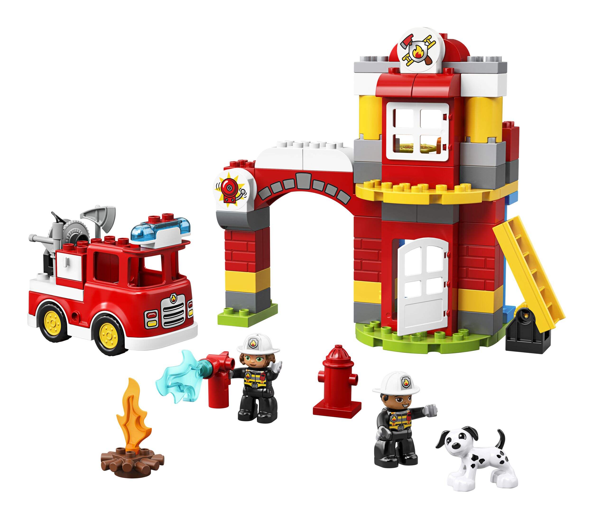 LEGO DUPLO® Fire Station set includes 2 LEGO® DUPLO® firefighter figures plus a dog figure
