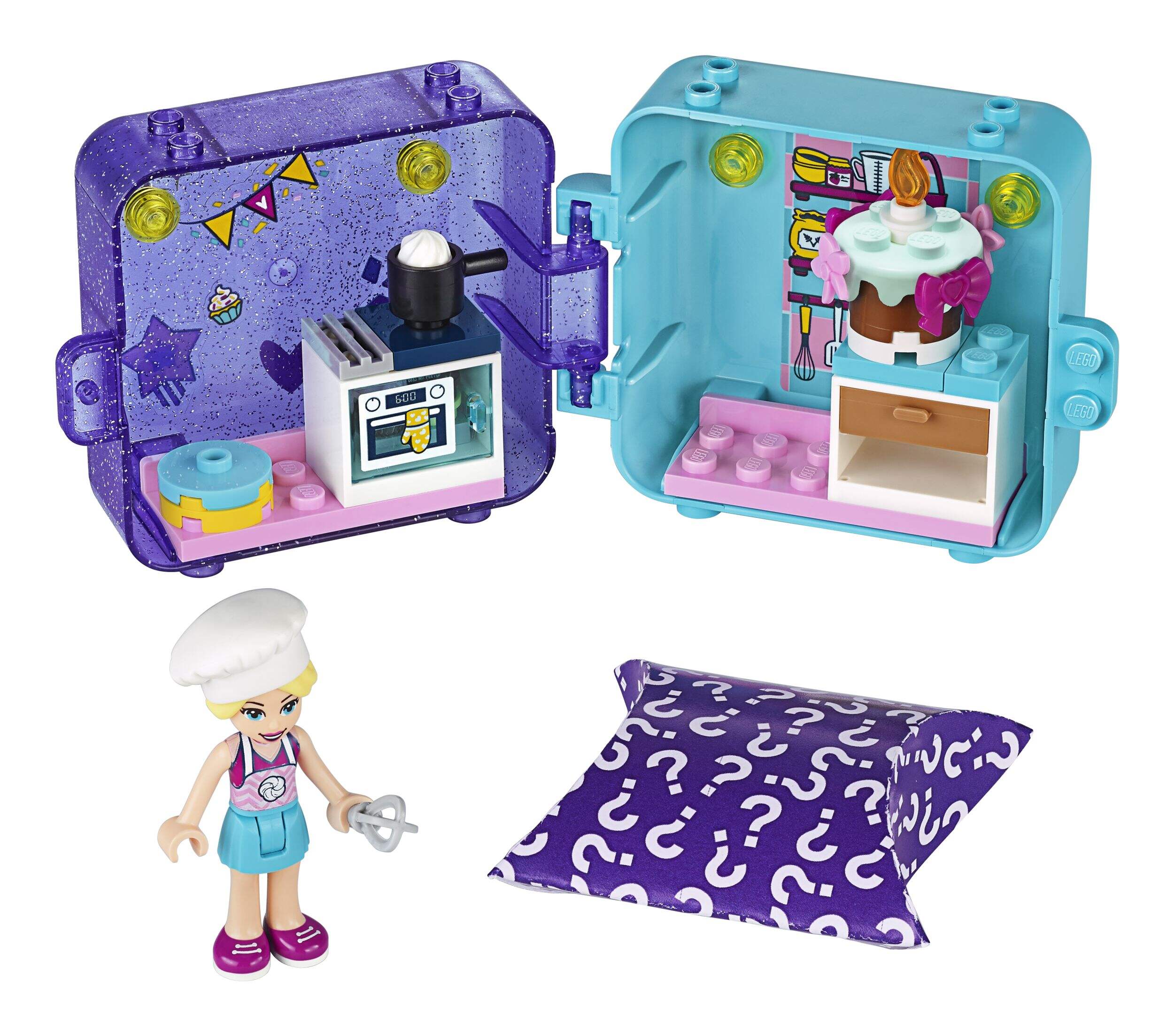 Inside Stephanie’s Play Cube (41401) is 1 mini-doll to do the cooking, a toy pet, a toy cake, 2 baking-themed scenes and lots of mini-doll accessories, as well as a sticker sheet for customizing fun