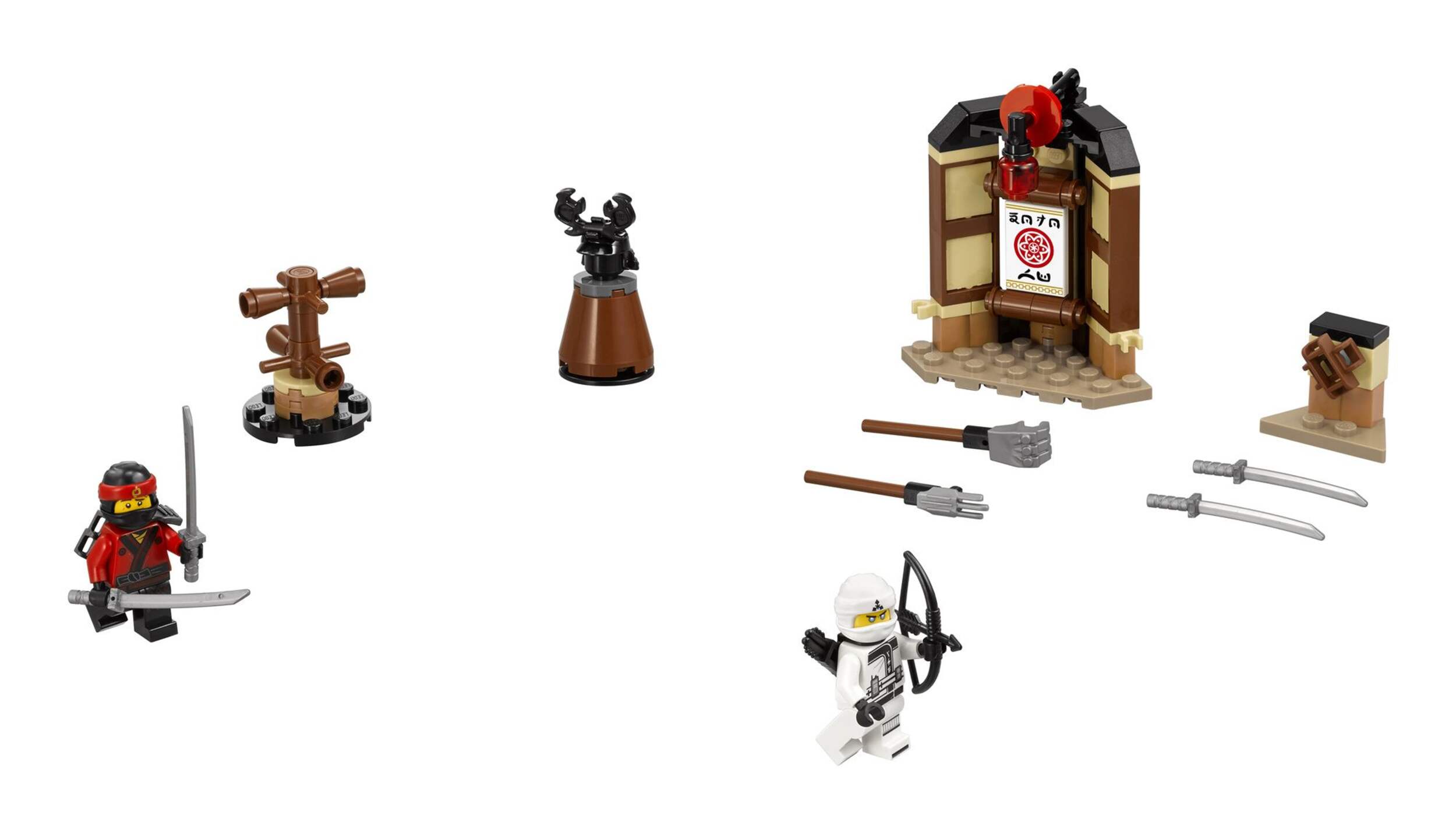 LEGO Ninjago Spinjitzu Training features a dojo wall with a scroll and 2 detachable staffs, weapon rack with 2 katanas, Garmadon combat dummy and a combat training station