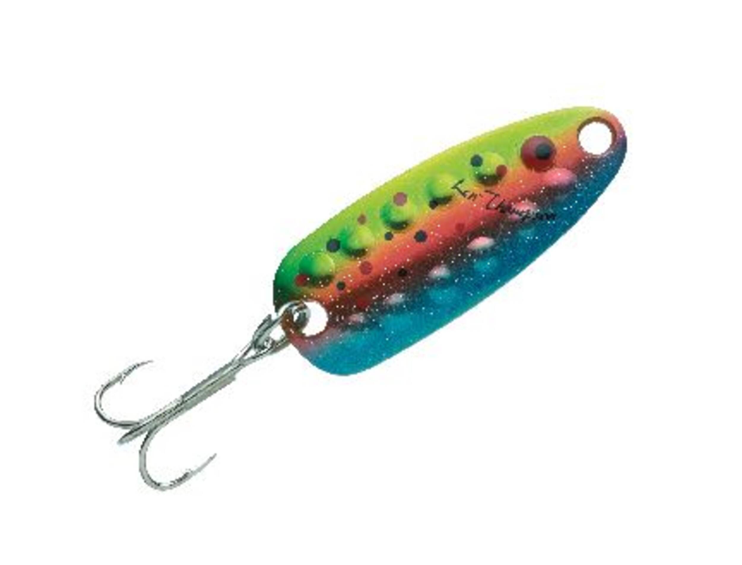 Len Thompson's dimpled series lures entice trout and salmon with an extravagant wiggle and noise in the water. The premium paint patterns create extra light refractions to catch a fish's eye, while being tough and environmentally safe. The modern and colorful metallic rainbow coating will surely help bring a strike from game fish, even for beginners thanks to the wider wobble.