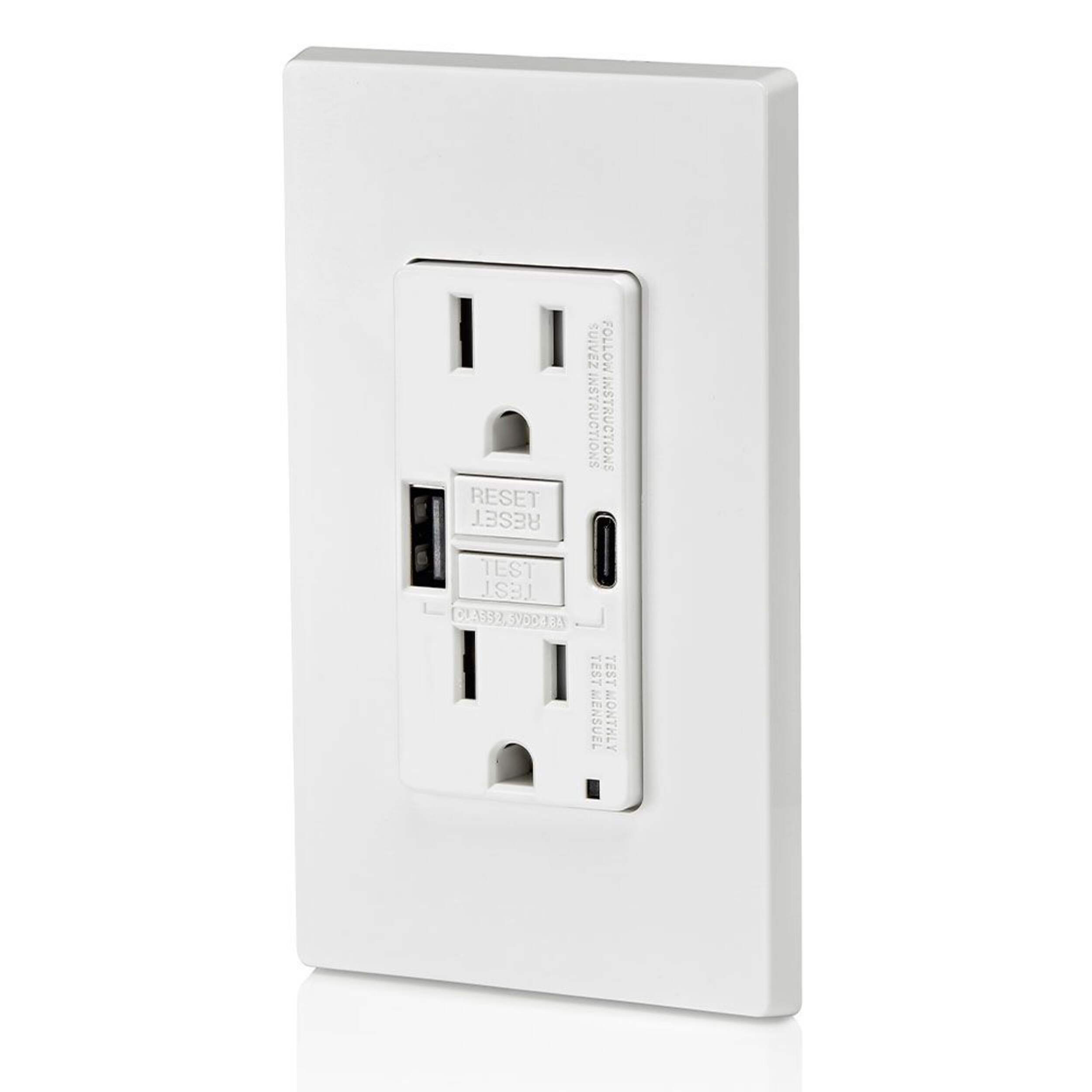 The Leviton 15A USB & GFCI Receptacle, Type-A/Type-C offers advanced safety and efficient charging capabilities. Delivering 24W (4.8A) of power, it provides continuous ground fault protection and automatically self-tests to ensure it can respond to a ground fault. Featuring both Type-A and Type-C USB ports, this receptacle allows for versatile and fast charging of multiple devices. Ideal for kitchens, bathrooms, and other areas requiring GFCI protection, it combines functionality with a sleek, modern design.
