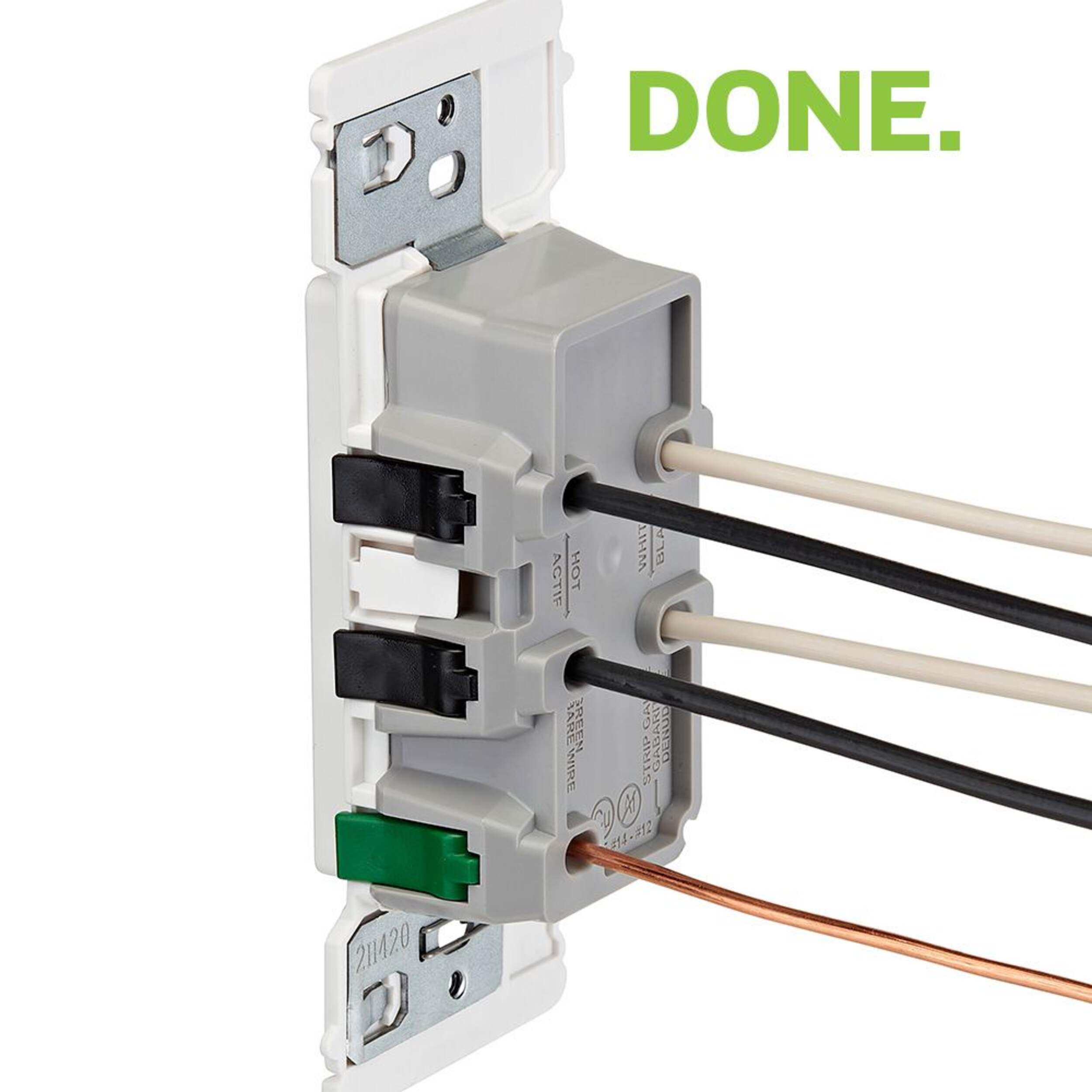 The Leviton Decora Edge 15A 125V Receptacle installs faster, safer, and easier with its innovative Push, Click, Done design. The concealed terminals and absence of exposed metal deliver enhanced safety during installation. Colour-coded lever terminals enable efficient wiring and reduce errors. The built-in snap-fit levers confirm that connections are properly made, while the audible click they produce allows you to verify that the lever door is securely closed. With unique tongue and groove fittings, the Leviton Decora Edge aligns quickly for faster multi-gang installation.