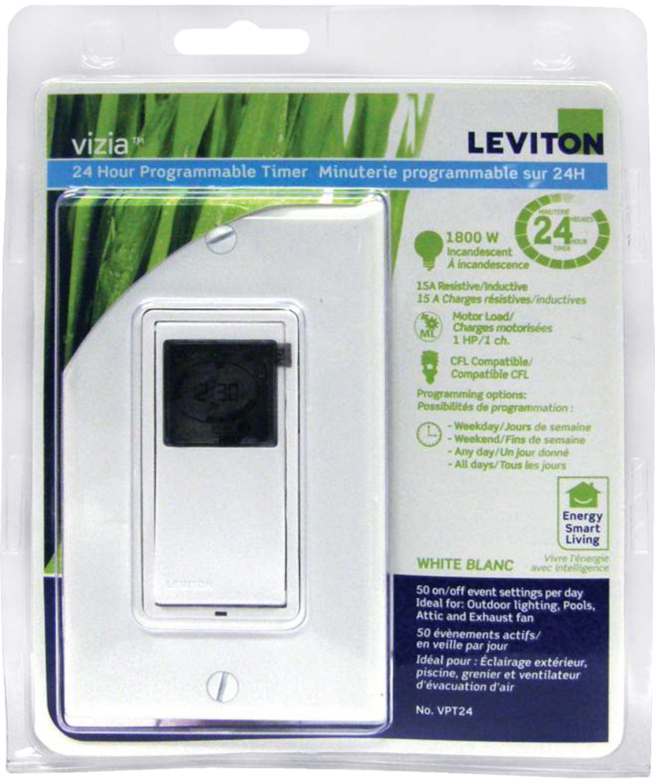 The Decora 24-Hour Programmable Timer is the perfect solution for automating outdoor lighting, pools, attic fans, and exhaust fans with ease. Its large, back-lit display makes it simple to view timer settings at a glance, while offering the flexibility to program weekdays, weekends, or any combination of days. The built-in astronomical clock automatically adjusts to local sunrise and sunset times, and the optional automatic daylight savings adjustment keeps your schedule accurate year-round. This timer also features a rechargeable battery to keep time during temporary power outages. With 50 on/off settings per day, the Decora Timer provides complete control, making it an excellent choice for managing outdoor lighting, pool equipment, and ventilation systems.