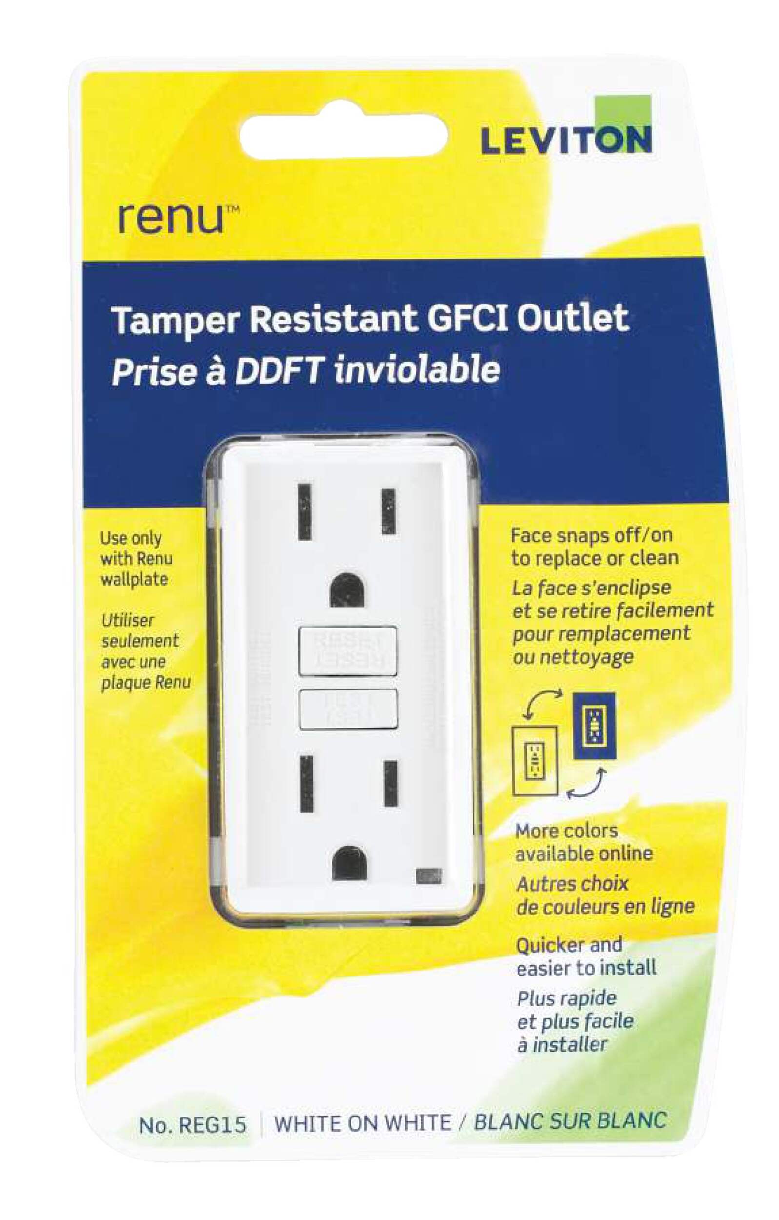 The Leviton RGF15-792 Renu Tamper-Resistant GFCI Receptacle combines safety, convenience, and versatility in a sleek, modern design. The outlet automatically conducts periodic internal testing to ensure reliable operation, providing peace of mind. The shallow design and back/side wiring options simplify installation in any wallbox. Whether you're upgrading for safety, functionality, or style, the Leviton Renu outlet offers a flexible and reliable solution for residential or commercial applications.