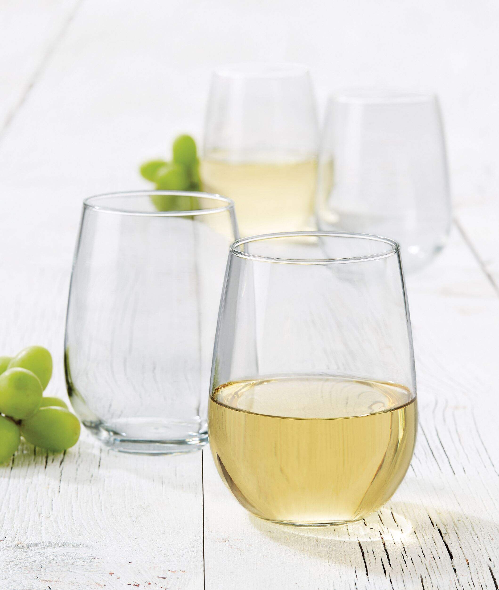 Stemless glasses are soaring in popularity because they're casual yet classy. These white wine glasses are stable and balanced to prevent tipping and breaking. The rimless design fits easily in the dishwasher so use for juice or water adds elegance to daily life. 17 oz/503 ml capacity. Set of four. Dishwasher safe.