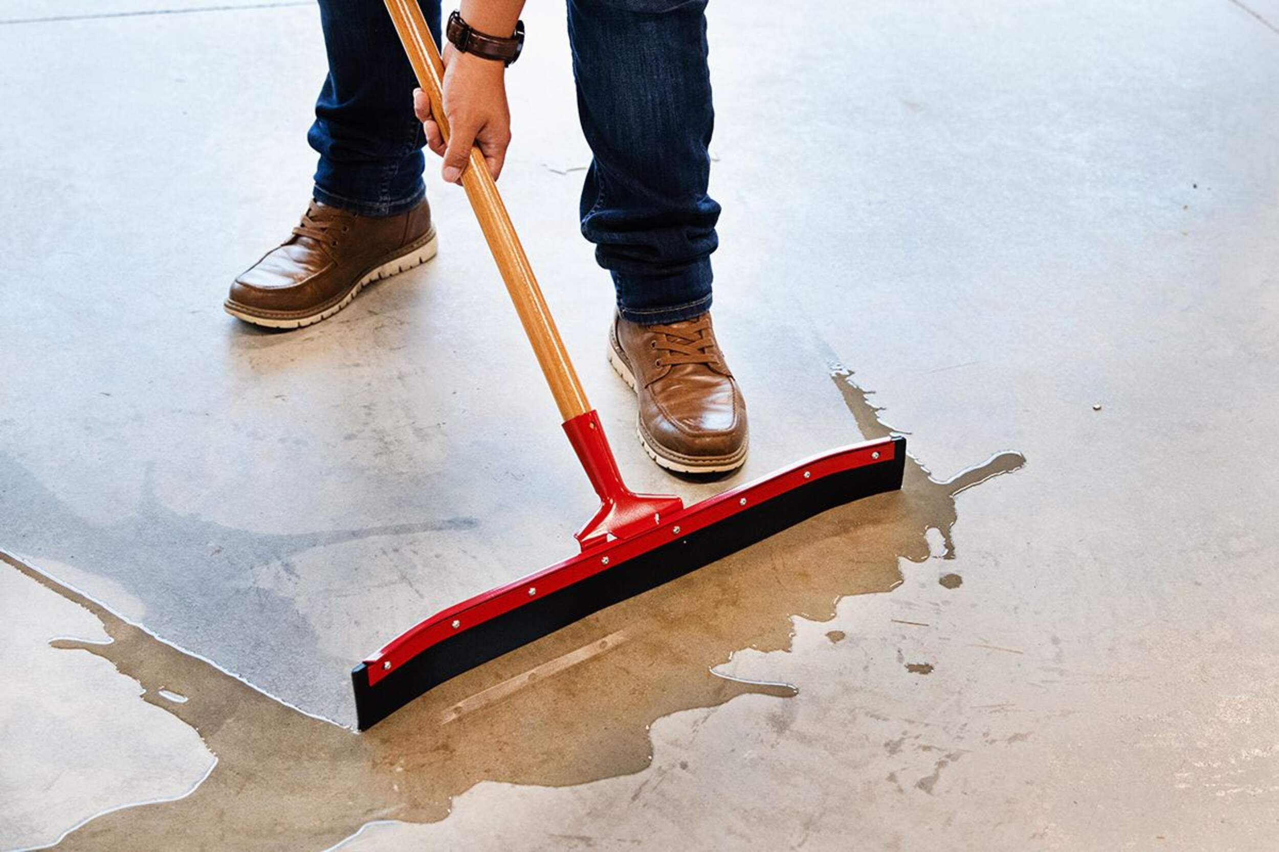 Straight, firm rubber blade mounted with a curve to remove and contain water