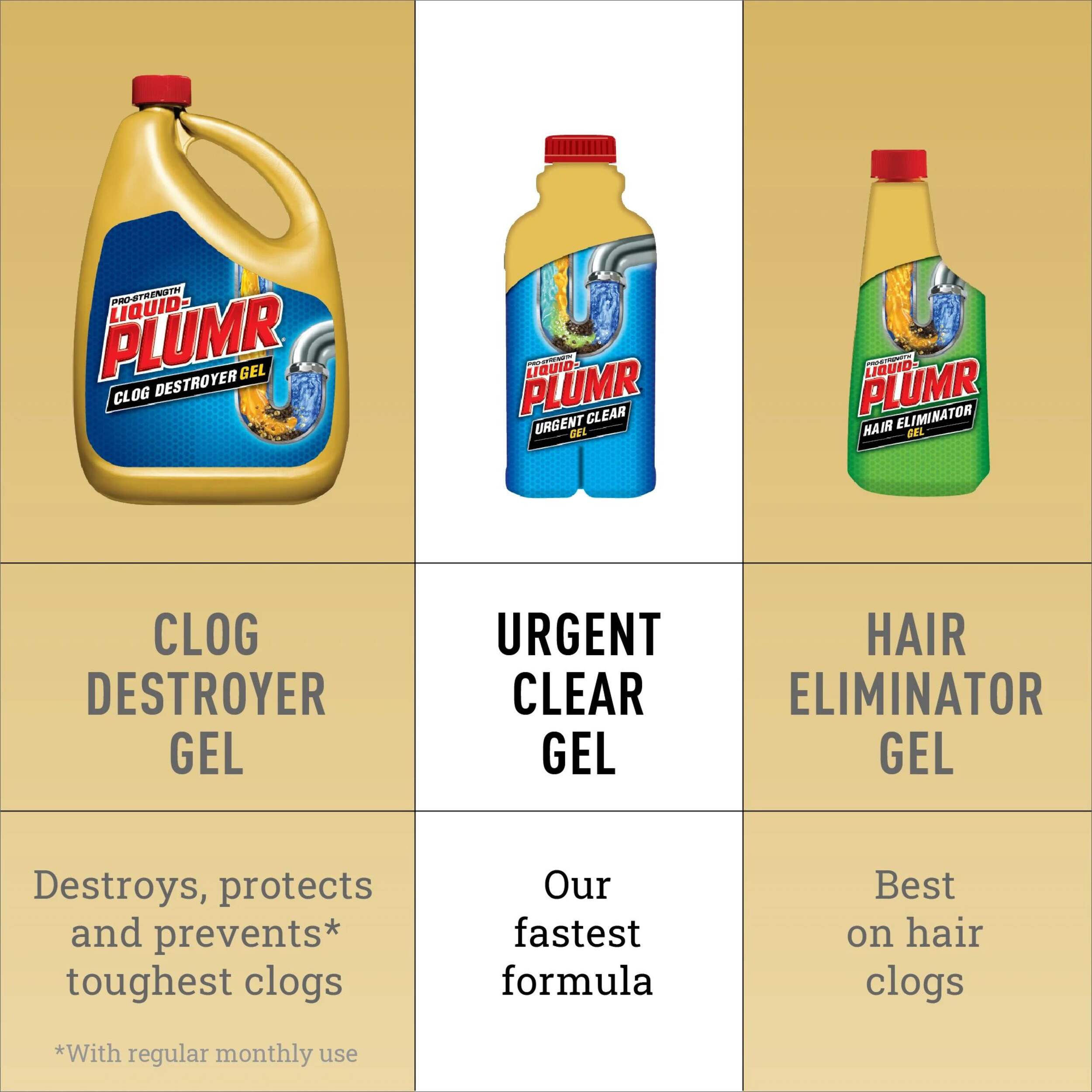 Liquid-Plumr® Urgent Clear®, a powerful gel drain cleaner, is designed to clear even the toughest clogs in just 7 minutes. It quickly gets to work on hair, gunk and soap scum, clearing both standing-water blockages and slow flowing drains. Use it in the bathtub, kitchen sink or garbage disposal. It’s safe for all pipes, including PVC, plastic, copper, old pipes and septic systems. Keep your drains clear with Liquid-Plumr®.