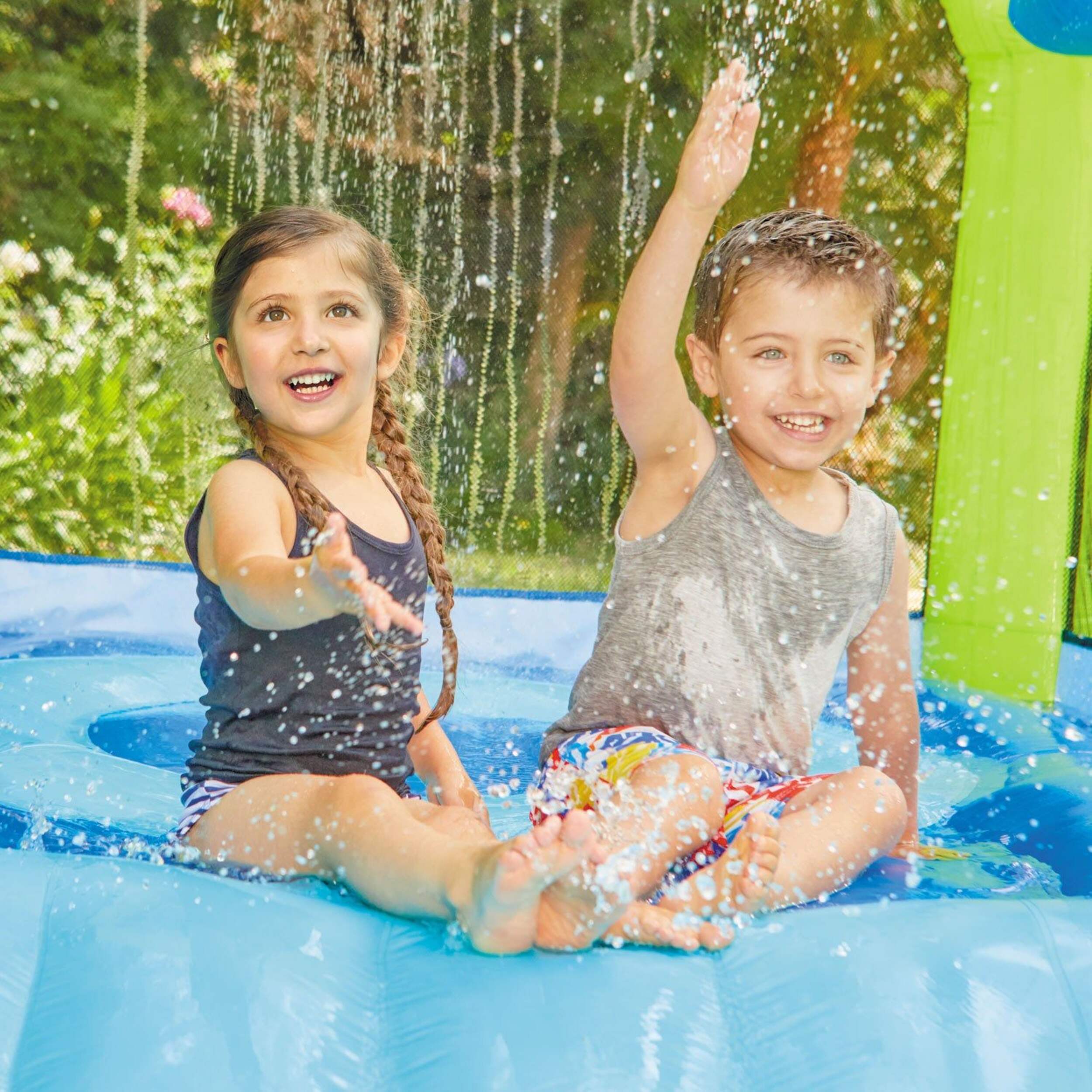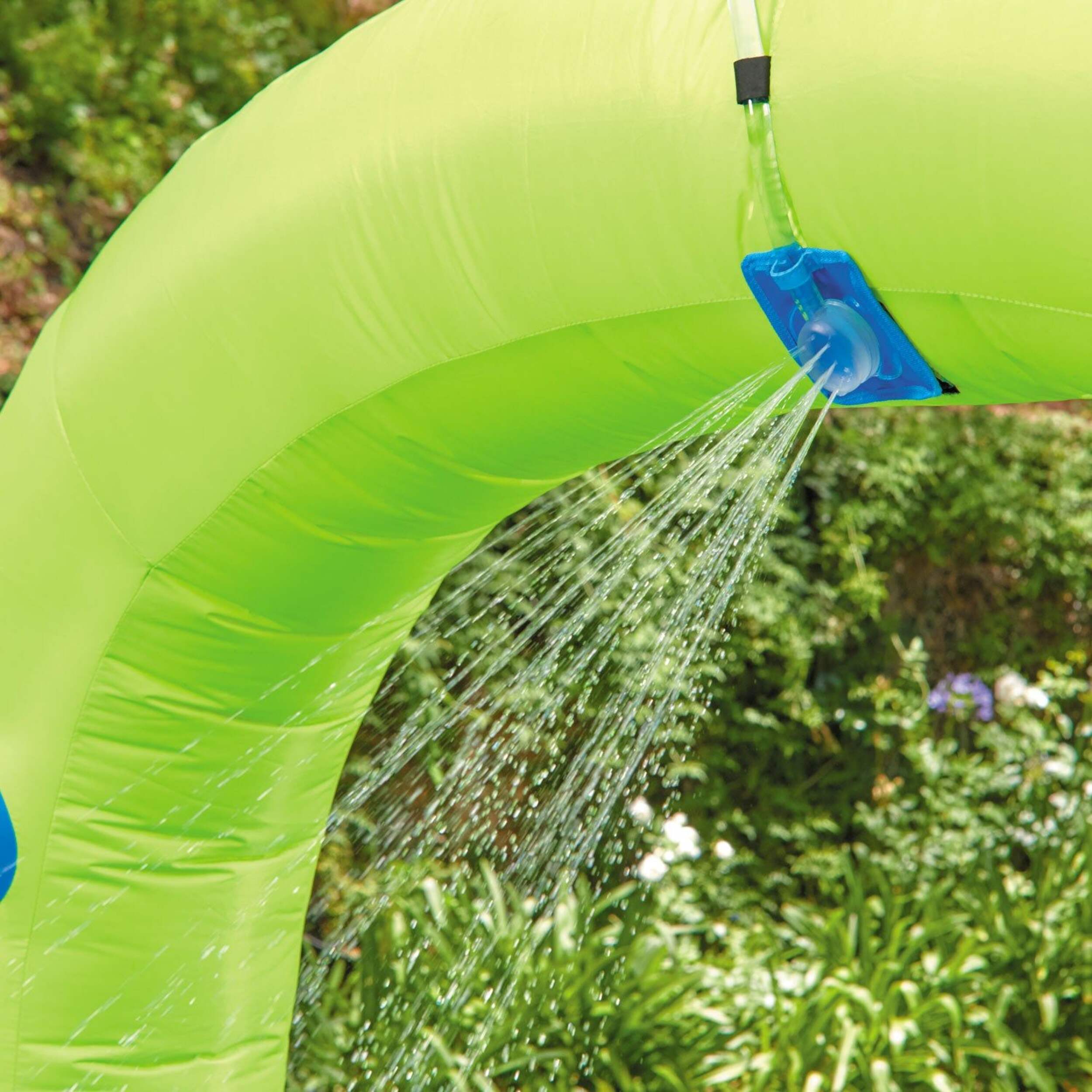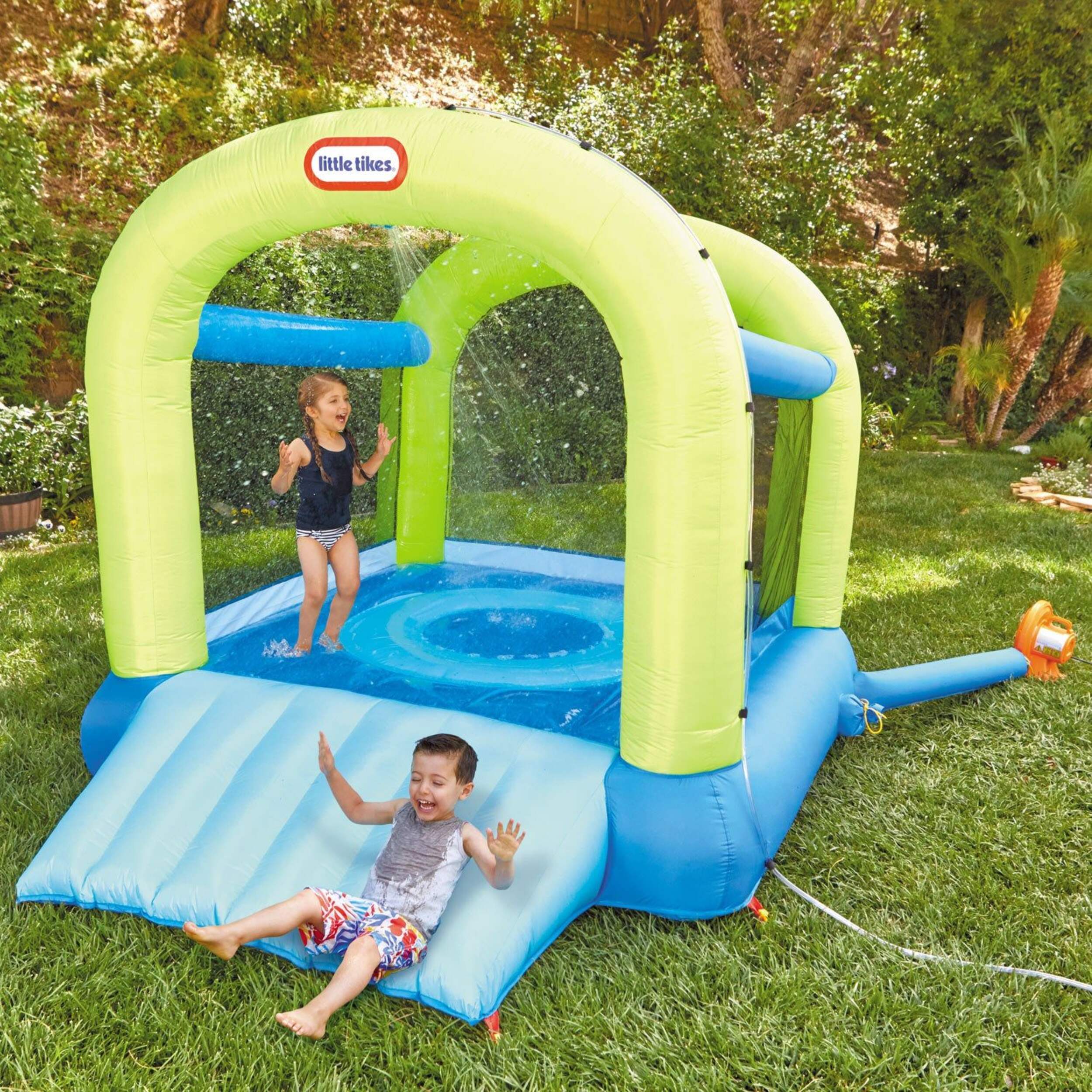 Attach a garden hose to the Splash 'n Spray Bouncer to keep the water flowing