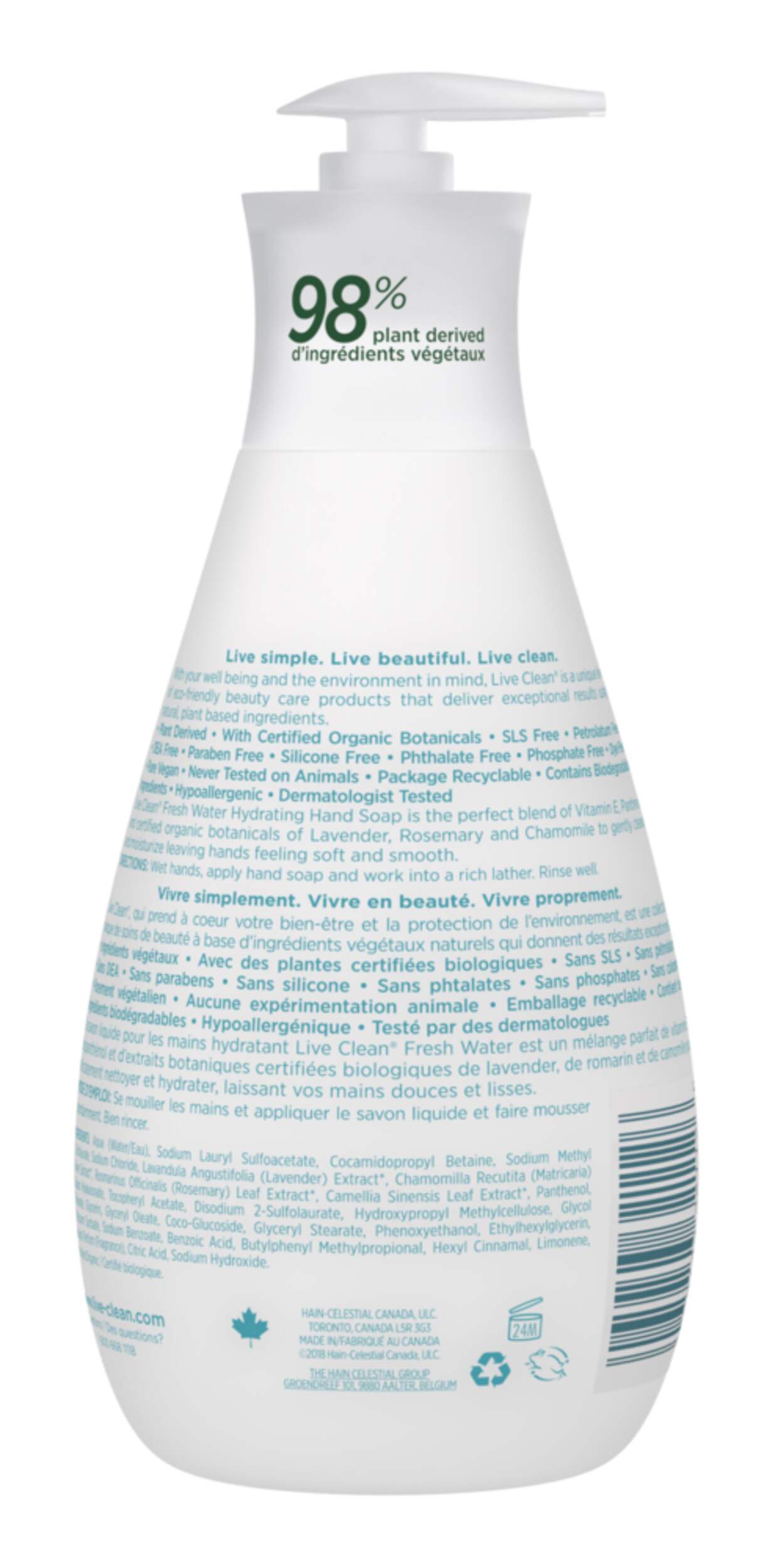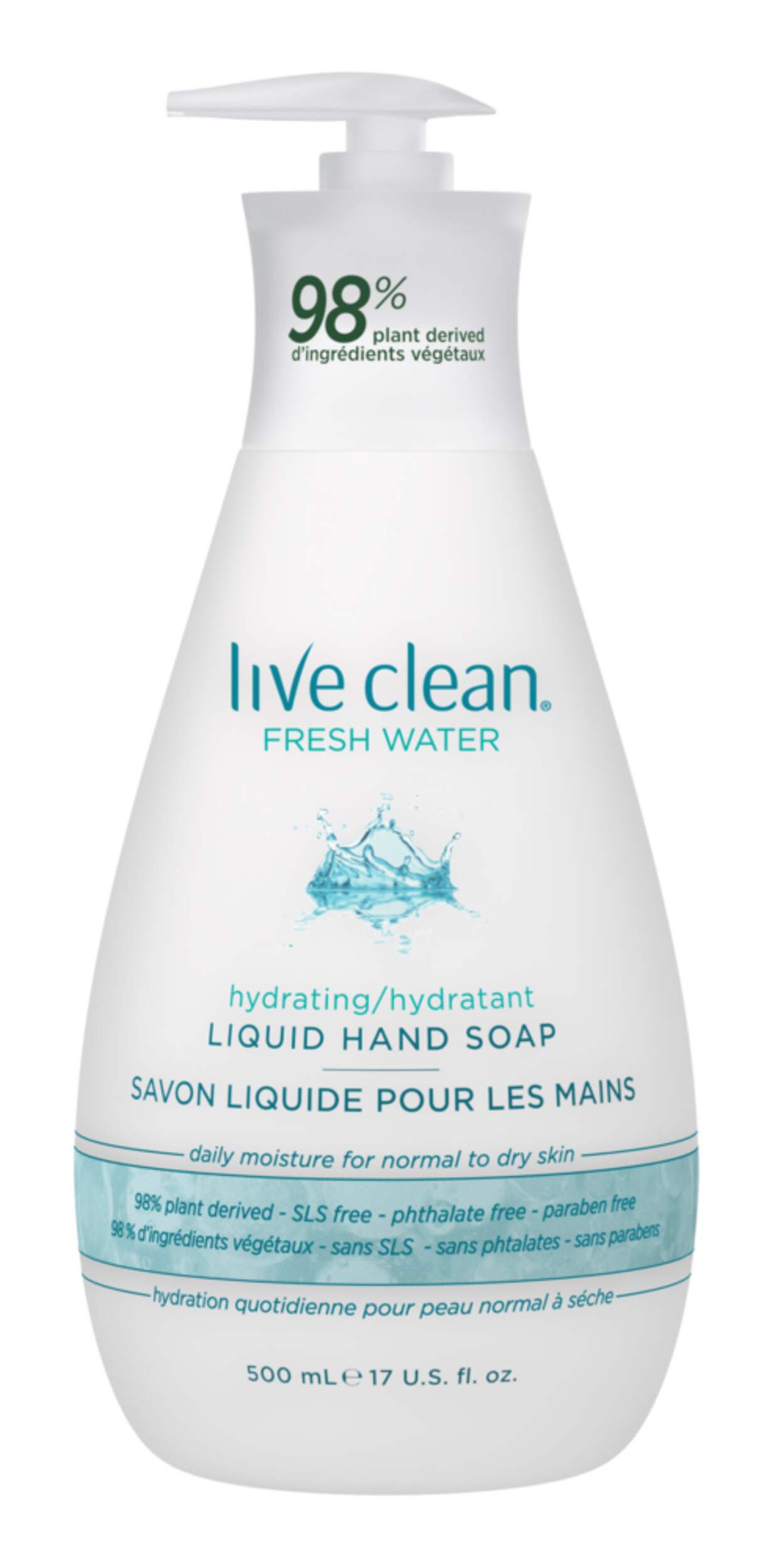 Live Clean Fresh Water Hydrating Liquid Hand Soap blends vitamin E with panthenol to gently cleanse and moisturize skin for a smooth and radiant appearance. Our moisturizing hand soap is infused with certified organic botanicals to leave skin feeling soft and smooth. This liquid soap is 98% plant-based, vegan, never tested on animals and free from parabens, sulfates and harmful chemicals.