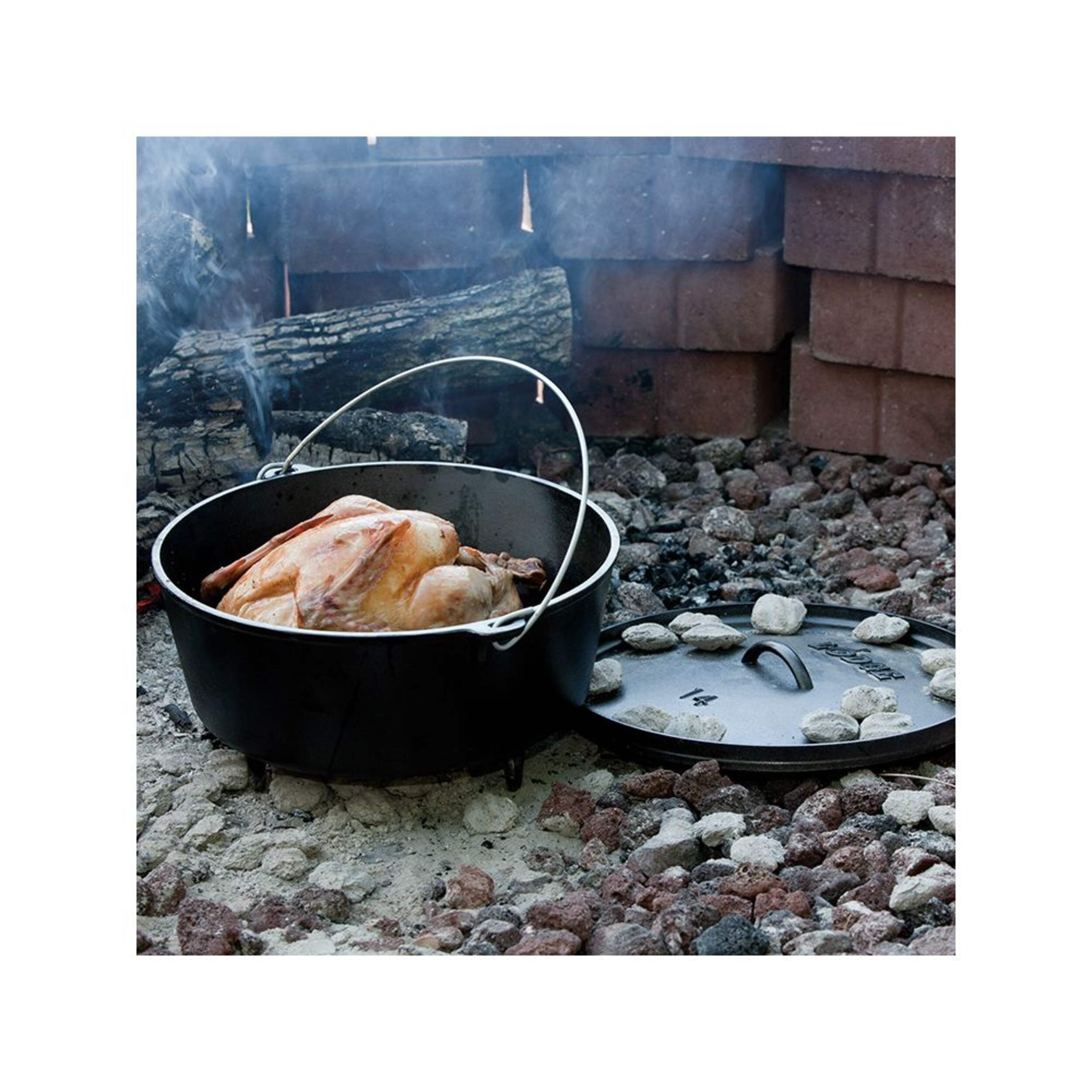 The Lodge portable “camp stove” is the pot that does it all. The flanged lid holds hot coals and inverts for use as a griddle. The integral legs allow the oven to sit perfectly over hot coals. The bail handle is for use with a tripod.