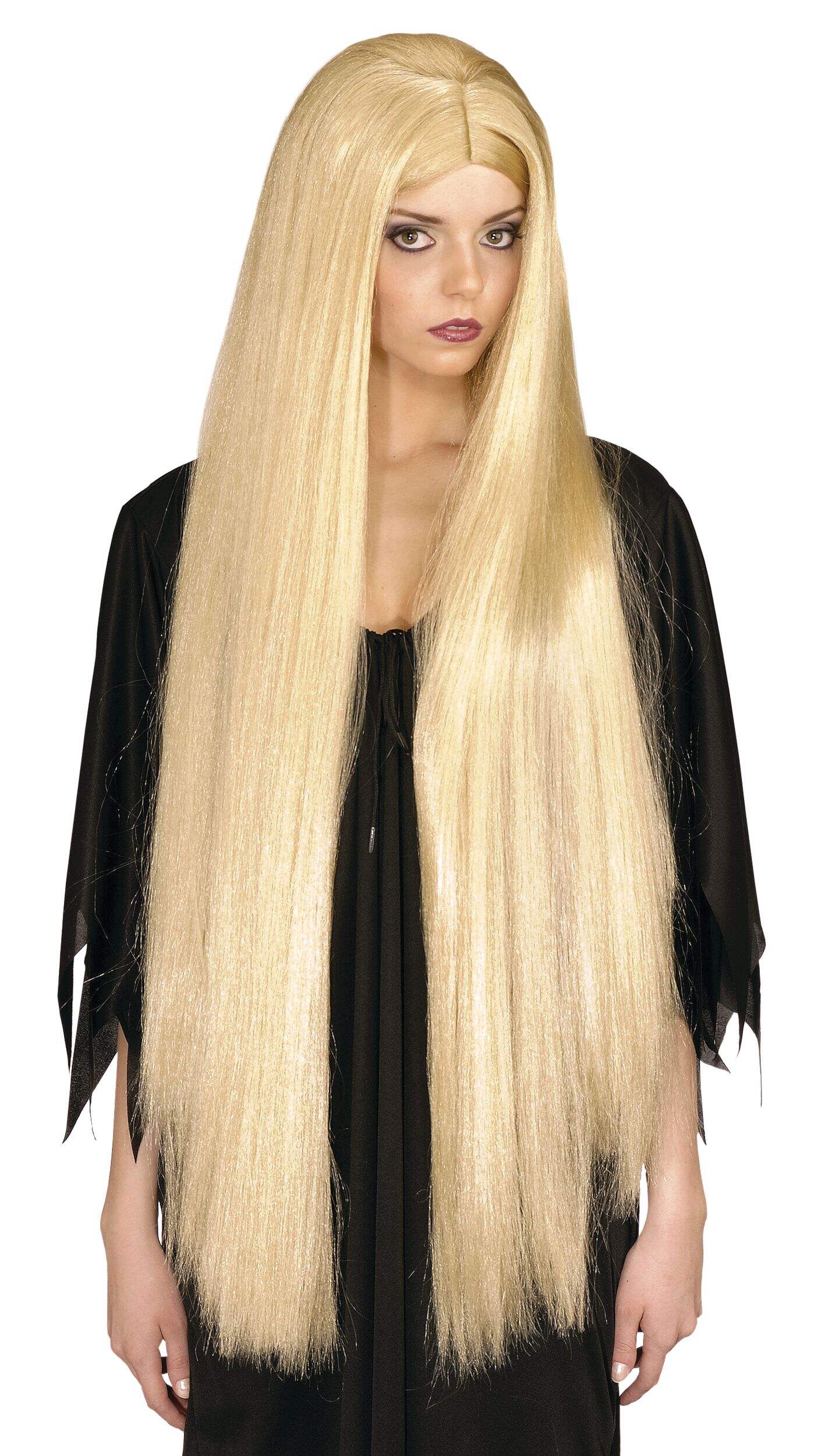 Put down the flat iron! Wear this ready-to-wear Extra Long Blonde Wig over your own locks and spend the time you save in hair care wowing your friends. This women's wig features 36-in (91.4-cm) straight synthetic fiber hair arranged in a center part style and hanging well past the waist.