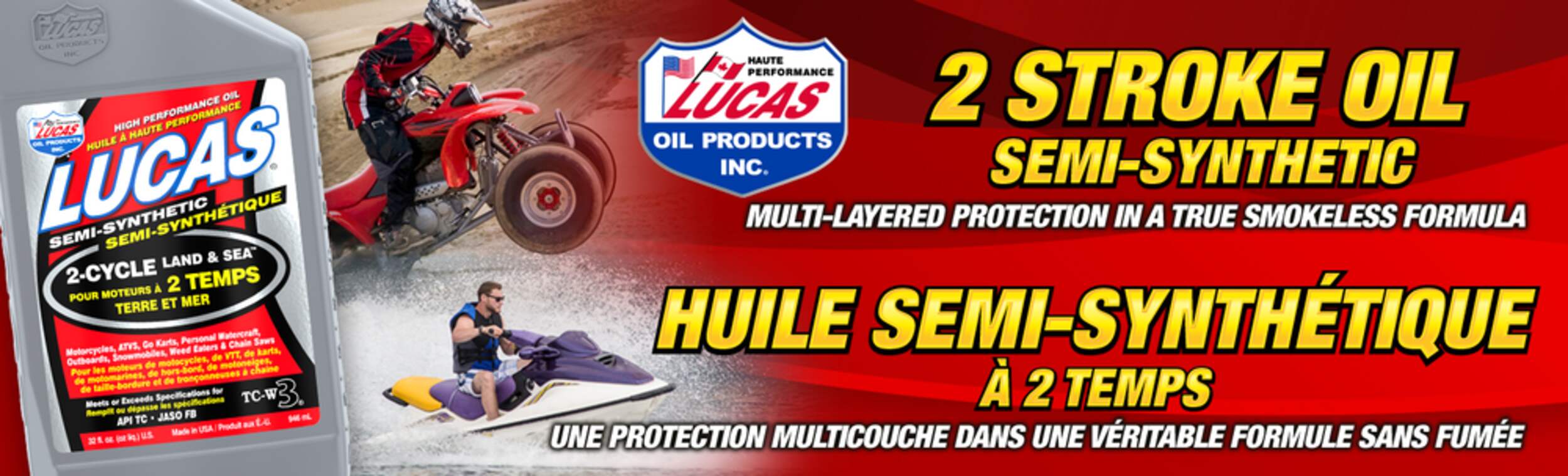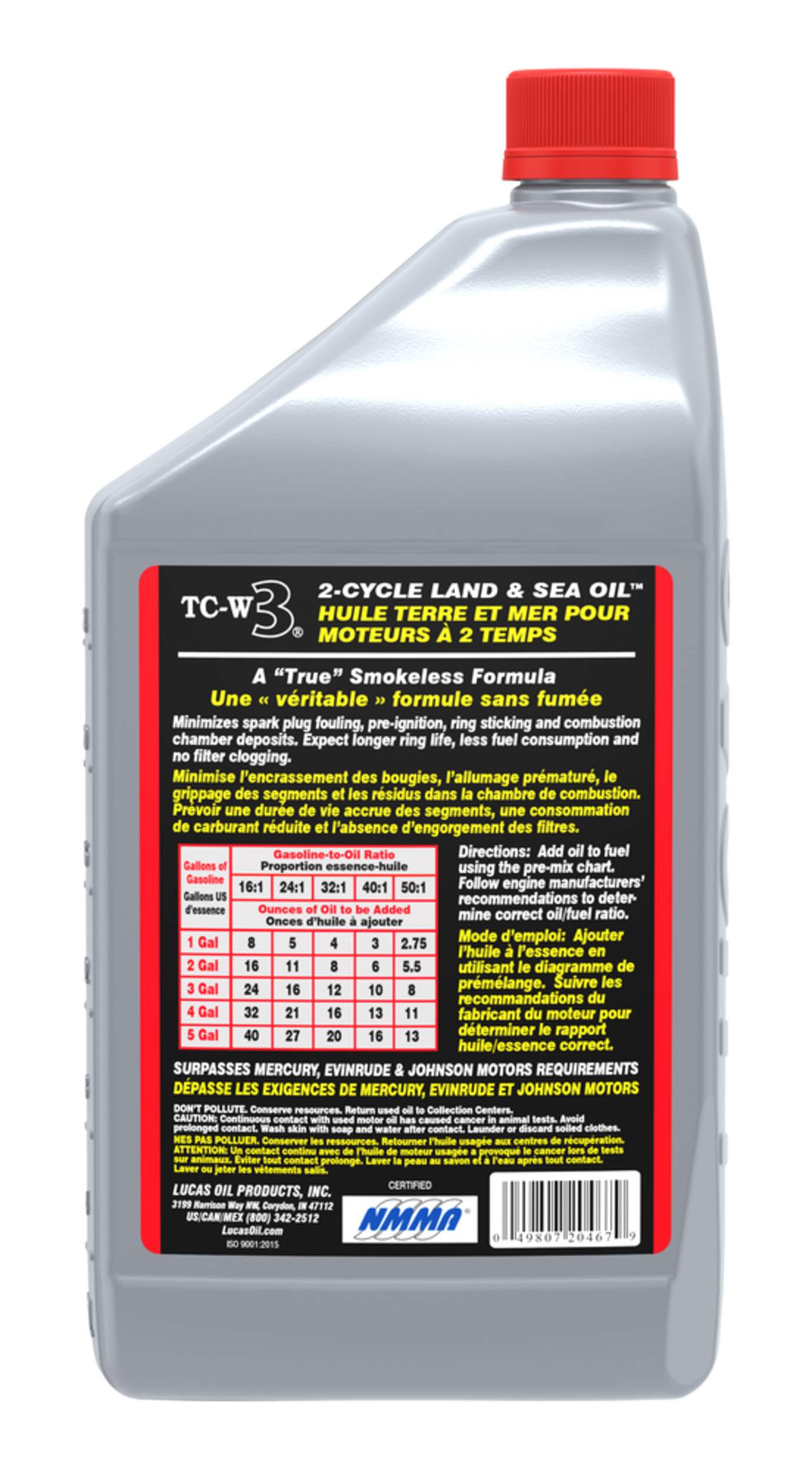 Lucas High Performance Semi-Synthetic 2-Cycle Land & Sea Oil TC-W3 has been specifically developed for Motorcycles, ATVs, Go Karts, Personal Watercraft, Outboards, Snowmobiles, Weed Eaters and Chain Saws. A "TRUE" Smokeless Formula, Lucas 2-Cycle Land & Sea Oil TC-W3 is specially formulated with high quality base oils fortified with a Lucas ashless detergent inhibitor package to minimize spark plug fouling, pre-ignition, ring sticking and combustion chamber deposits.