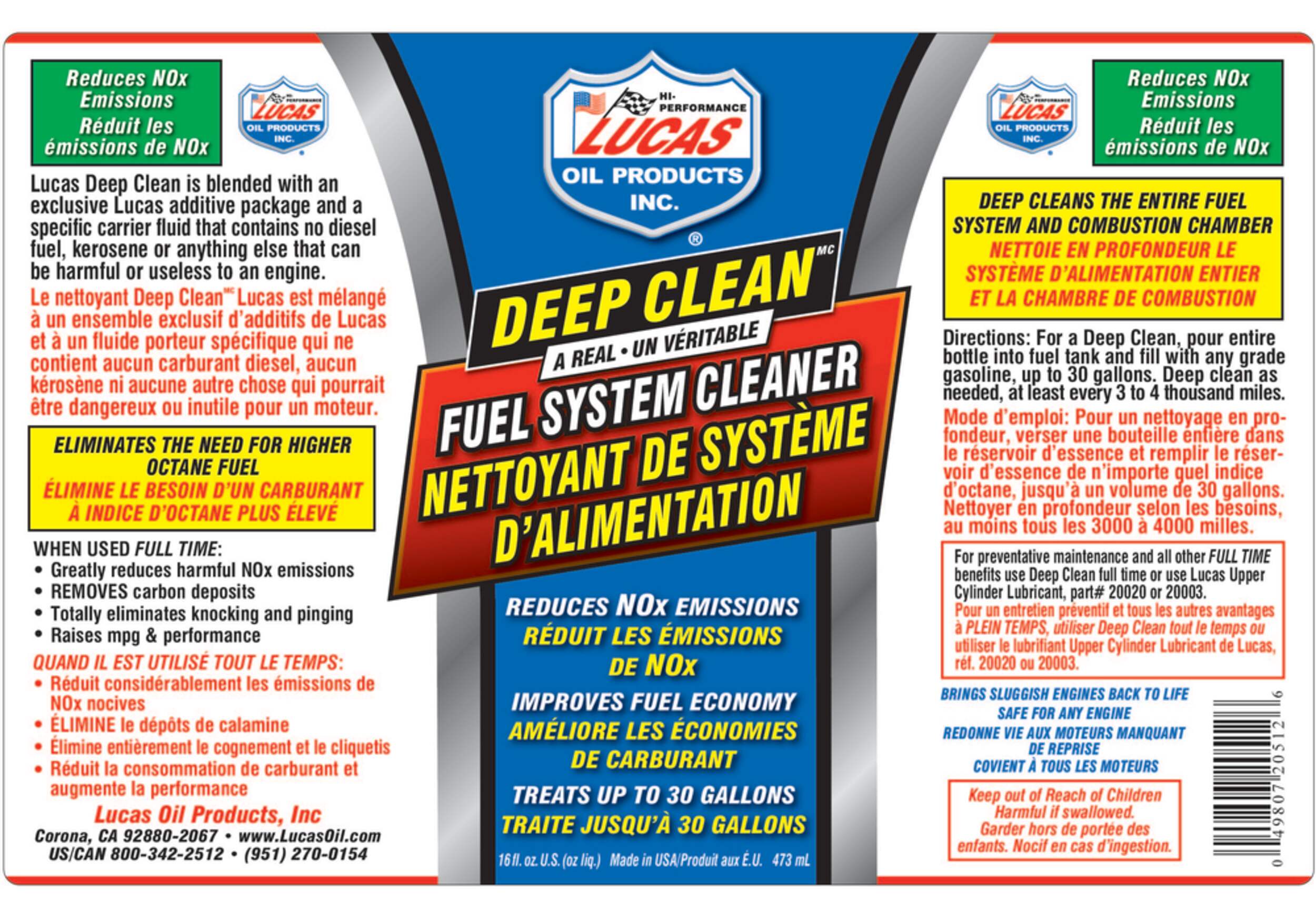 Lucas Deep Clean is blended with an exclusive Lucas additive package and specific carrier fluid that contains no diesel fuel, kerosene or anything else that can be harmful or useless to an engine. It also reduces NOx emissions, eliminates the need for higher octane fuel and deep cleans the entire fuel system and combustion chamber.