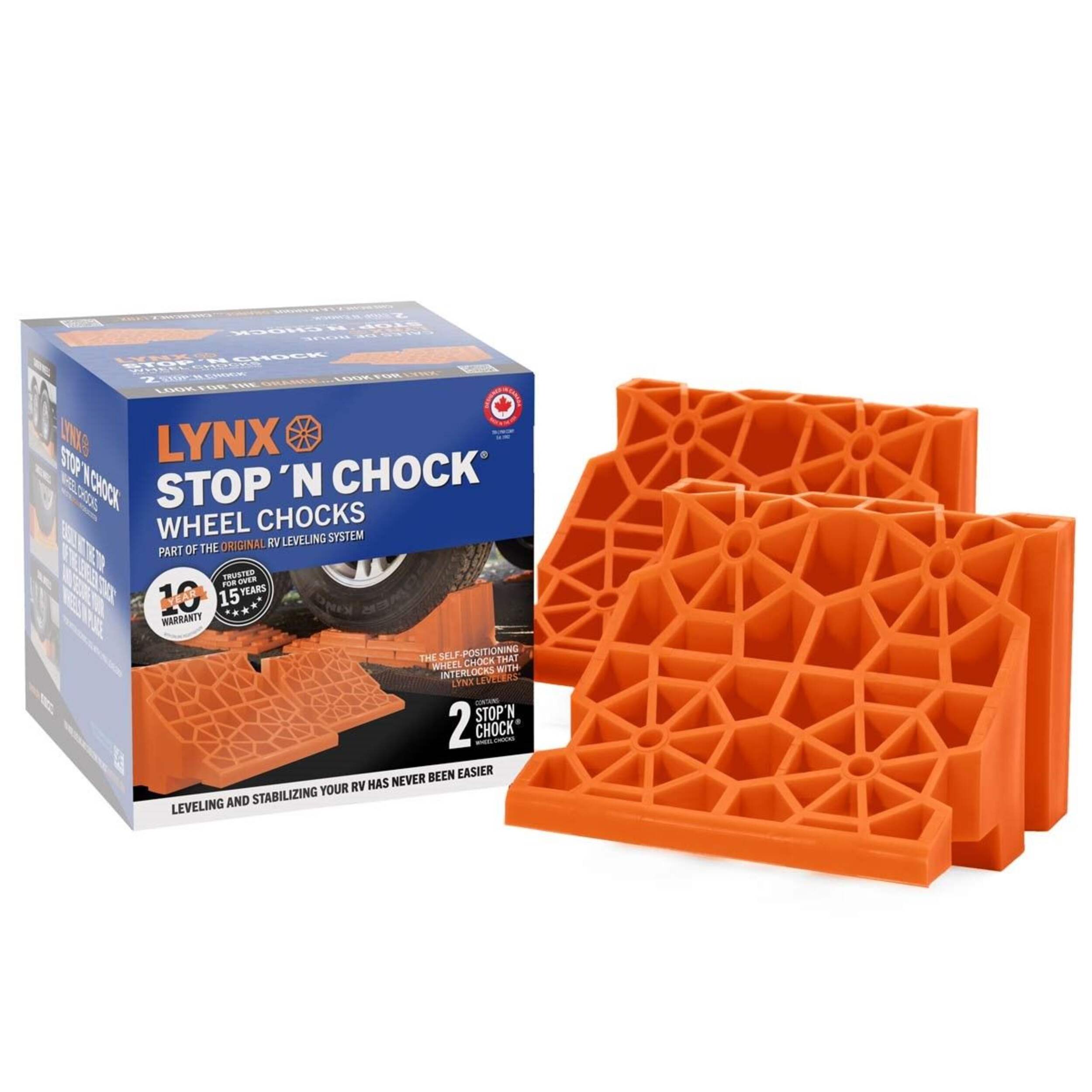 Position your RV in just the right spot when you use the Lynx Stop 'N Chock 2-Pack. Designed for use with Lynx Leveler Levelling Blocks, the set is a self-positioning wheel guide used to situate your RV easily and accurately. These interlocking wheel chocks are made of plastic, and they are simple to put in place. Use these chocks to secure an RV in place so it can be kept there without moving. Enjoy your favorite getaway with confidence with this device.