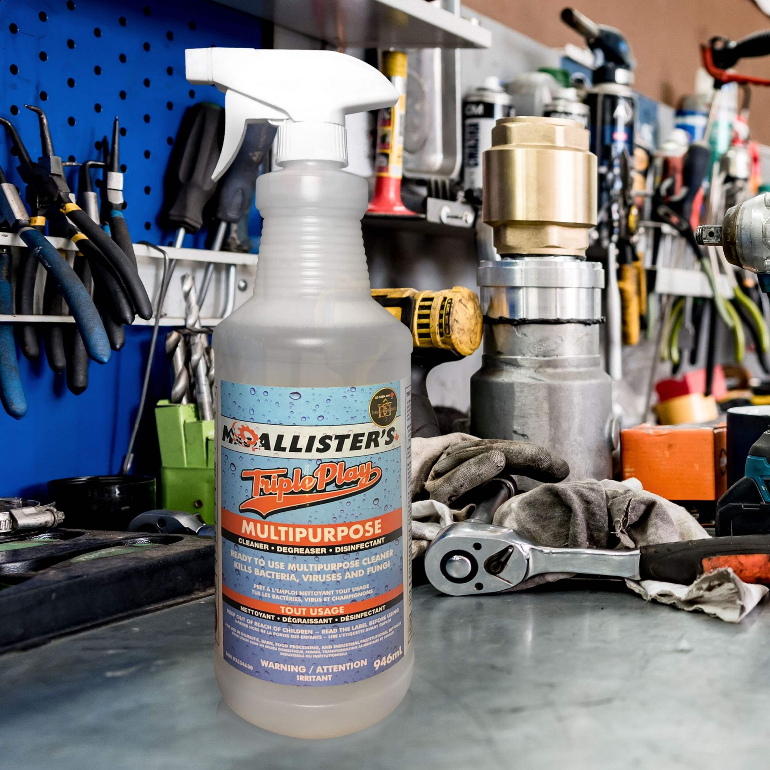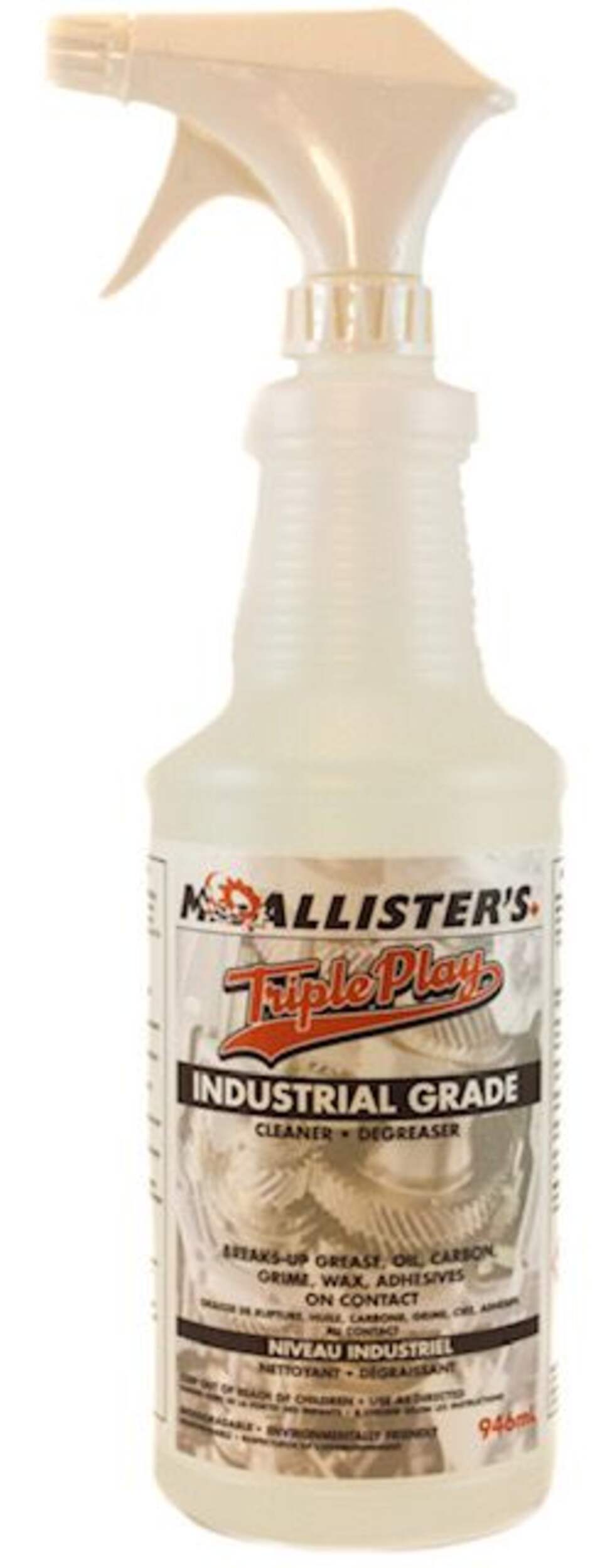 MacAllister's Triple Play cleaner lives up to its name, tackling tough grime, grease and germs in one spray. This hard working, heavy duty disinfectant spray is perfect for cleaning kitchen surfaces, bathrooms, floors and more. The clear formula doesn't leave behind any sticky residue, allowing you to clean and disinfect quickly and easily without having to worry about streaks or haze. Keep this workhorse spray in your cleaning arsenal for grease splatters on the stove, grime buildup around sinks and tubs, and killing 99.9% of bacteria on high touch surfaces.