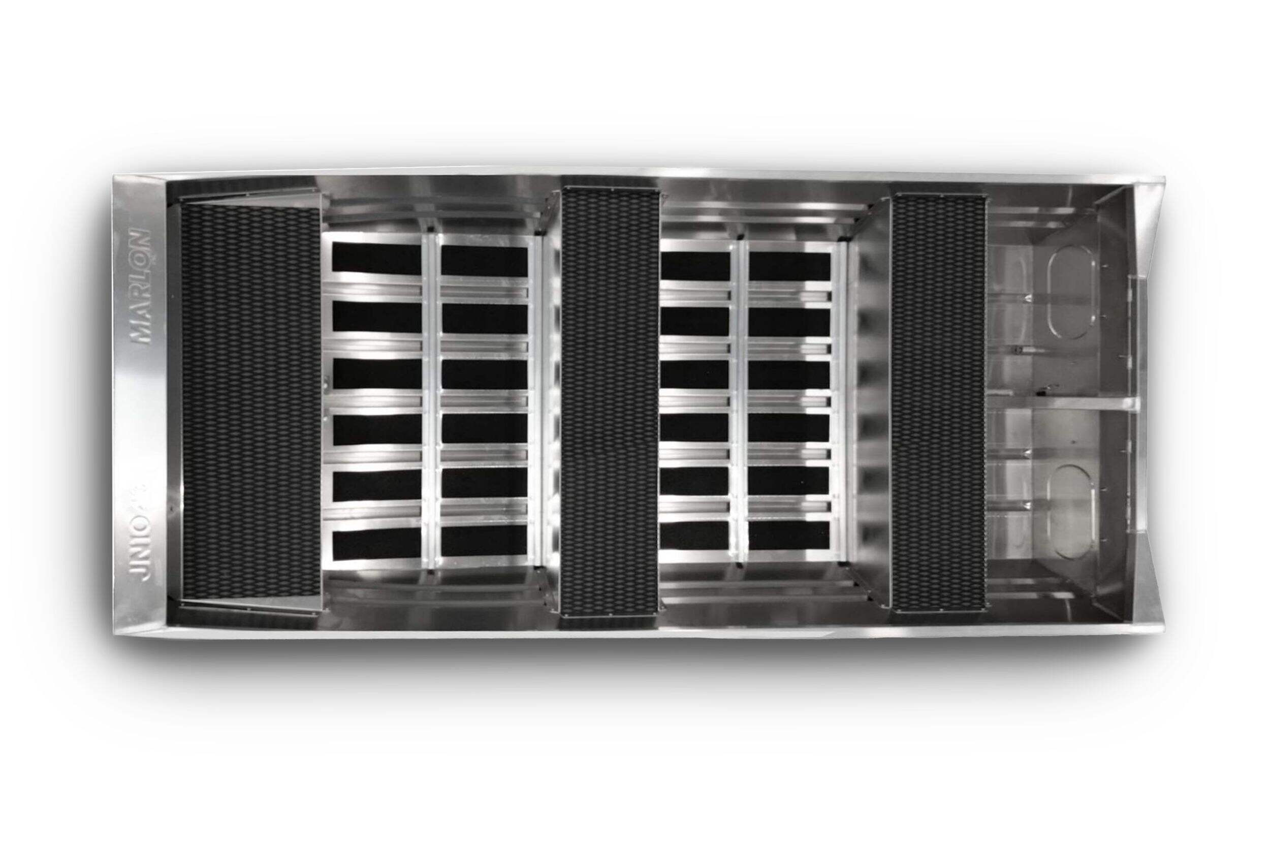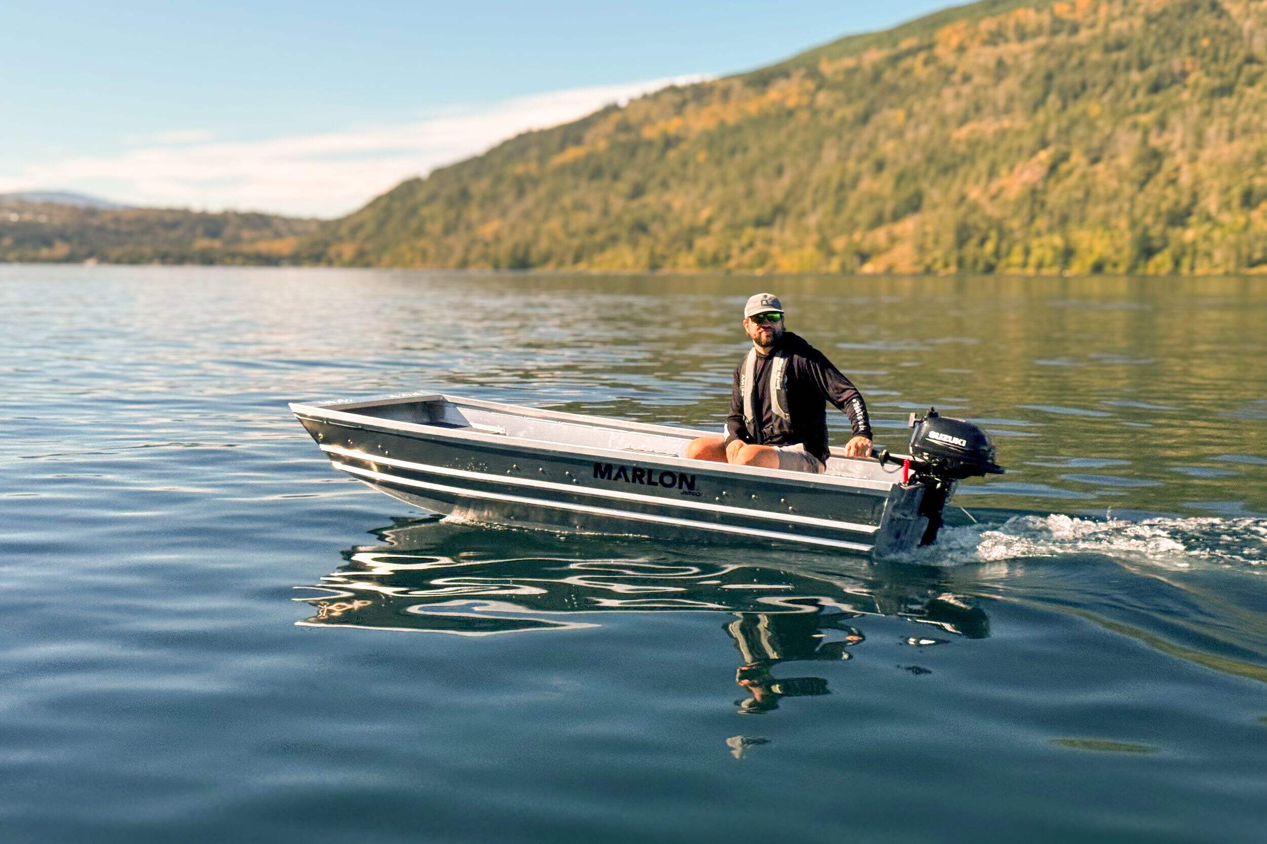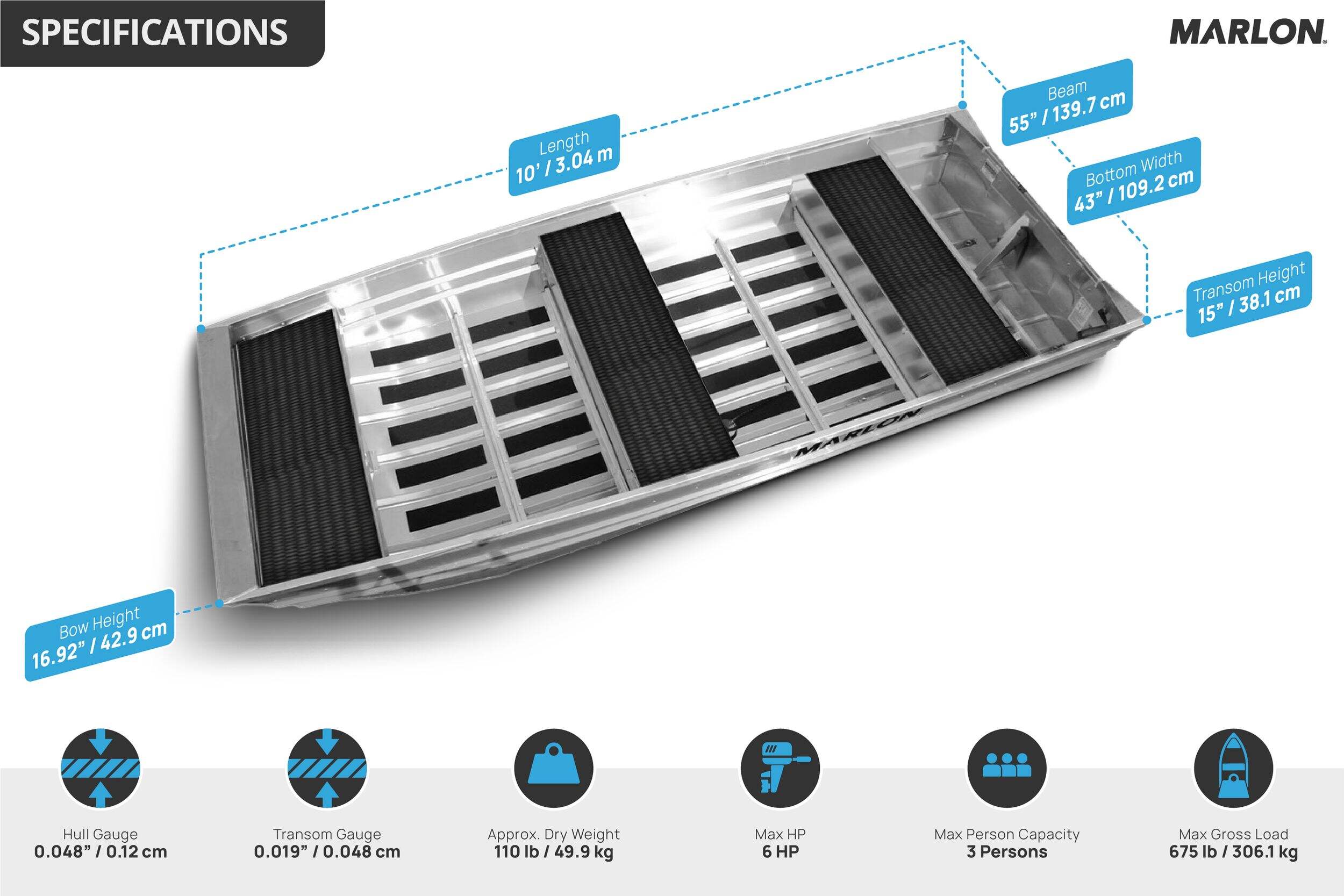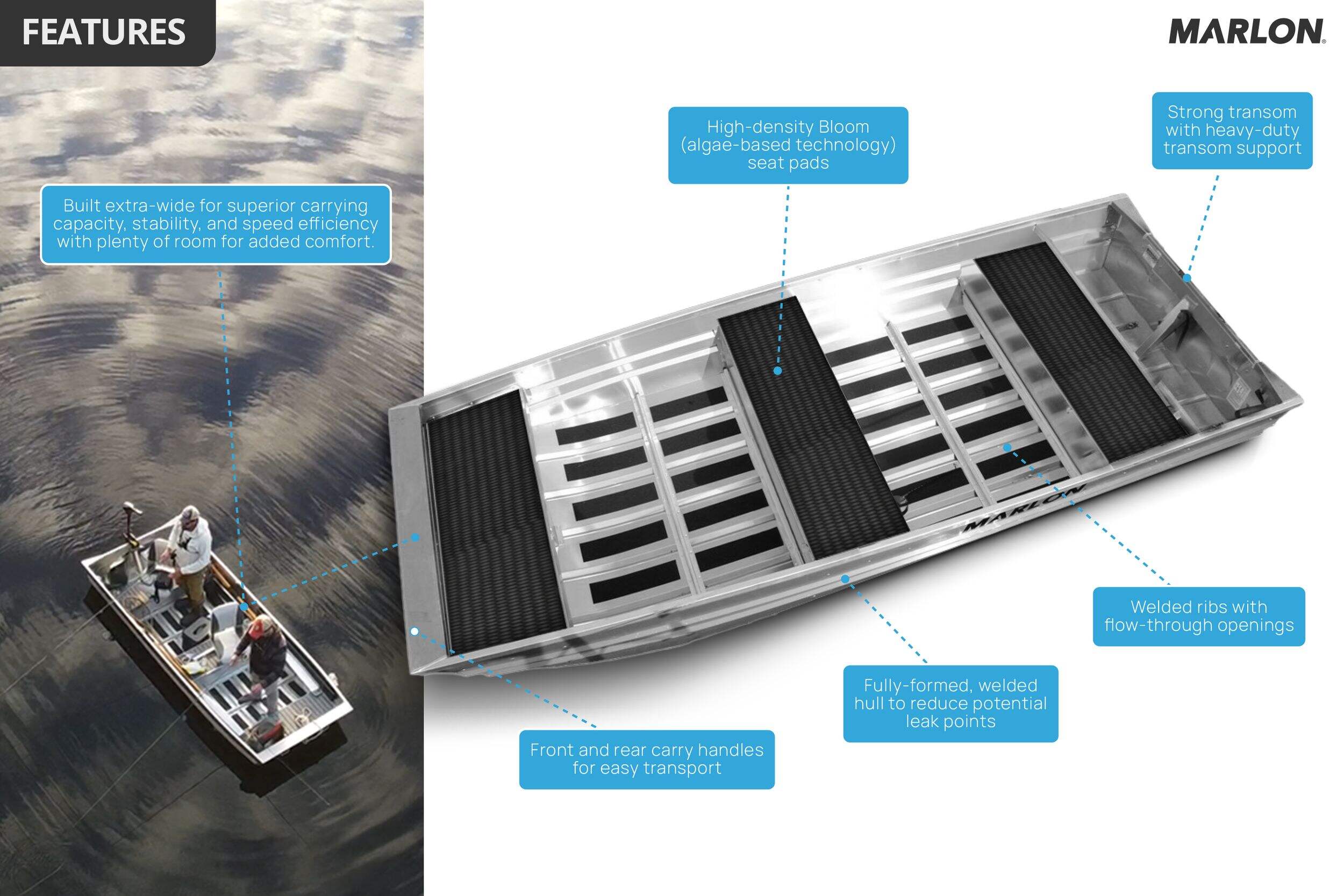 Marlon Jon boats are light, wide, stable, and have a realistic carrying capacity. No other Jon boat matches their width and beam while being easy to maneuver single-handedly. With a stamped transom for extra strength and an optional high-back seat with a detachable swivel assembly, Marlon Jon boats are known for their stability, even in rough waters. Perfect for those seeking a lightweight, flat-bottom boat with stability, portability, space, and extra carrying capacity. Marlon SP boats come with high-density EVA seat pads, black nonskid flooring, and Marlon decals.