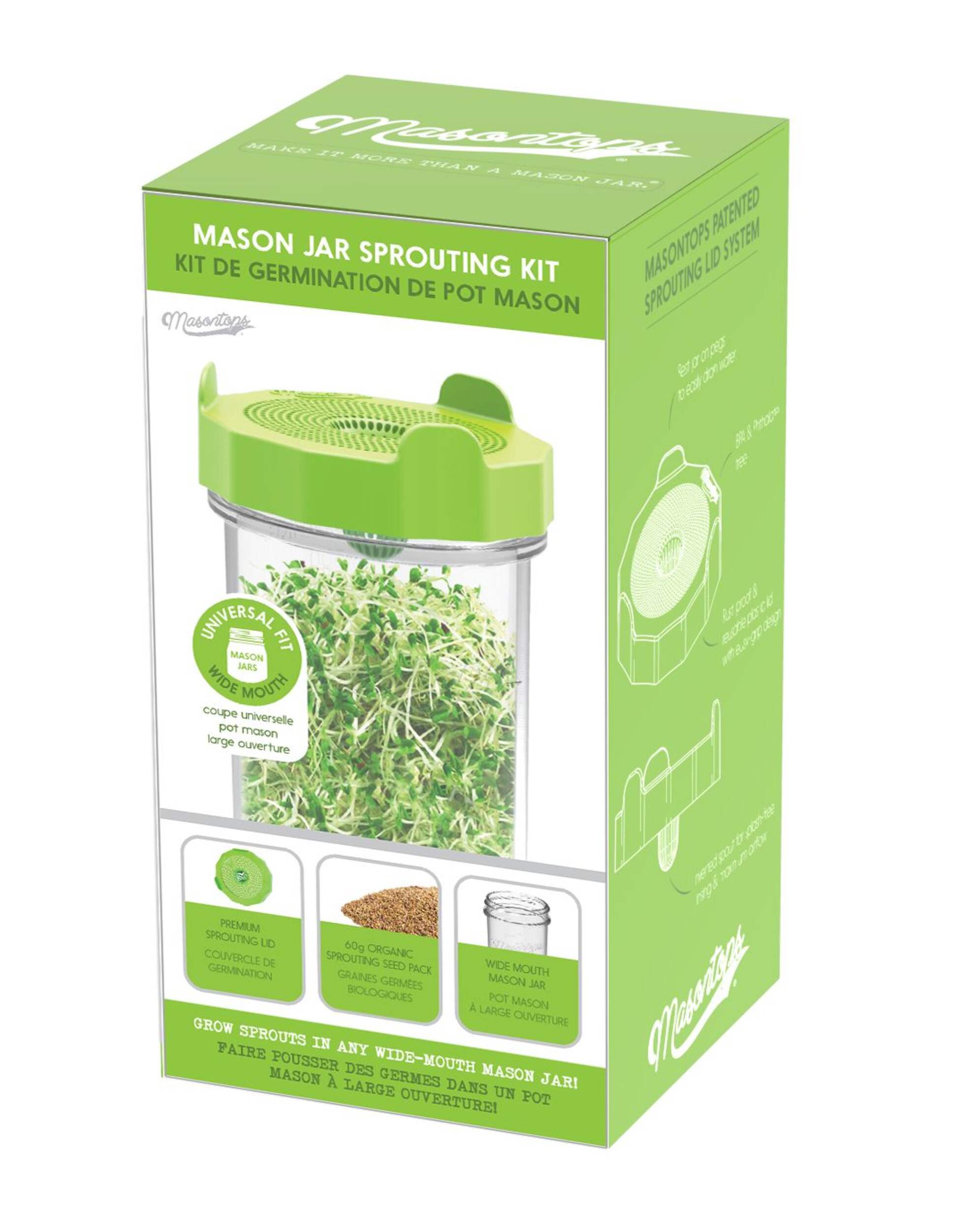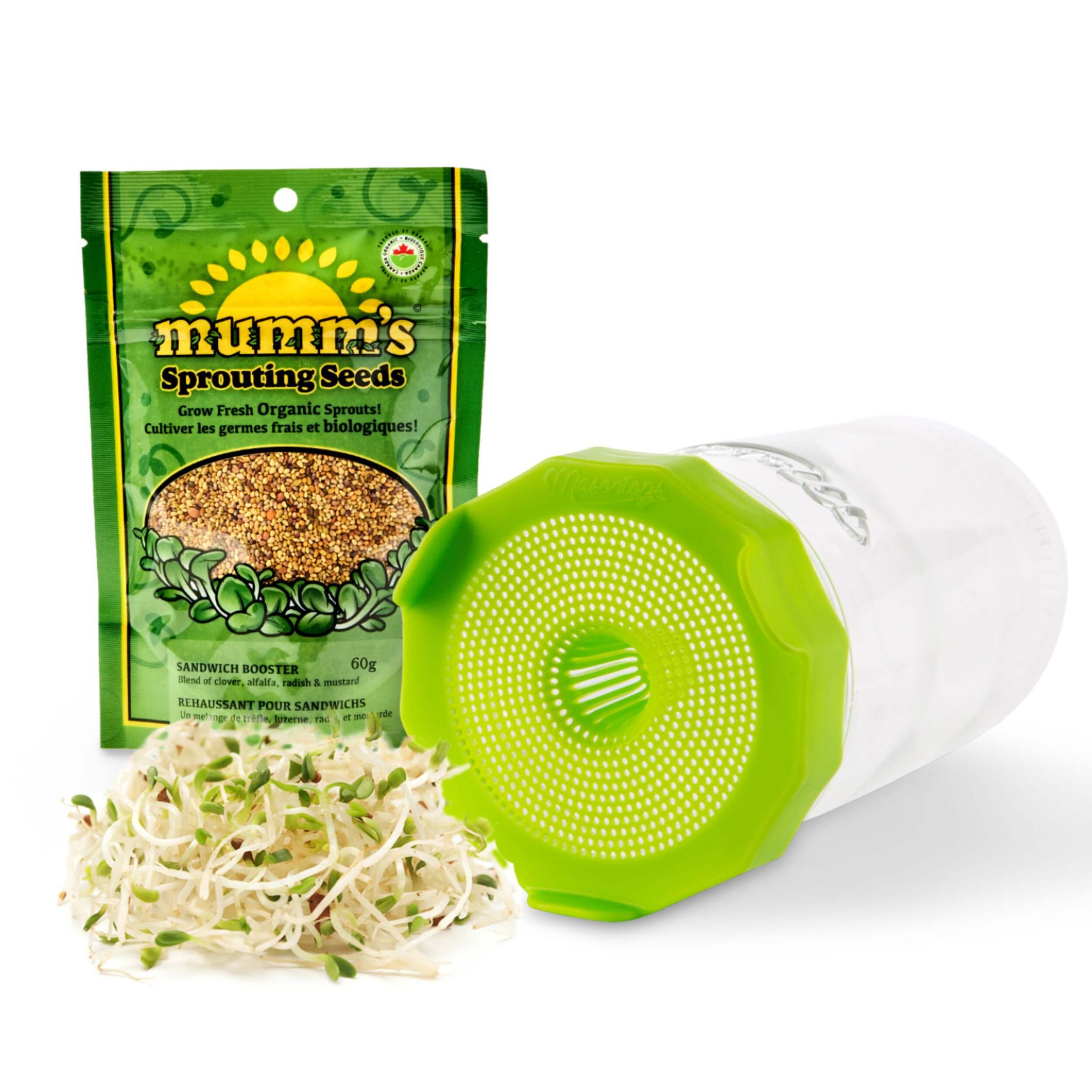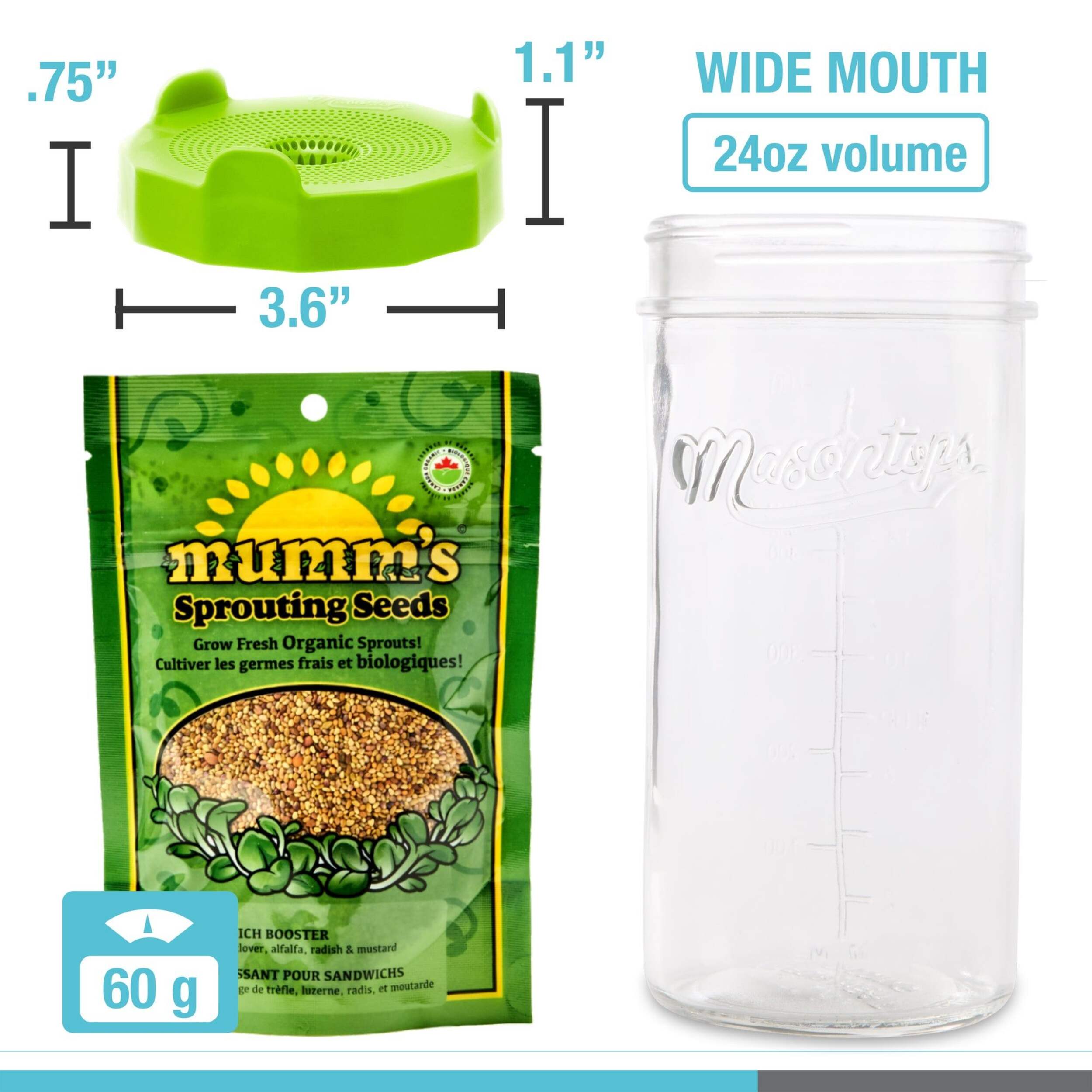 Includes: 1 x 24 oz Masontops jar, 1 x Bean Screen sprouting lid, and 1 x 60g pack of Sandwich Booster sprouting seeds