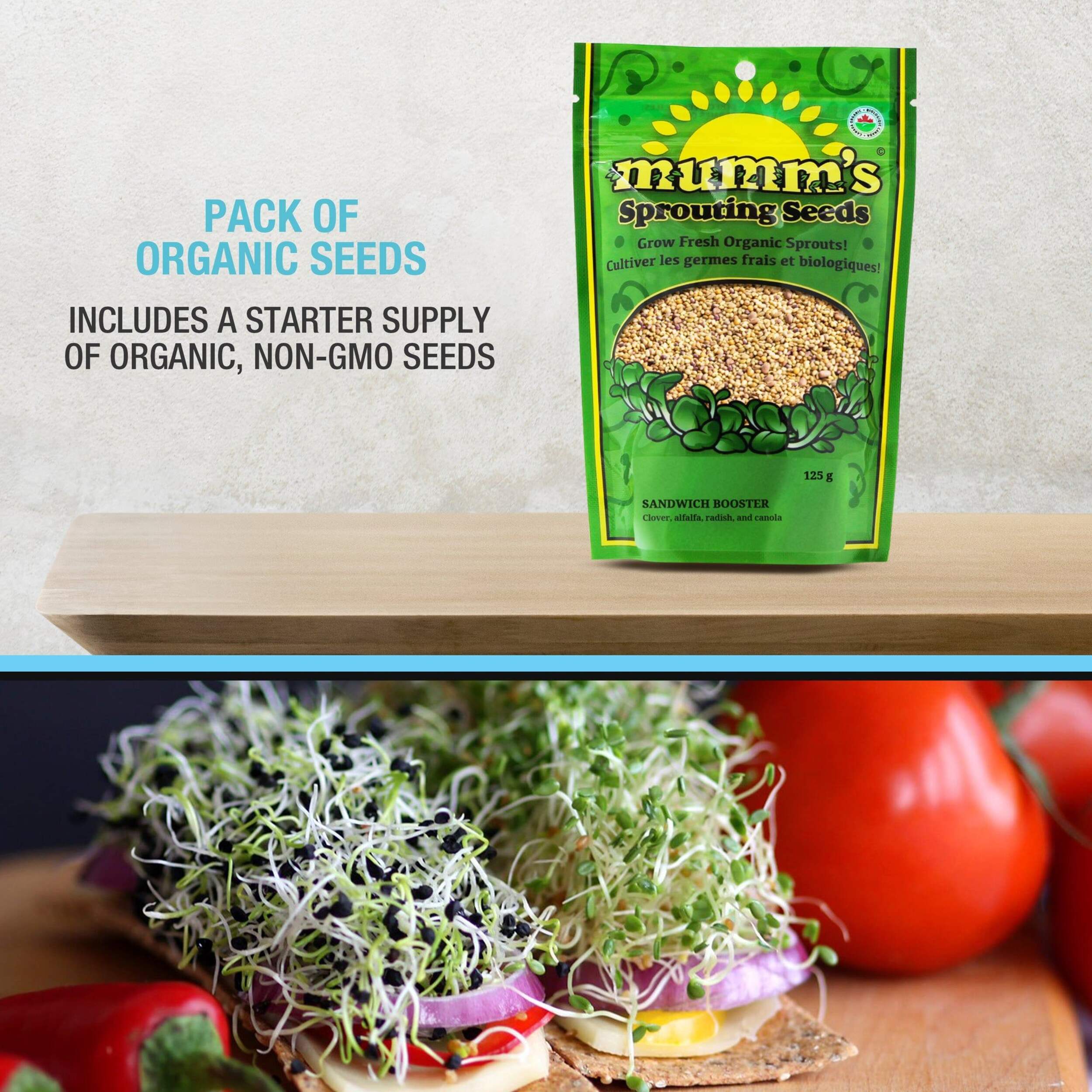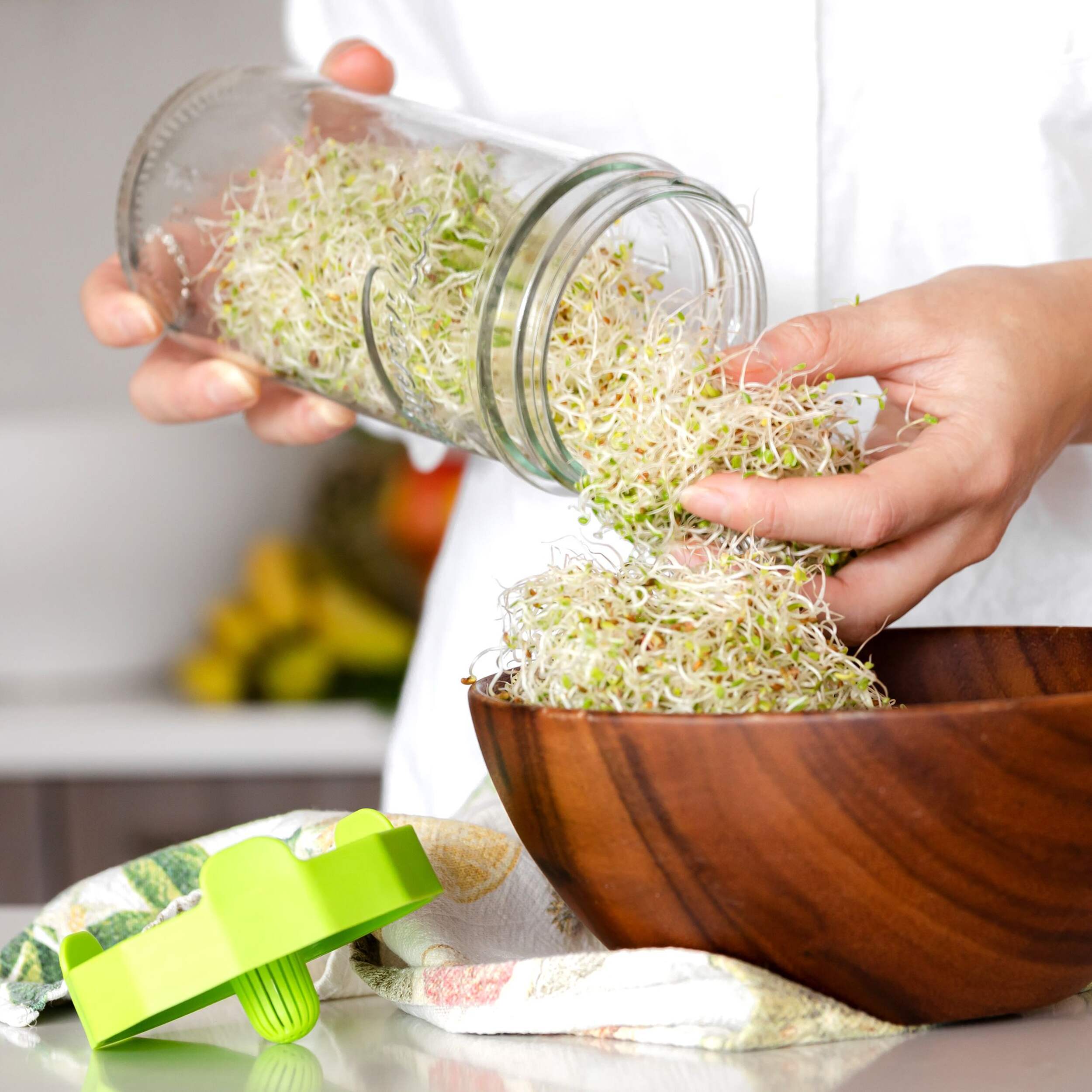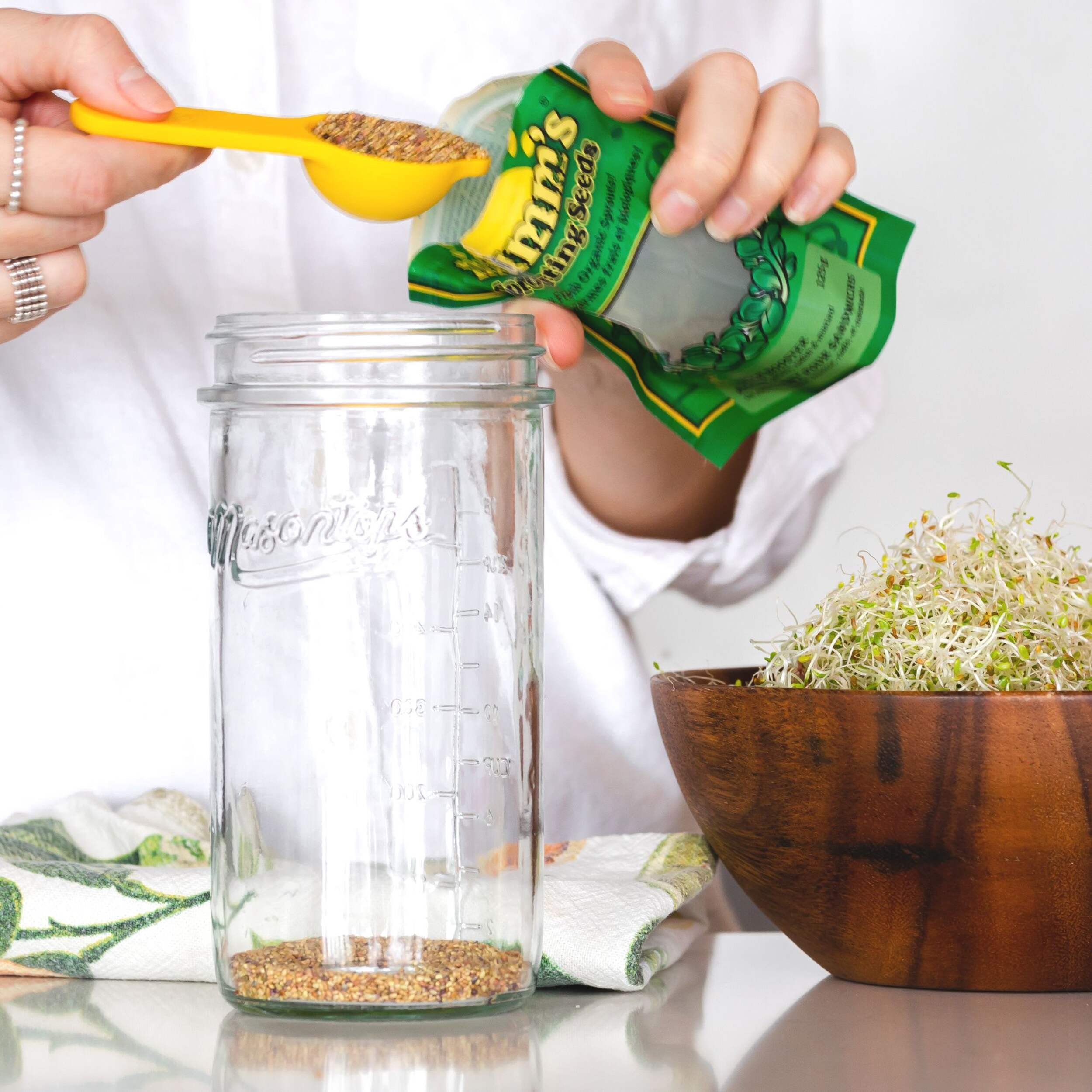 Includes: 1 x 24 oz Masontops jar, 1 x Bean Screen sprouting lid, and 1 x 60g pack of Sandwich Booster sprouting seeds