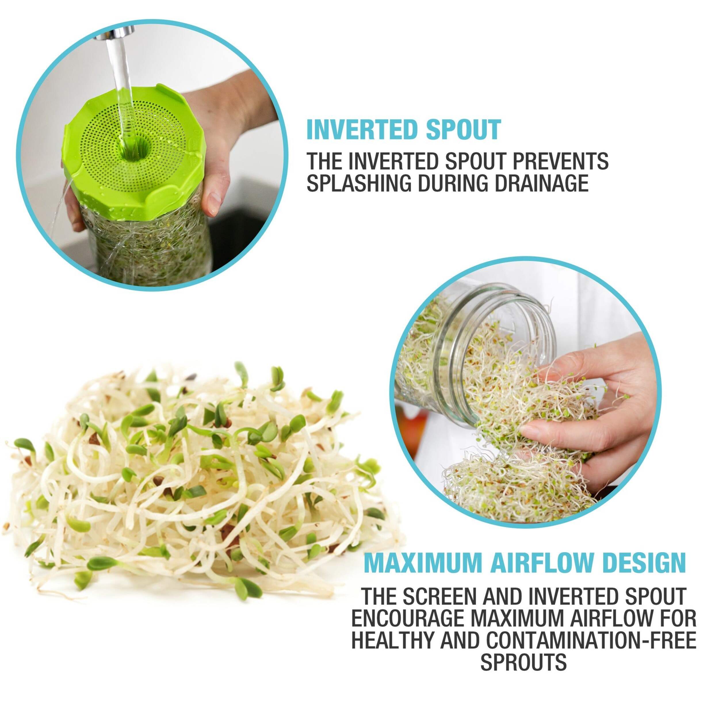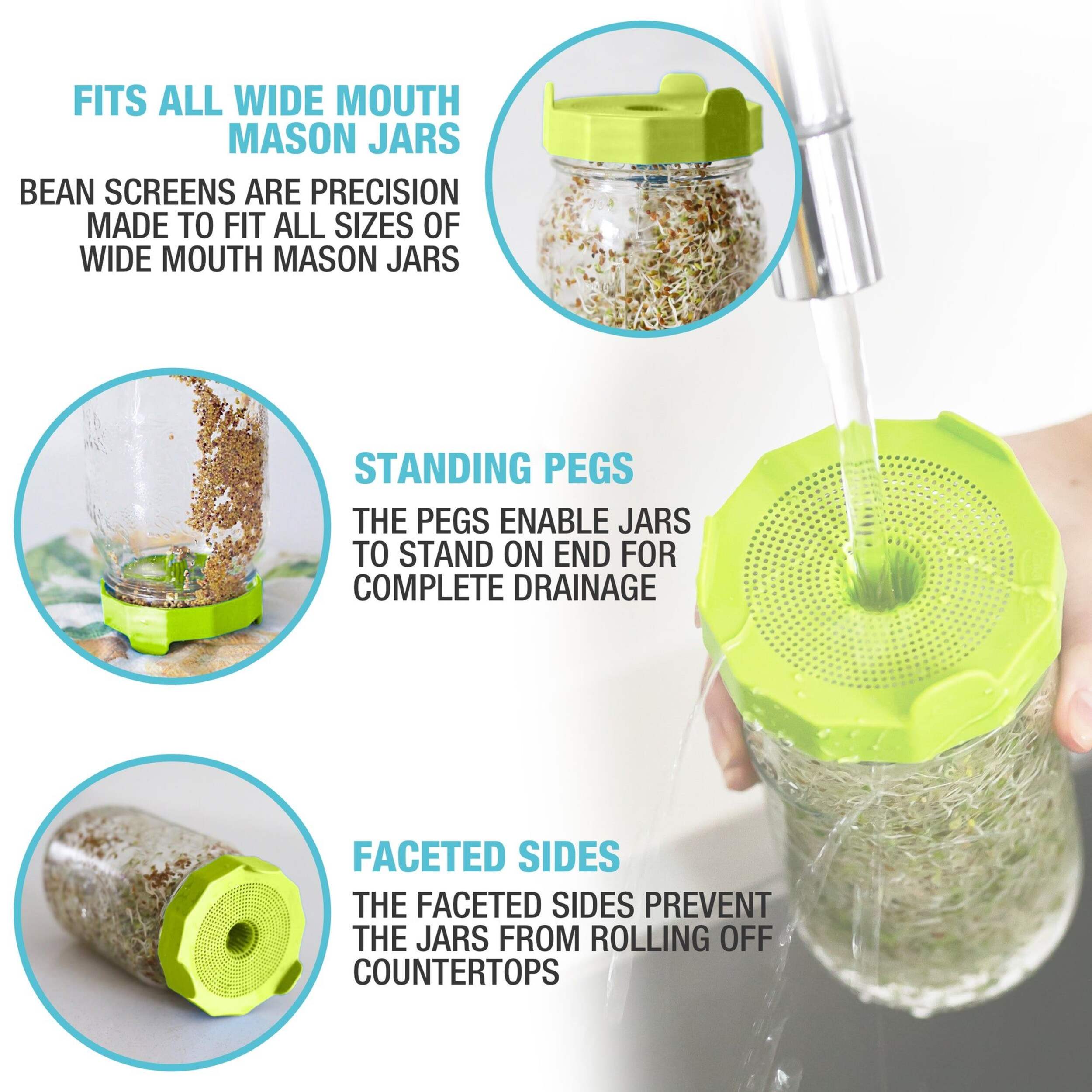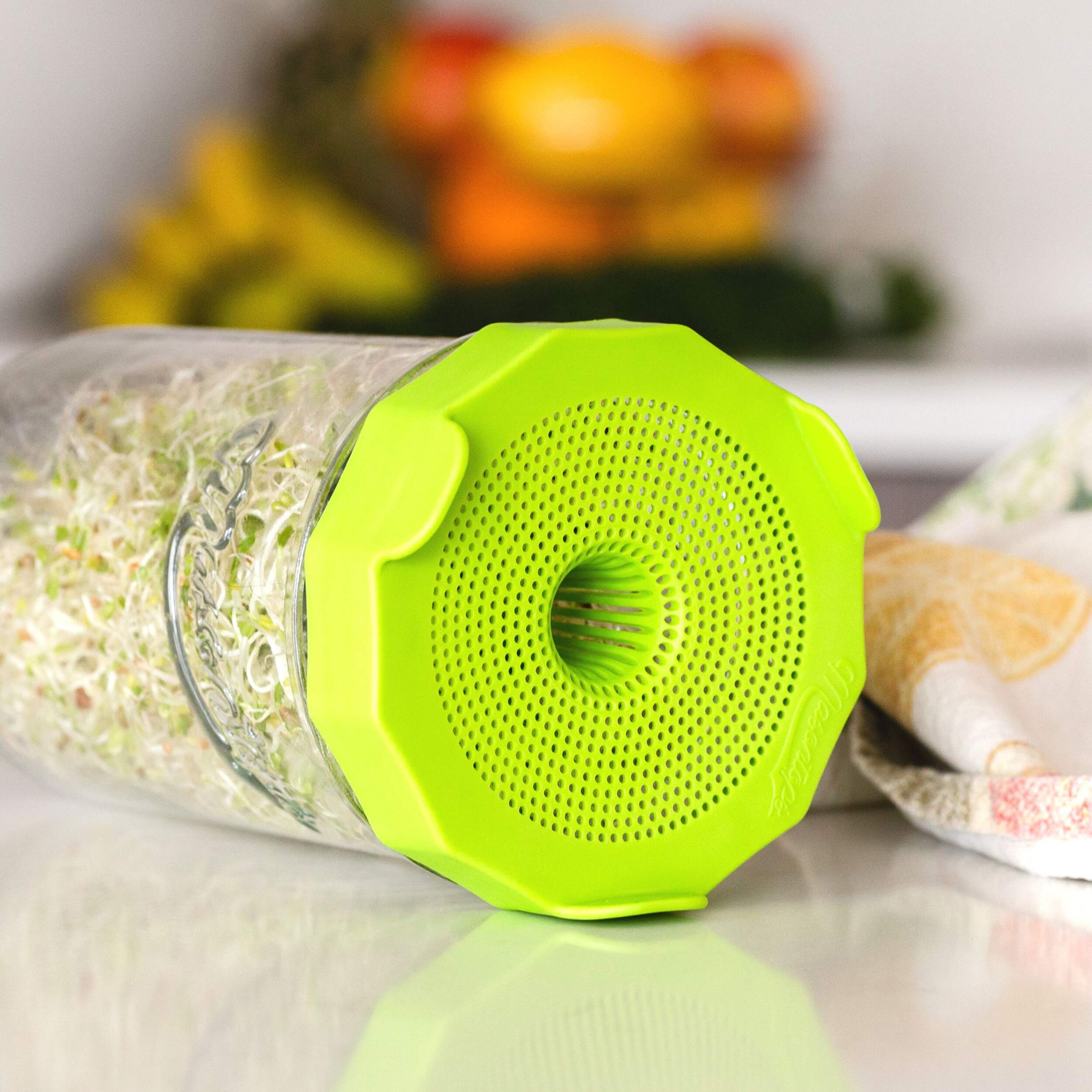 Grow your own sprouts at home with the Masontops Single Mason Jar Sprouting Kit. Easy to use, this sprouting kit comes with everything you need to start sprouting. This bean sprouting kit can also be used with any sprouting seed, including alfalfa, broccoli and more, allowing you to enjoy fresh, crisp, nutritious sprouts right from your countertop in as little as two to five days. The anti-roll feature on the faceted sides helps prevent the jar from rolling off edges, as well as pegs, so the jar can be left upside down for optimal drainage.