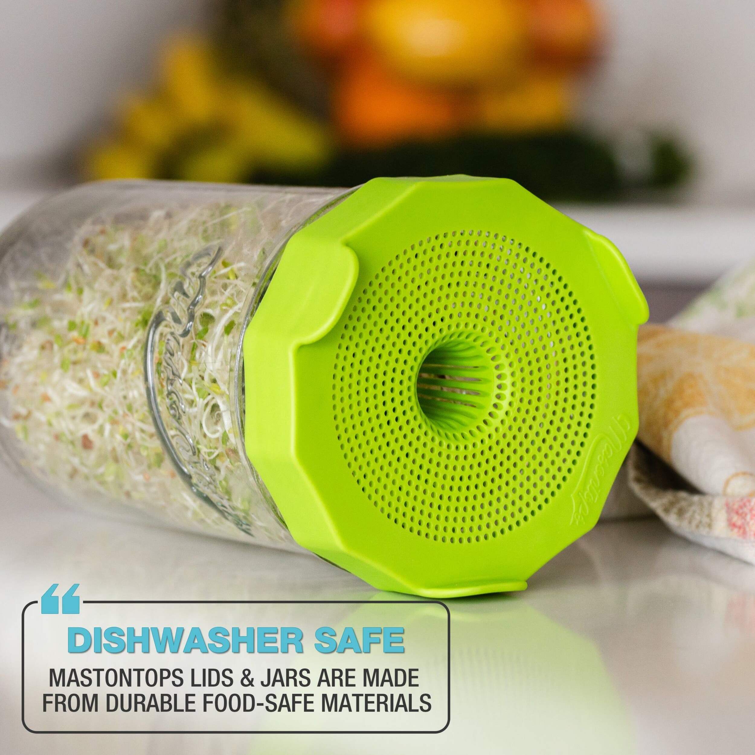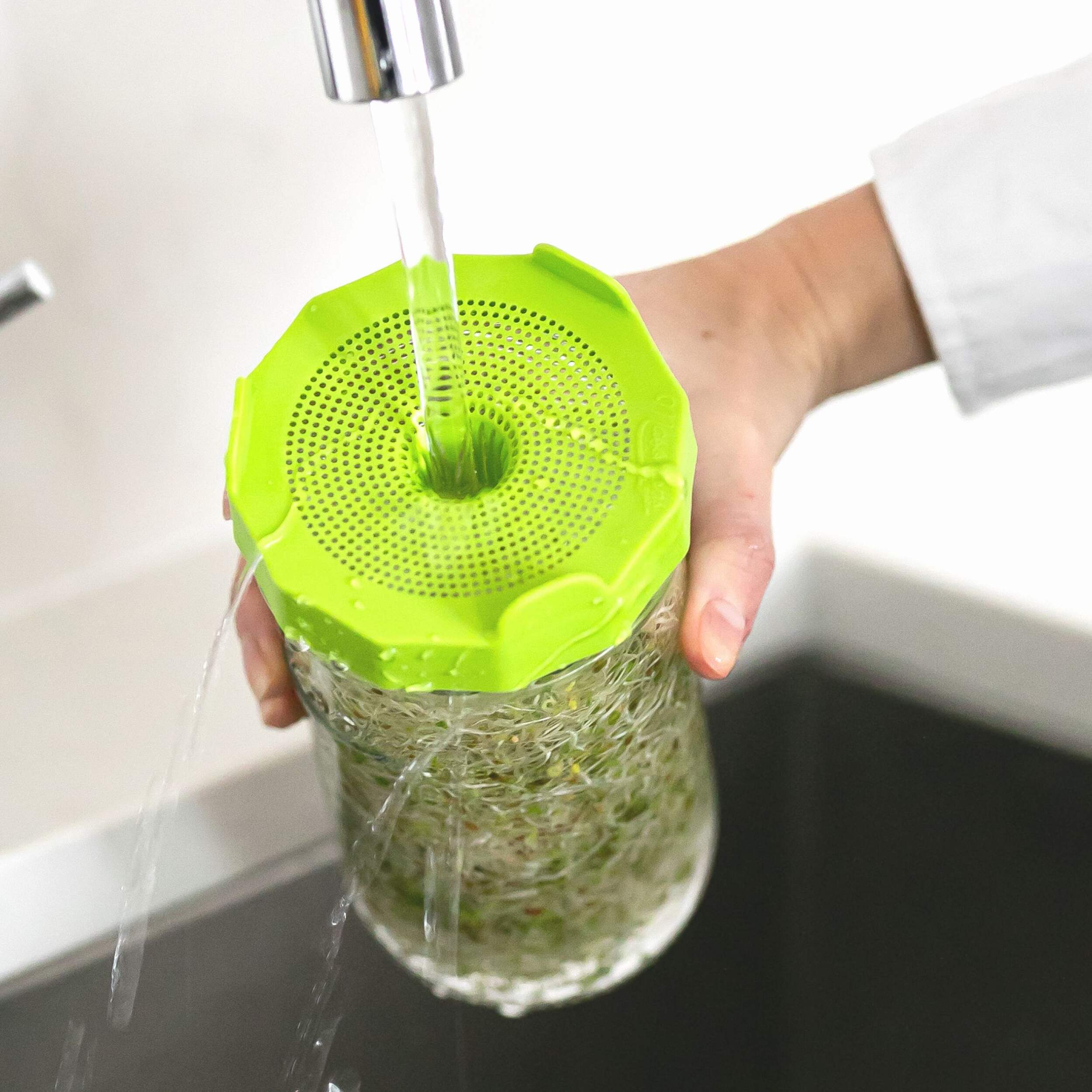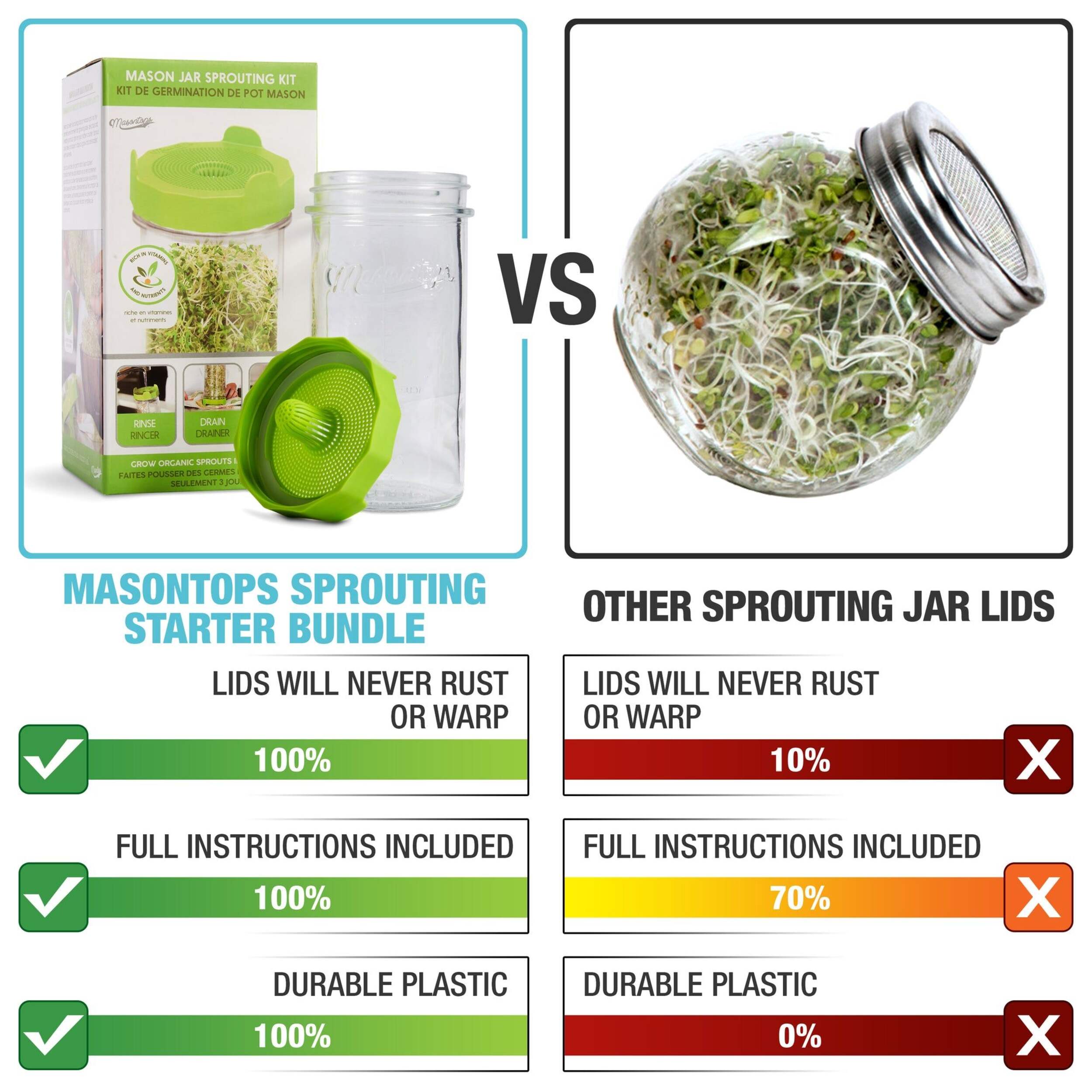 Grow your own sprouts at home with the Masontops Single Mason Jar Sprouting Kit. Easy to use, this sprouting kit comes with everything you need to start sprouting. This bean sprouting kit can also be used with any sprouting seed, including alfalfa, broccoli and more, allowing you to enjoy fresh, crisp, nutritious sprouts right from your countertop in as little as two to five days. The anti-roll feature on the faceted sides helps prevent the jar from rolling off edges, as well as pegs, so the jar can be left upside down for optimal drainage.