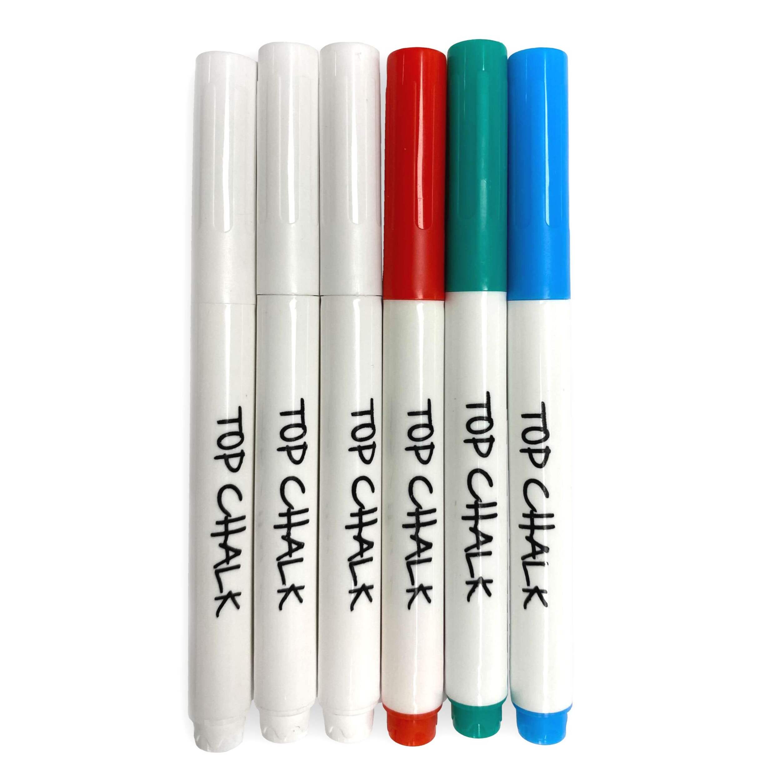 These vibrant Fine-Point Liquid Chalk Markers can be used to write and erase on chalkboards, LED boards, glass, and more. Any writing can be wiped away with a damp cloth, as these markers will not leave stains on chalkboard surfaces.