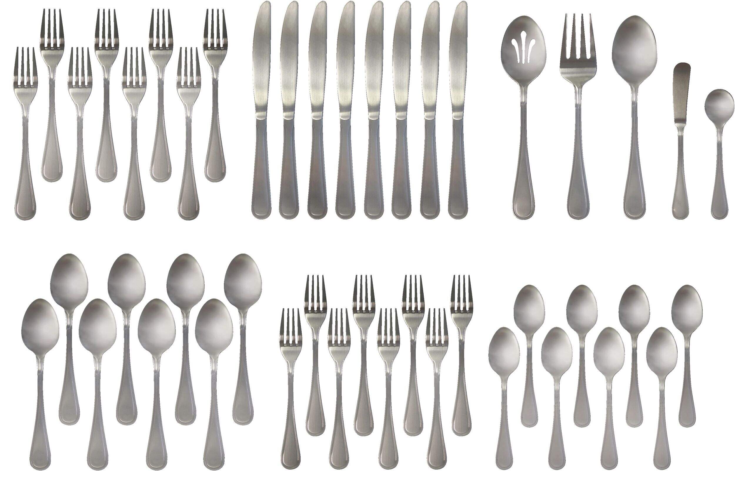 Set includes: 8 salad forks, 8 dinner forks, 8 dinner knives, 8 dinner spoons, 8 teaspoons, 1 solid spoon, 1 slotted spoon, 1 fork, 1 sugar spoon, 1 butter knife