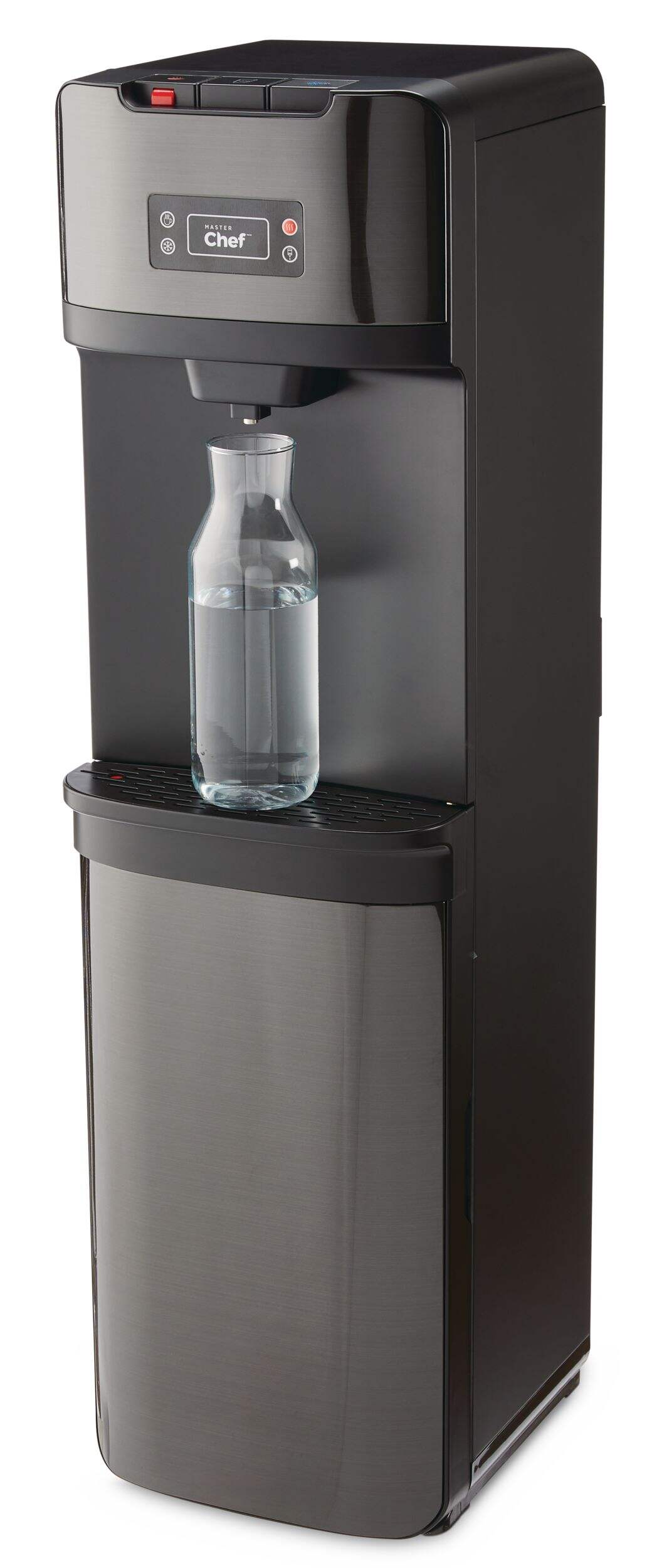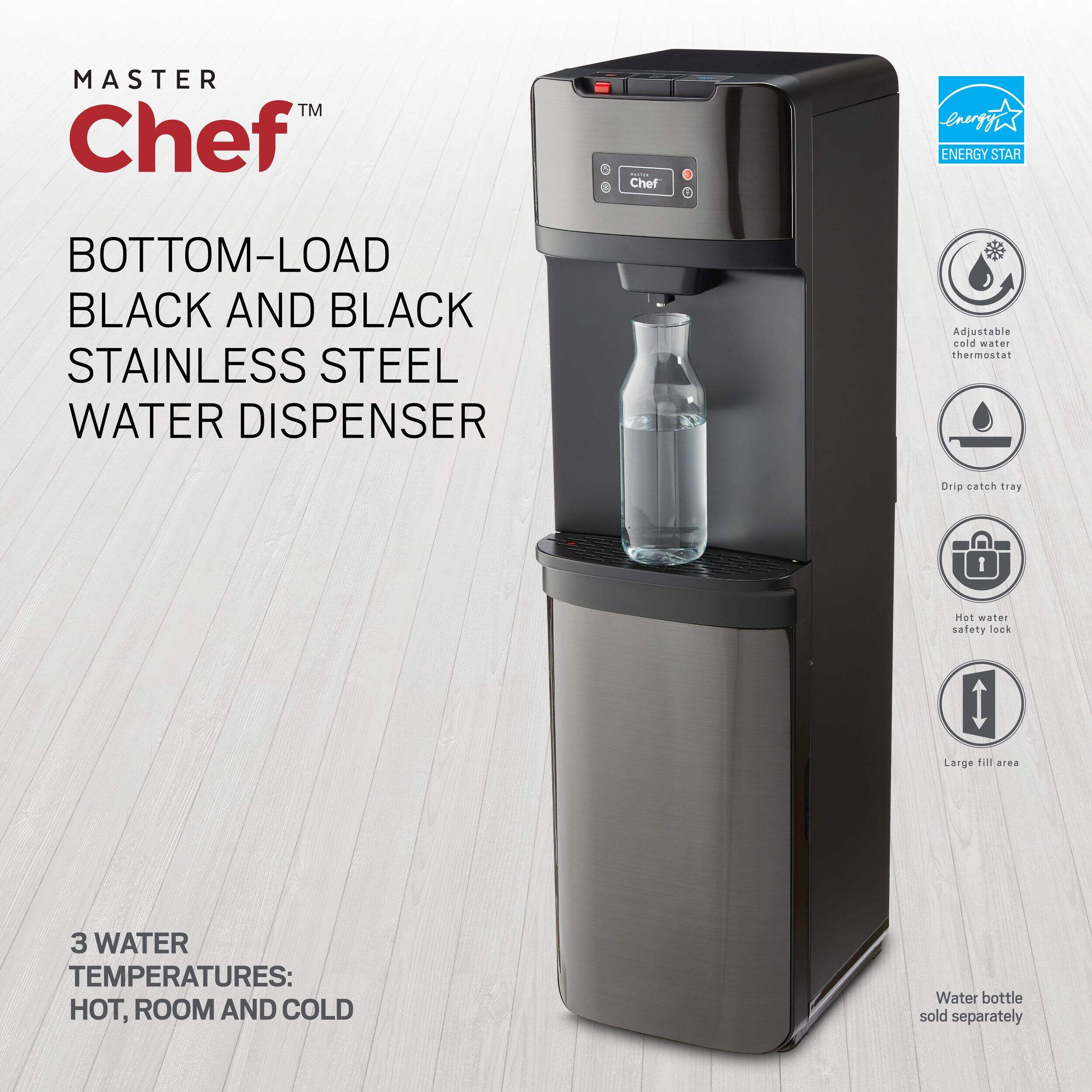 The Master Chef Bottom Load Water Cooler/Dispenser blends seamlessly into any kitchen or office with its black and stainless steel design. Its high-efficiency compressor, adjustable cold thermostat, and stainless steel reservoirs provide customized cooling and superior reliability. As an ENERGY STAR® compliant appliance, it operates in an environmentally friendly manner.