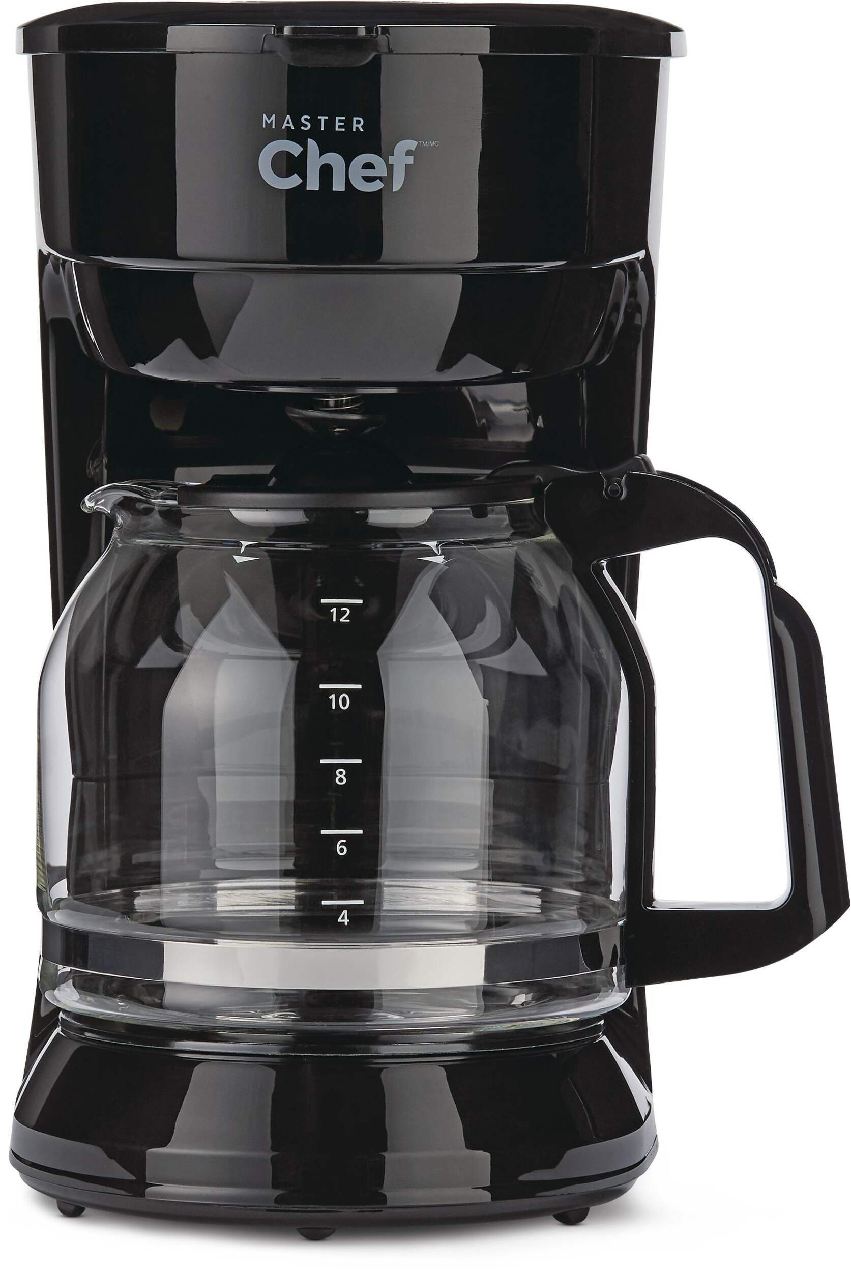 When your day must begin with a great cup of coffee, make it the quick and easy way with this MASTER Chef Coffee Maker. Elegant enough to have a permanent spot on your kitchen countertop or office credenza, this stylish coffee maker has a non-stick warming plate, a pause-and-pour feature, and a heat-resistant glass carafe. With a capacity of up to 12 cups of brewed coffee, this black coffee maker will satisfy your morning needs.