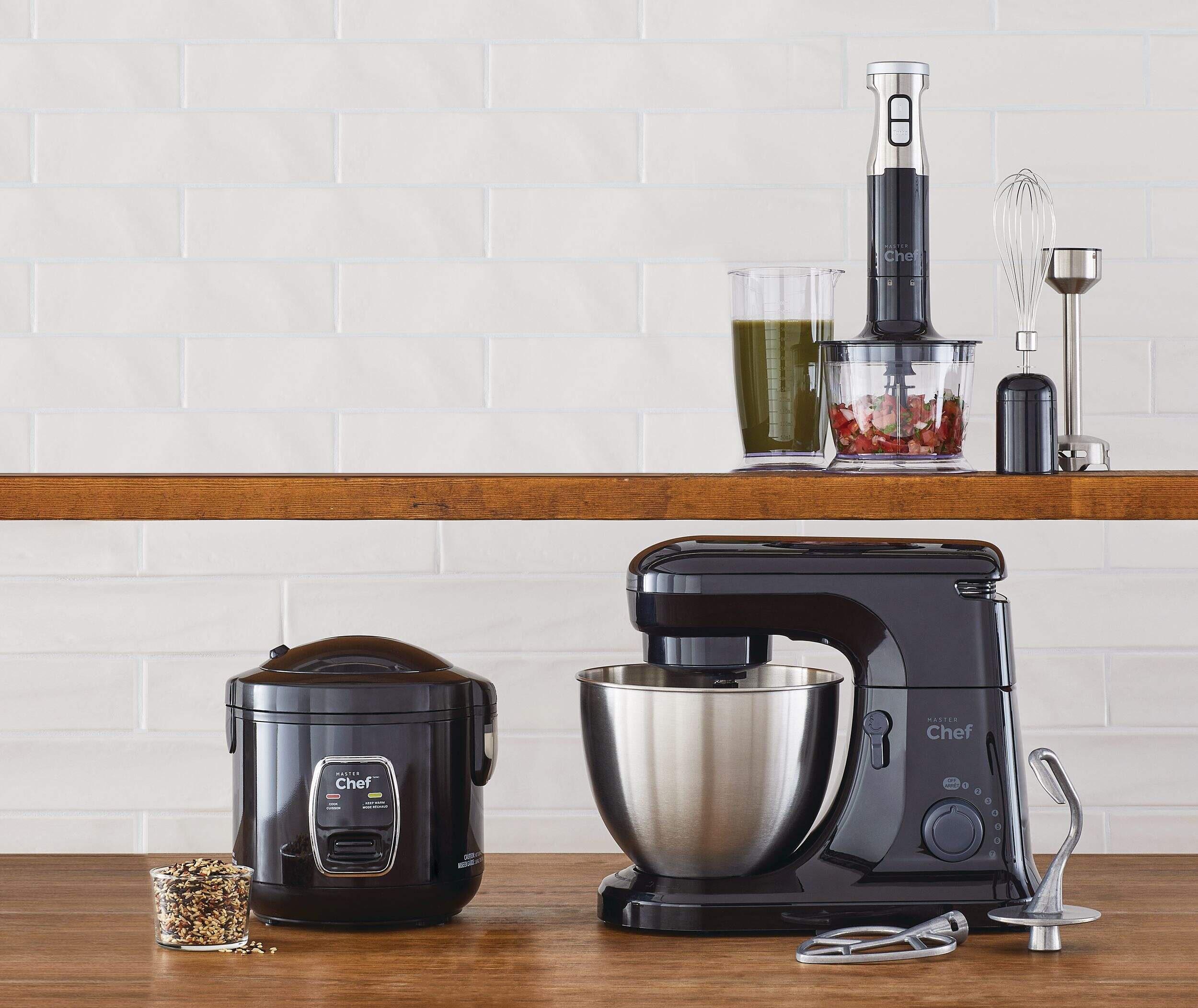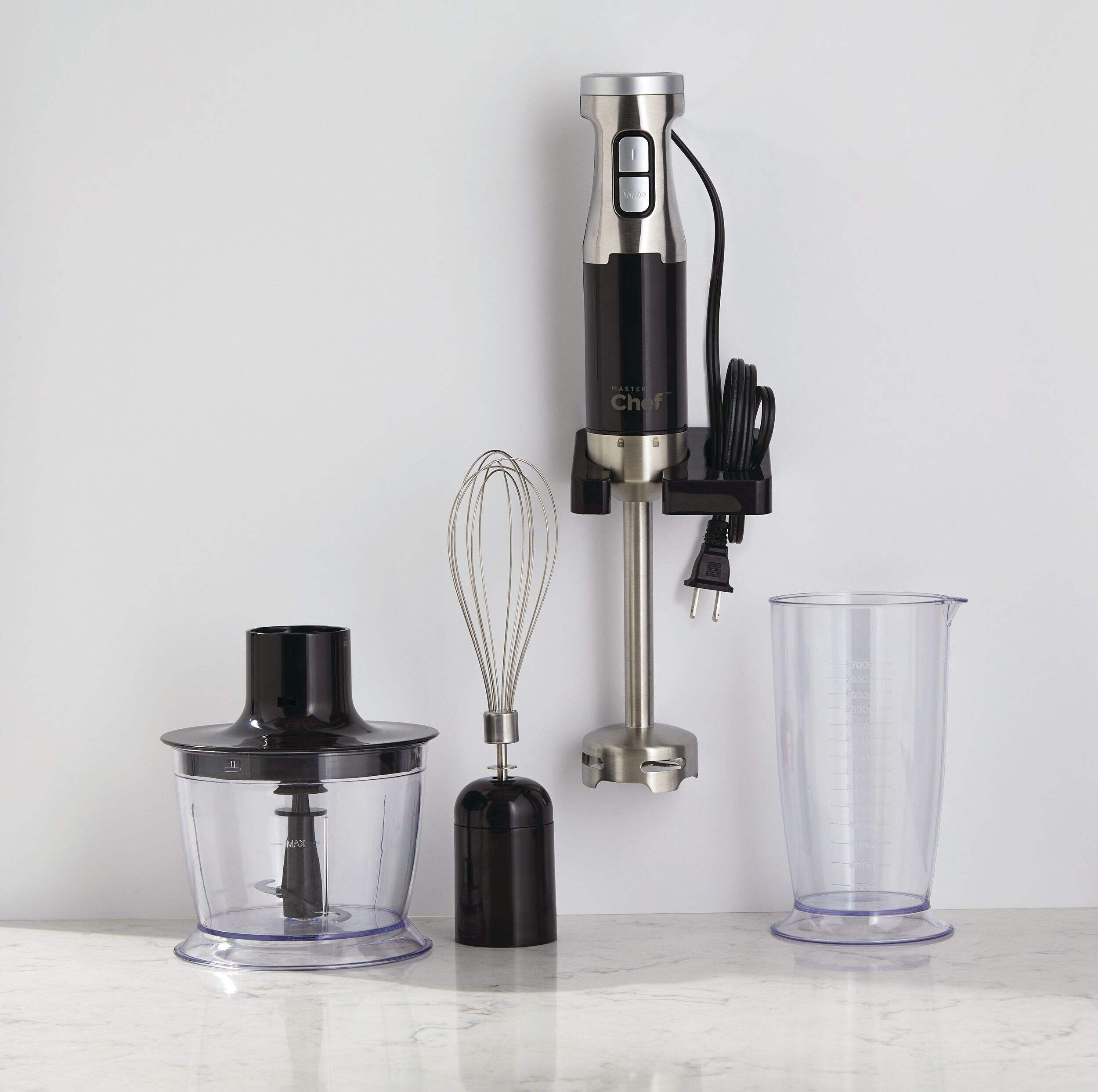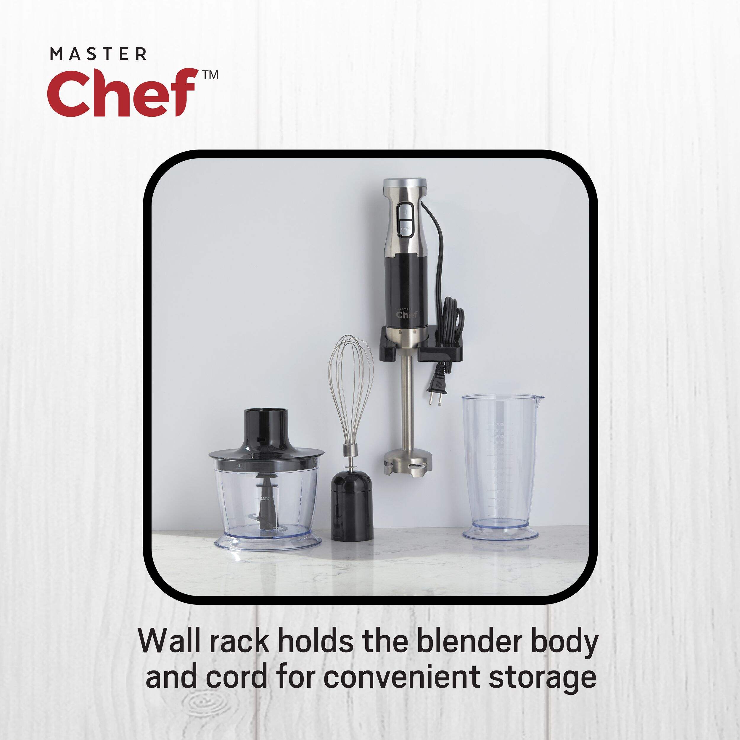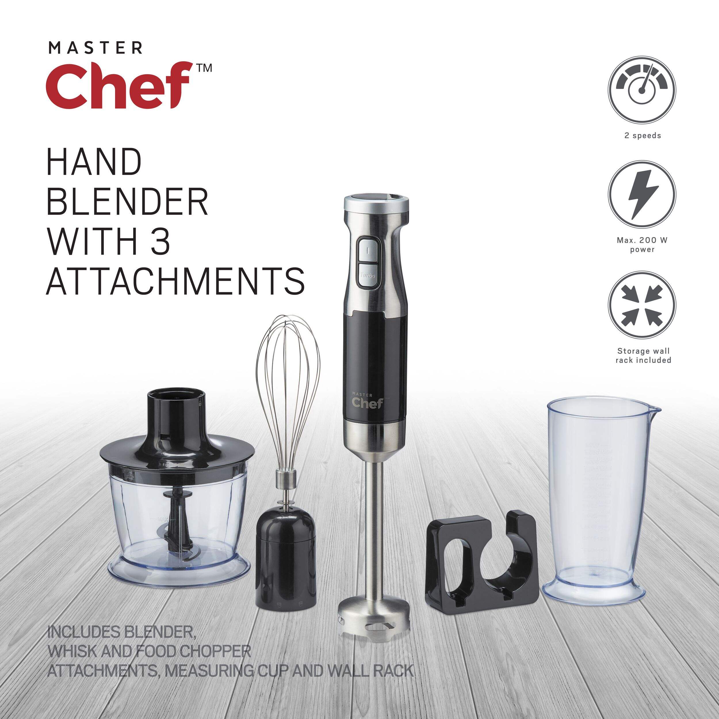 The MASTER Chef Corded Hand Blender makes it easy to whip up smoothies, soups, sauces and more. Equipped with two-speed settings with step-less variable speed, it is easy to blend, grind and chop ingredients. Plus, this immersion hand blender comes with a whisk attachment, chopper cup, and food processor bowl to make it easier to prep and complete a range of sweet and savoury recipes. A wall rack is also included with this hand mixer with a whisk attachment to keep your kitchen cupboards, counters and drawers neat and clutter-free. The stainless steel design offers a sleek look, while the detachable blending rod makes it easy to clean this hand blender after your meal. Featuring a compact design and incredible versatility, this immersion hand blender makes a great addition to any kitchen.