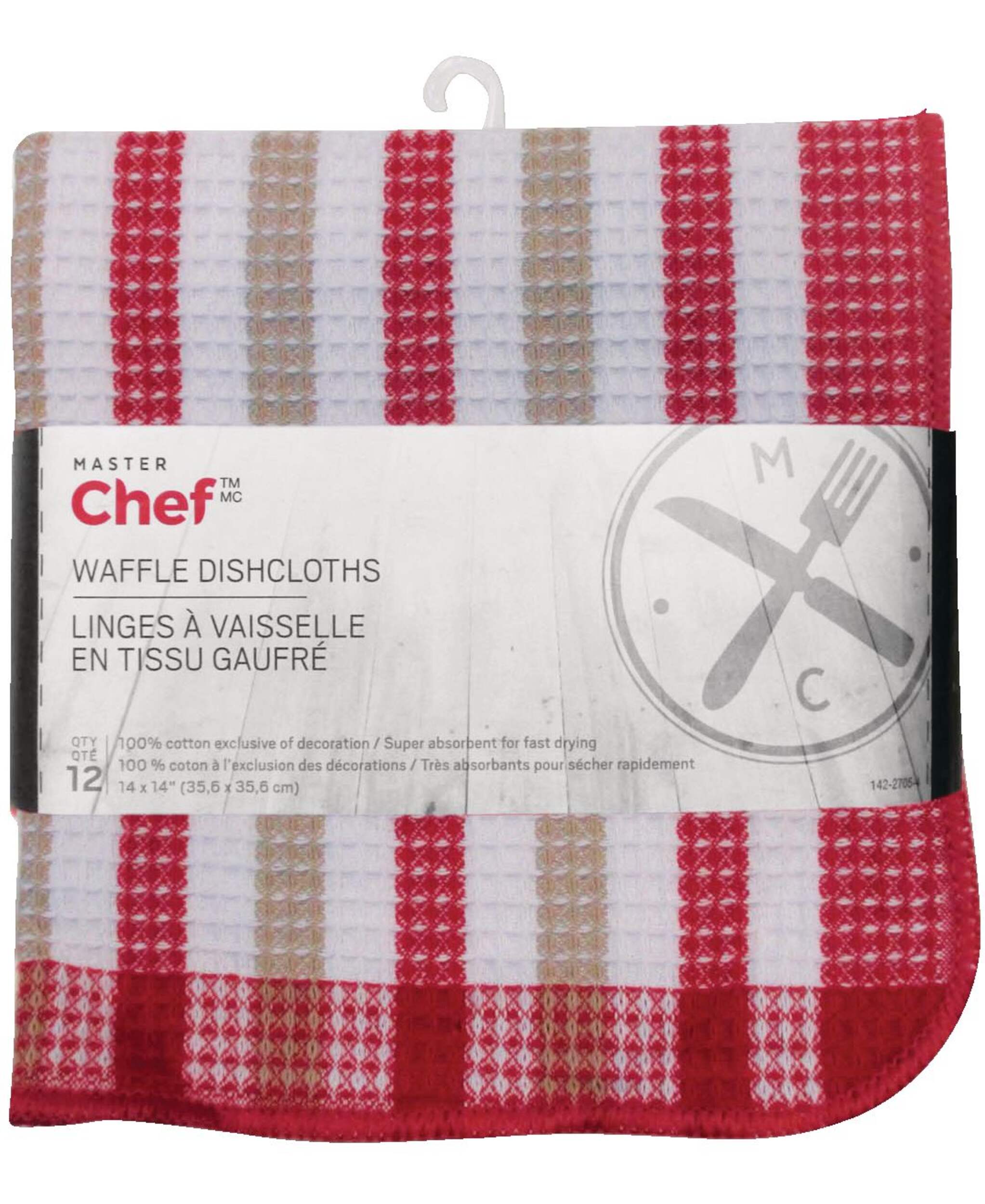 The MASTER Chef Cotton Plaid Waffle Dishcloths are a must-have for any kitchen. Made of durable and super absorbent material, they clean with less effort thanks to their rounded corners and waffle weave design. Get 12 of these cotton plaid beauties in an assortment of vibrant colours to match your kitchen decor. At 14 inches square, they're the perfect size for wiping counters, drying dishes, and absorbing spills. Add a dash of style and tons of usefulness to your kitchen with these handy dishcloths.