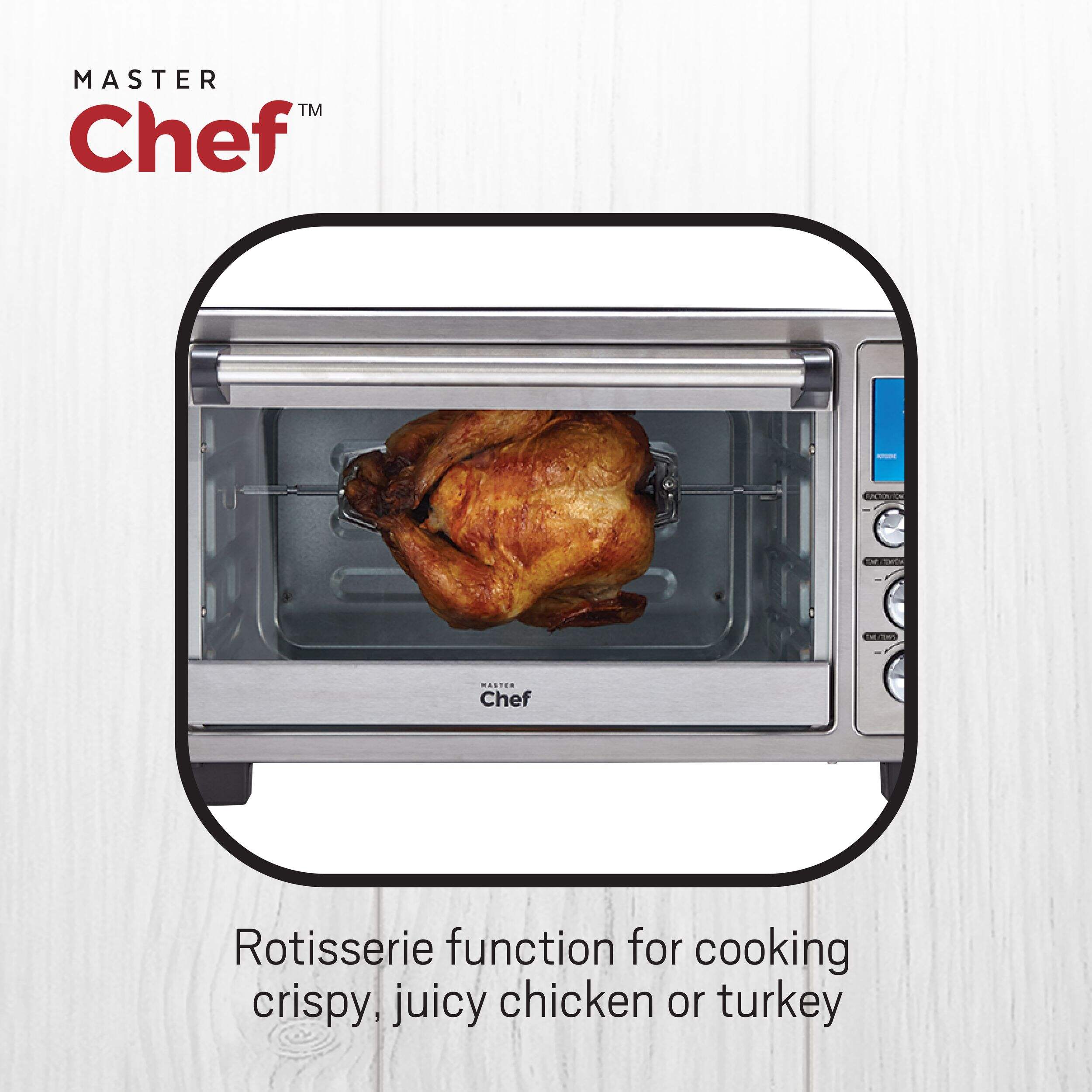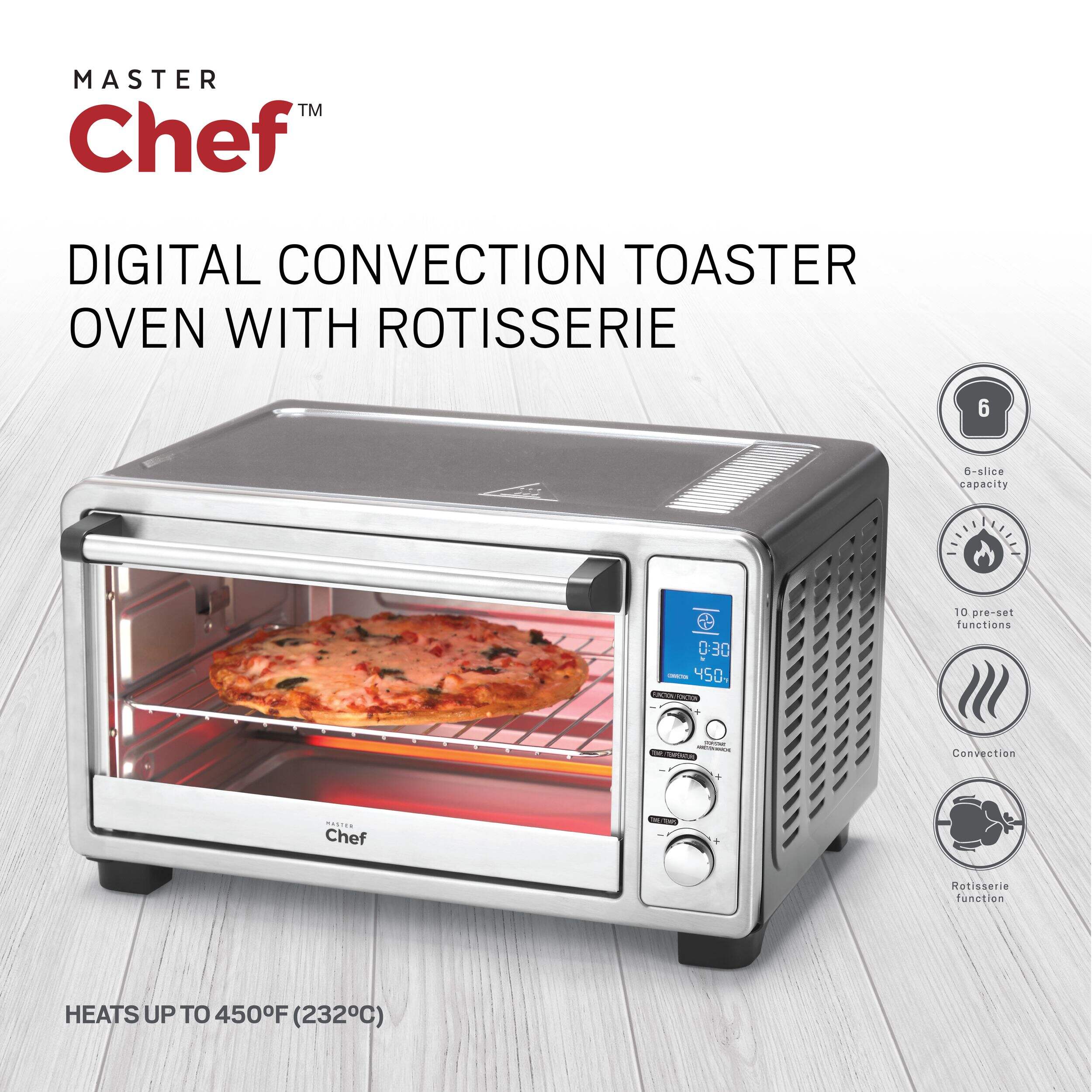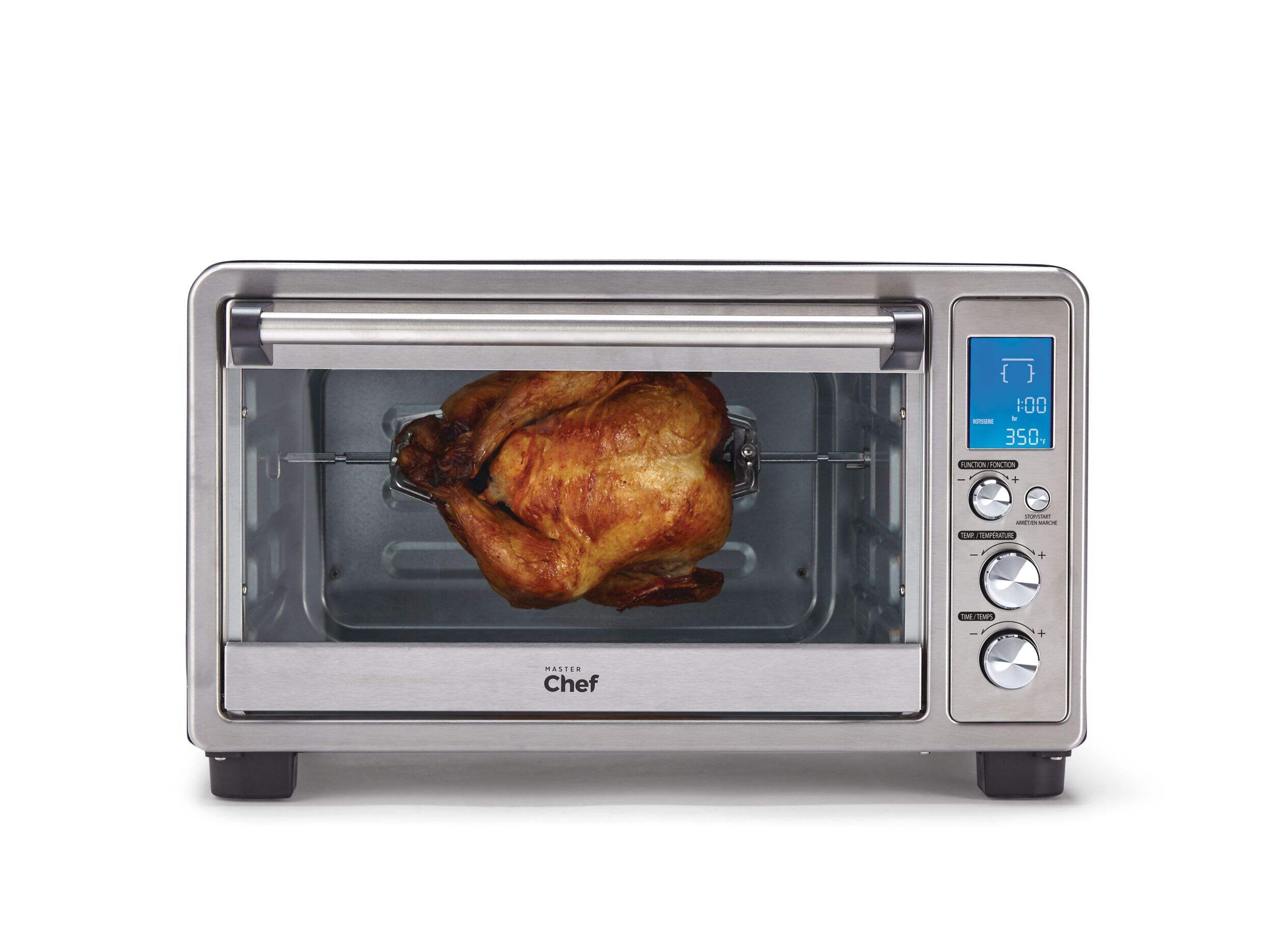 The MASTER Chef Digital Convection Toaster Oven is where style meets functionality. Its sleek stainless steel design adds a modern touch to your kitchen, while the easy-to-use digital controls and LCD display make cooking a breeze. With several pre-set menus—including bake, broil, pizza, cookies, and even rotisserie—you’ll have endless meal options at your fingertips. Convection technology ensures your food is cooked quickly and evenly, while the rotisserie function delivers perfectly crispy, juicy chicken or turkey. Whether you’re toasting, baking, or reheating, this toaster oven has you covered.