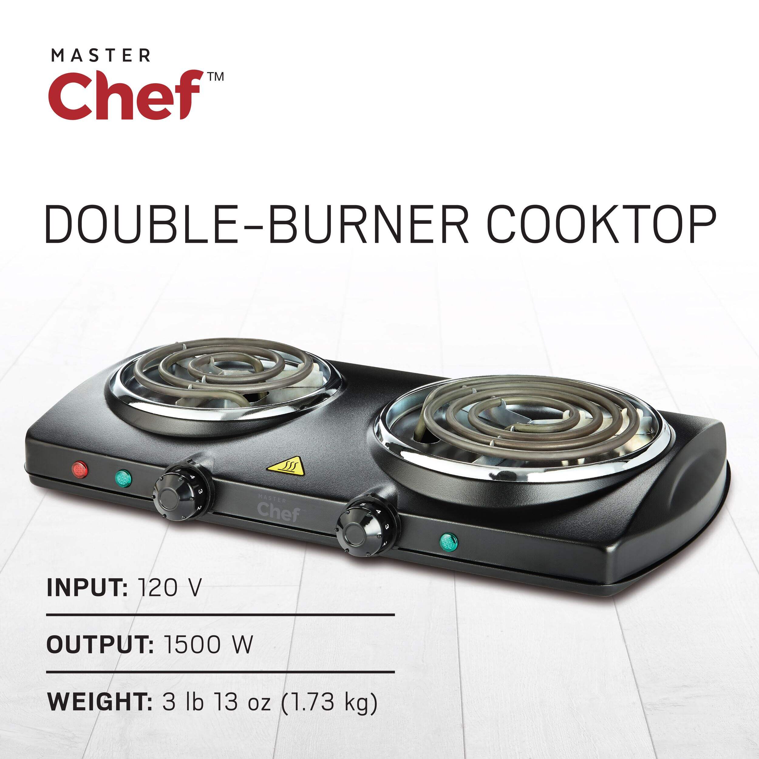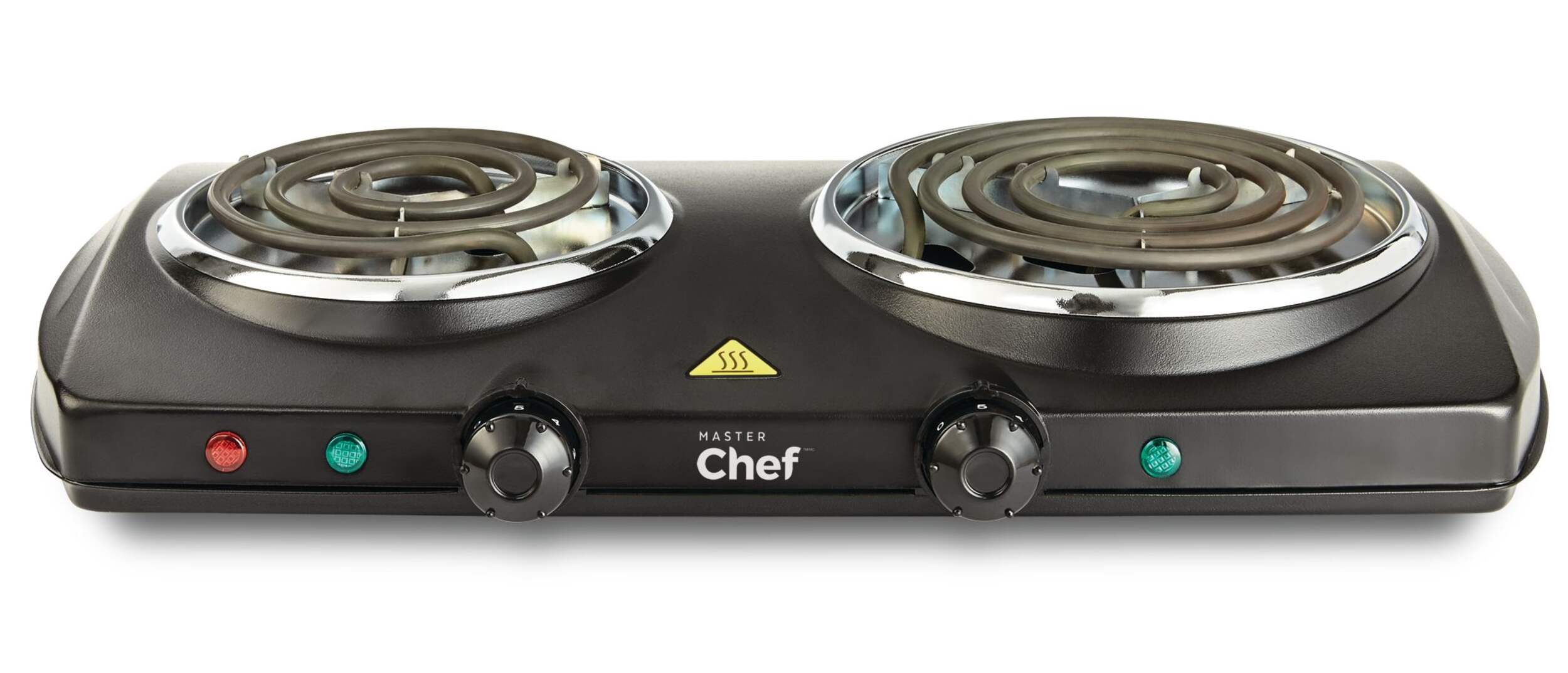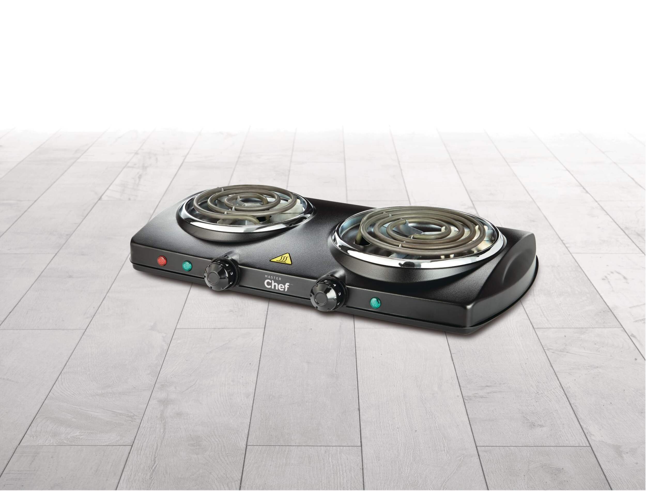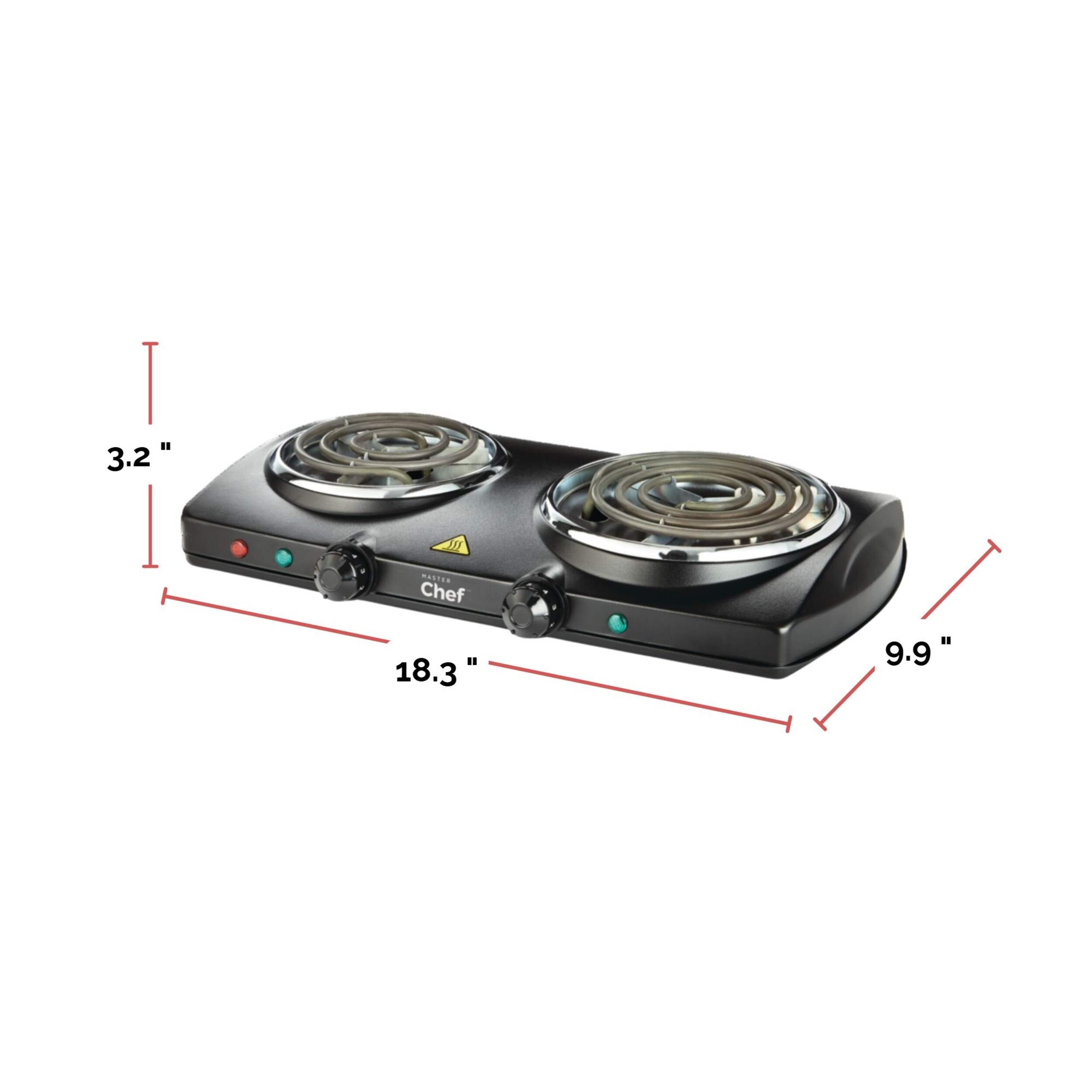 Cook anywhere you need with this conveniently designed MASTER Chef Double Burner Hot Plate. This hot plate features two elements, each with its own temperature and on/off controls, so you can cook two dishes at once or use them one at a time. The portable cooktop plugs into any standard outlet to provide extra cooking space in the kitchen, or it's great for dorms and other areas without a conventional stove.