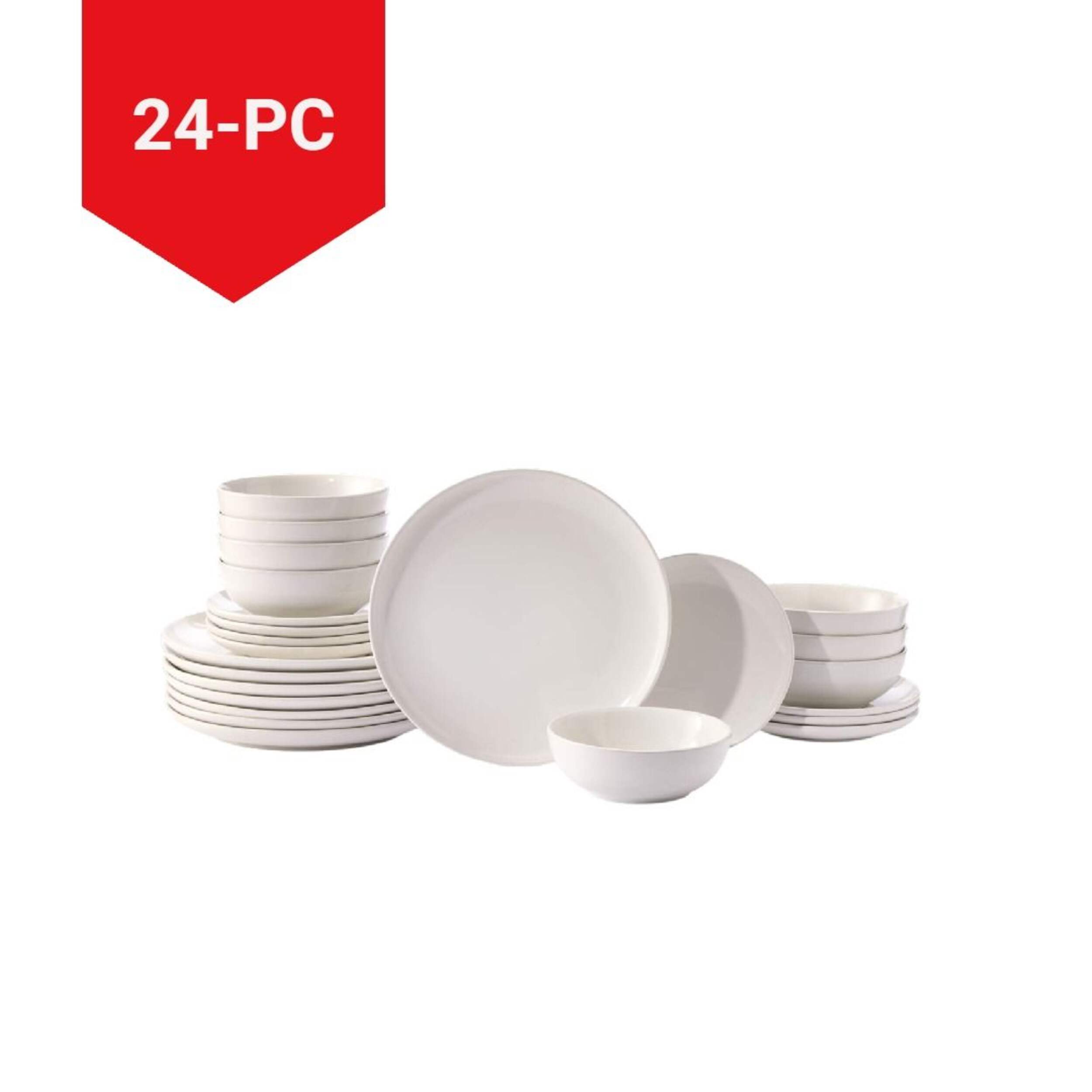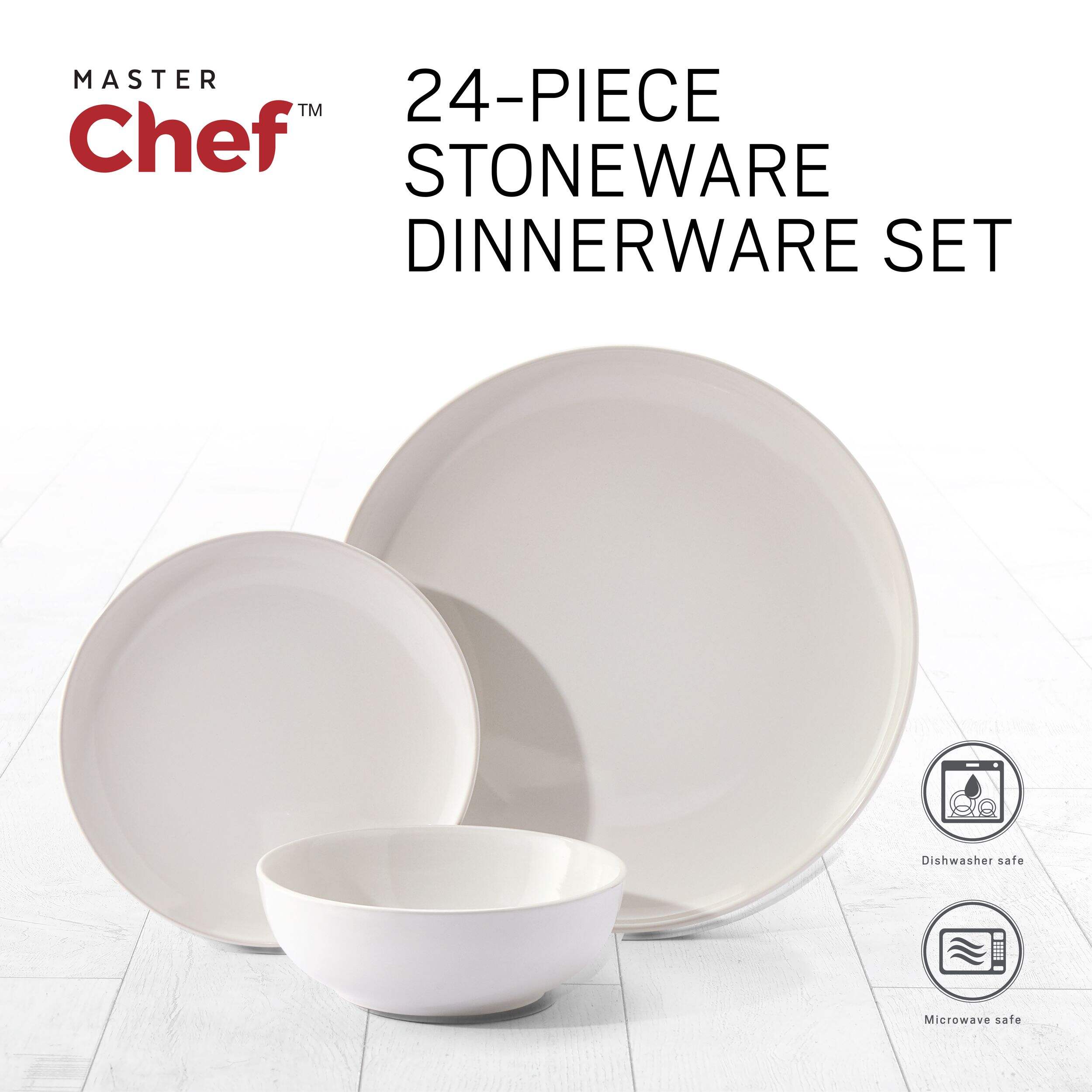 The Master Chef Essential Coupe Stoneware Dinnerware Set serves 8 with its 24-piece bright white collection. Hassle-free storage is easy thanks to the stackable design, while cleaning is a breeze – the set is dishwasher and microwave safe.
