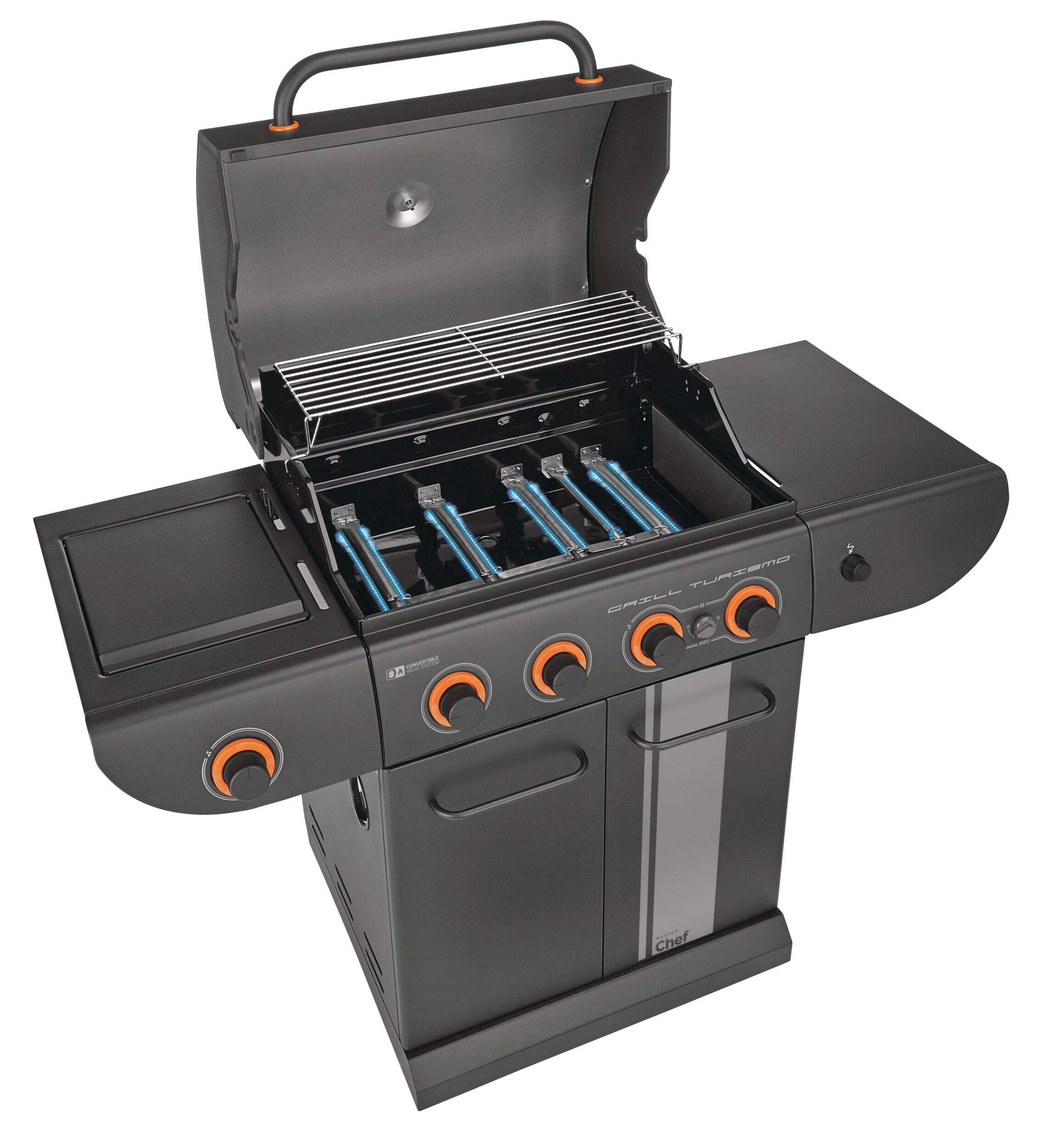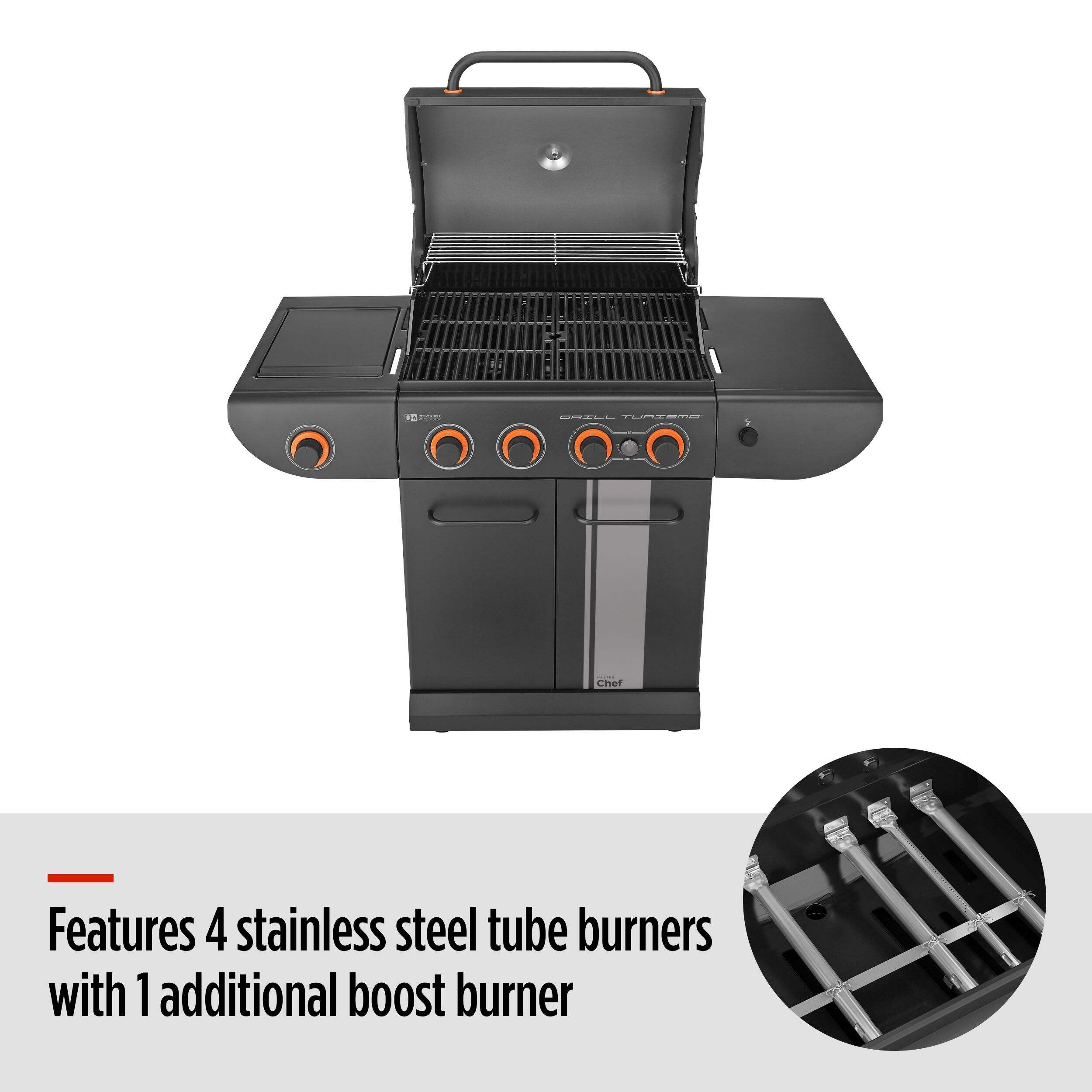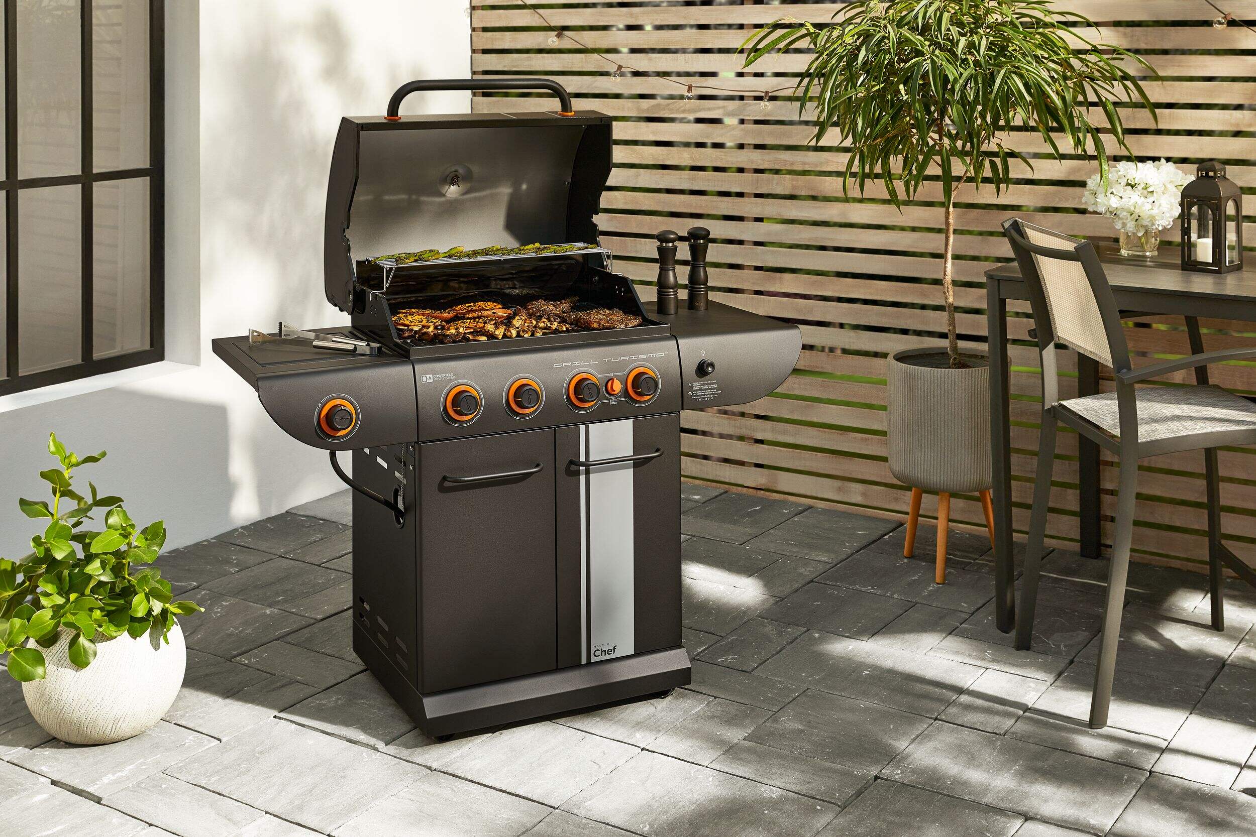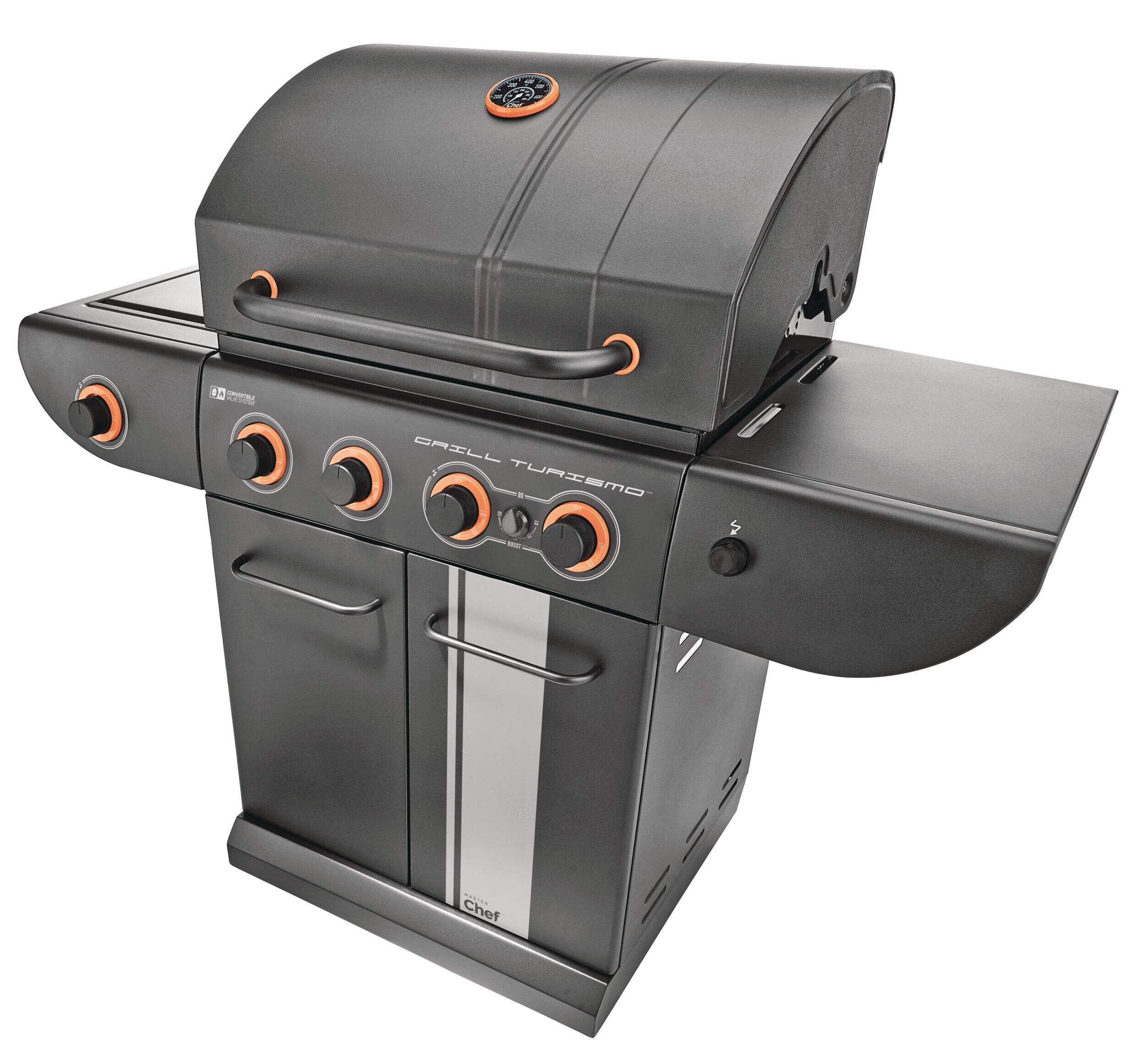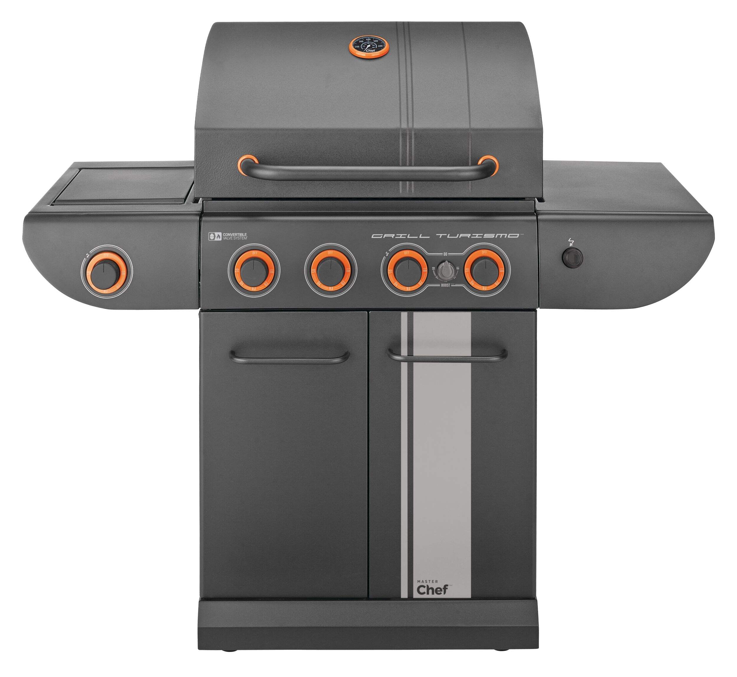 The MASTER Chef Grill Turismo™ 5-Burner Convertible BBQ with Side Burner delivers power, precision, and versatility for serious outdoor cooking. It features four main burners plus a high-intensity Boost Burner—giving you 5 burners in total—for fast searing and maximum heat when you need it. A dedicated side burner adds even more cooking flexibility. Built with durable, high-quality materials and generous grilling space, it’s designed for everyday meals and weekend gatherings alike. Enjoy consistent heat, effortless control, and flavour-packed results.
