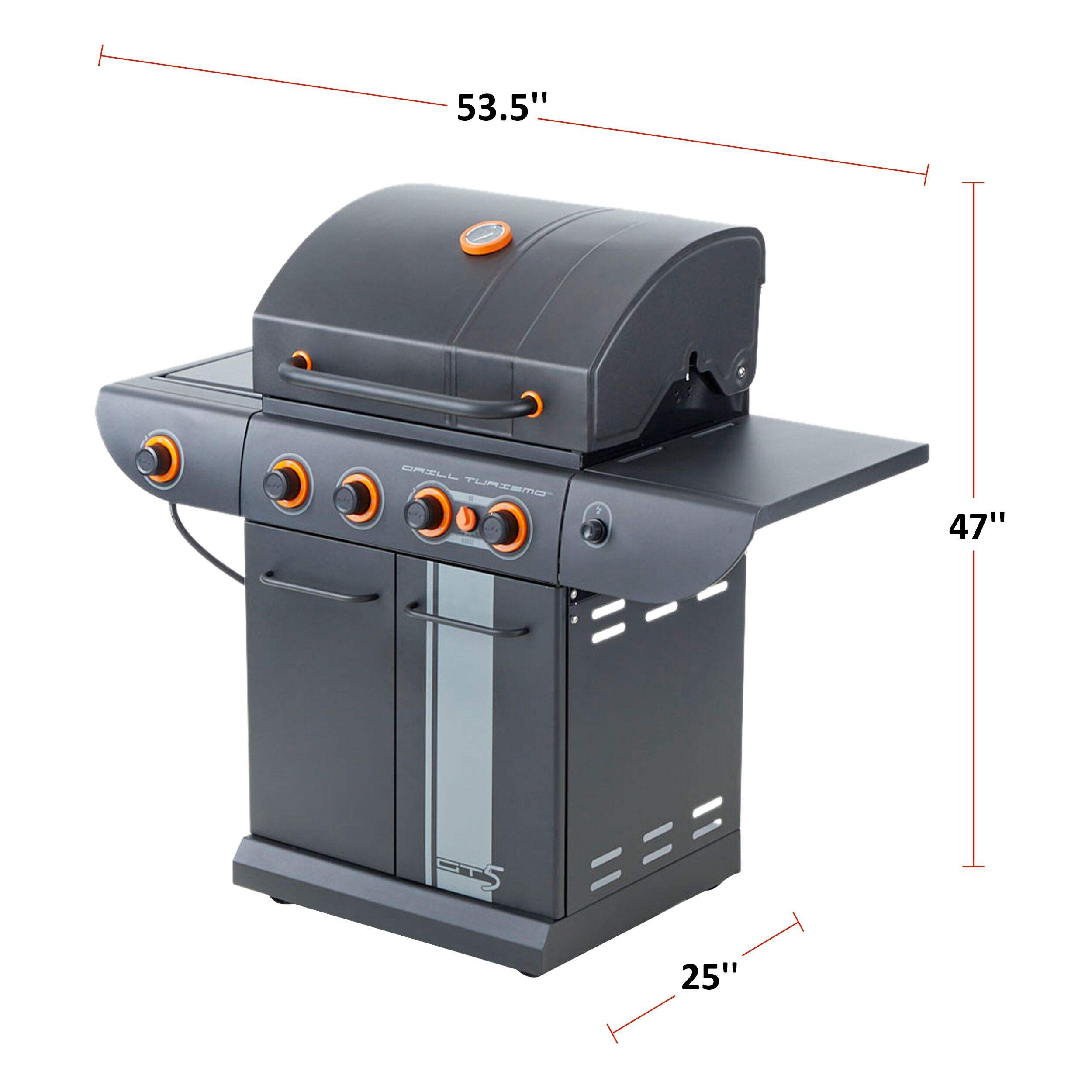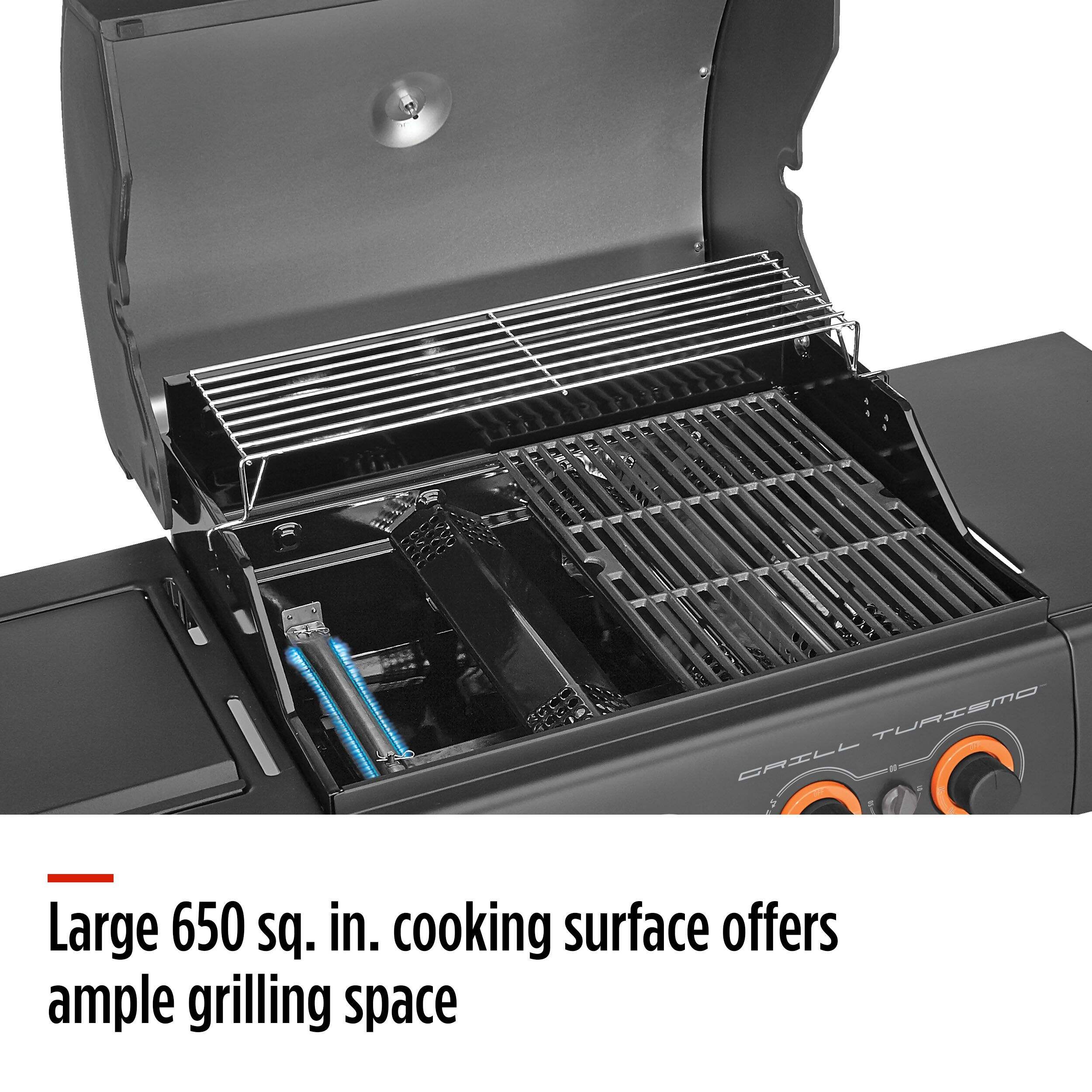 Produces up to 58,000 BTUs: 40,000 BTU main burners, 10,000 BTU Side Burner, 8,000 Boost Burner